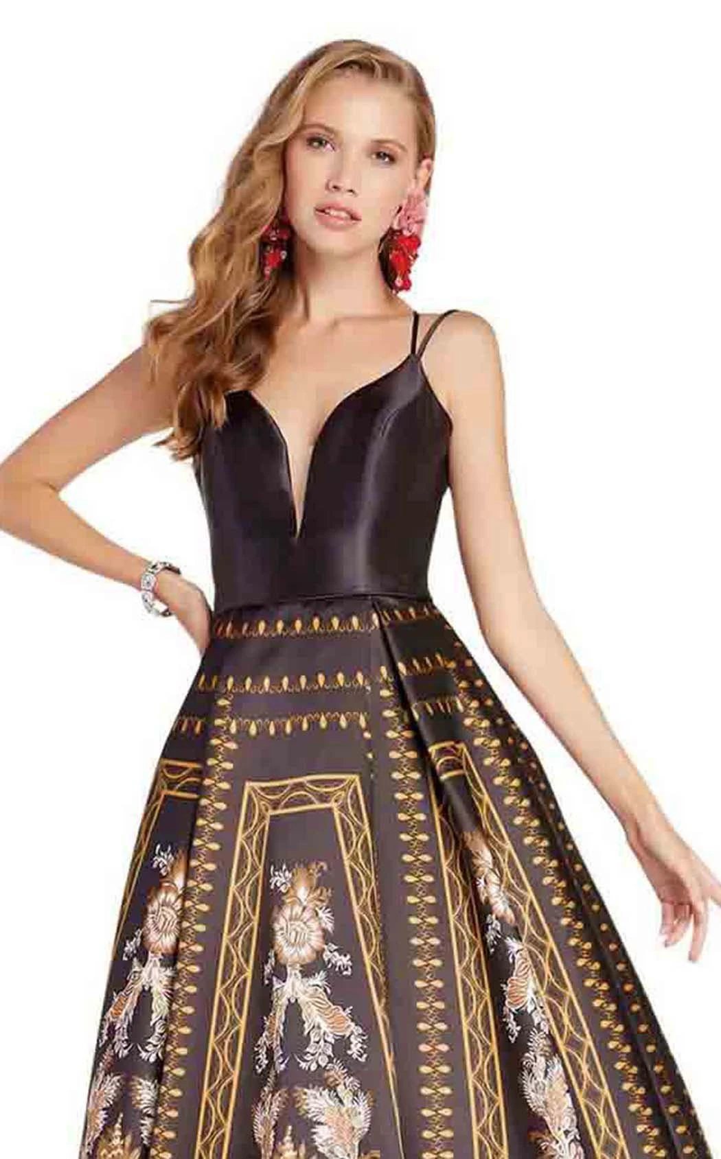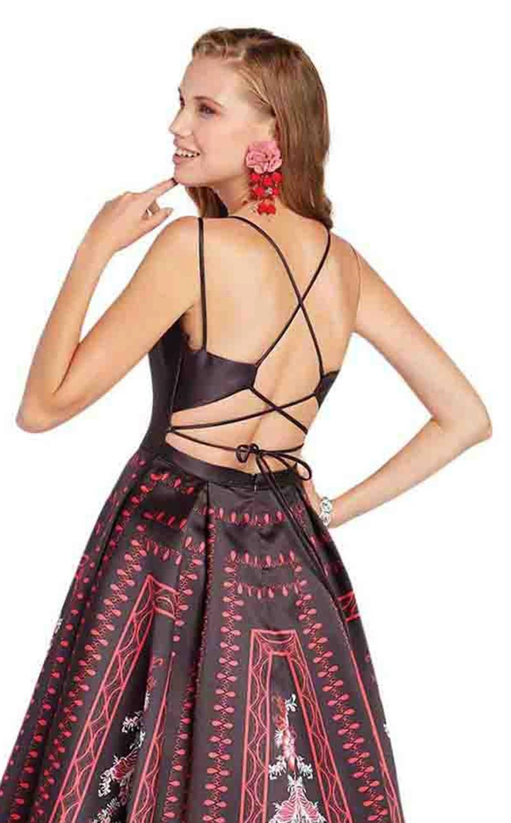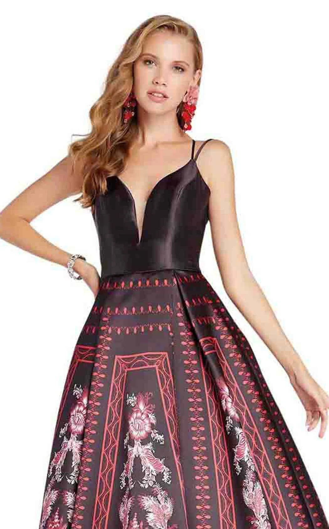 A-line ballgown with sheer inset V-neckline by Alyce ParisLook like a princess in this elegant creation by Alyce Paris! The sheer inset fitted bodice with seams and a strappy back gives this gown the perfect romantic overtone. The cerise print ballgown skirt flares from the high waistline into a graceful pleated A-line skirt with a subtle sweeping train.
