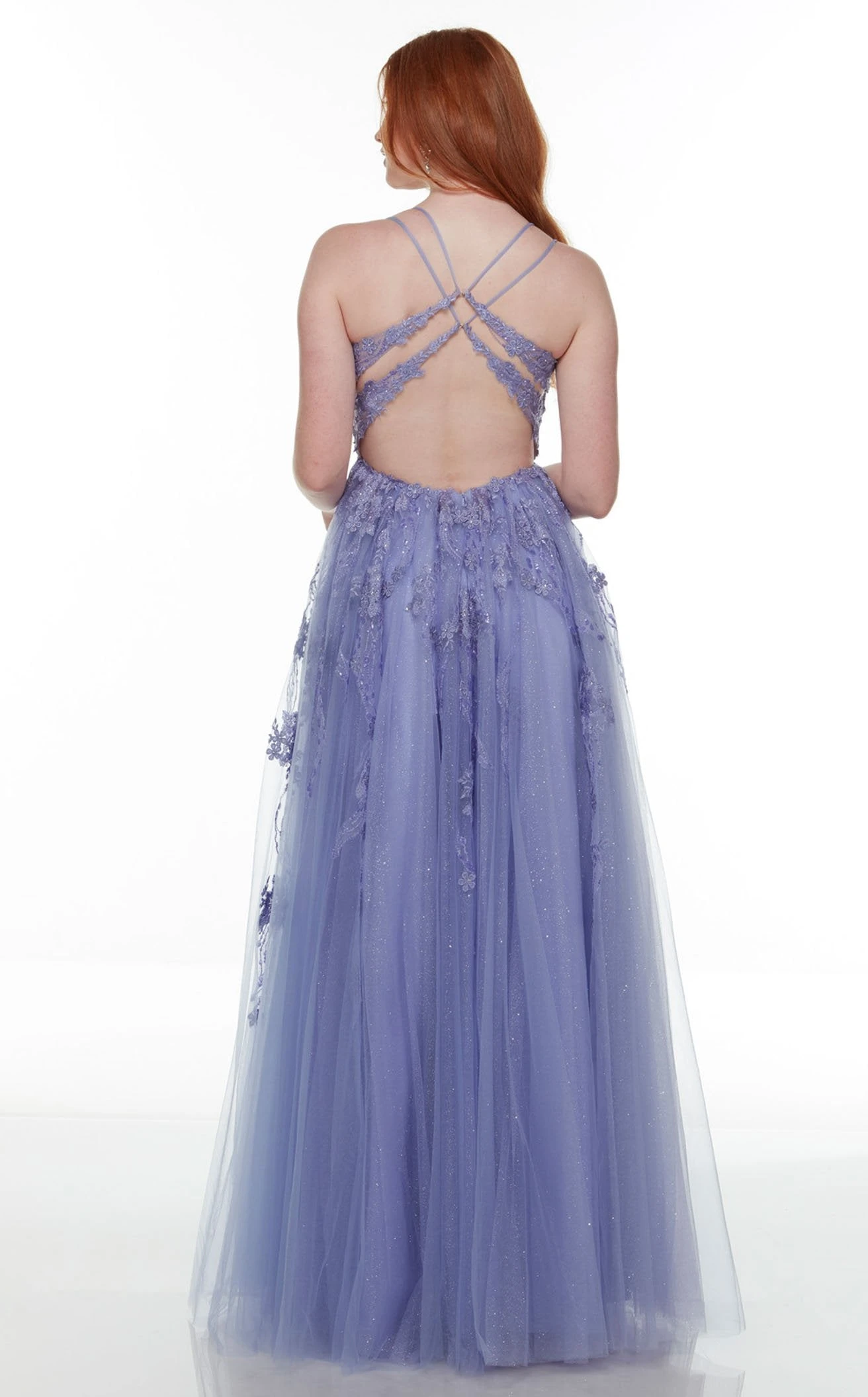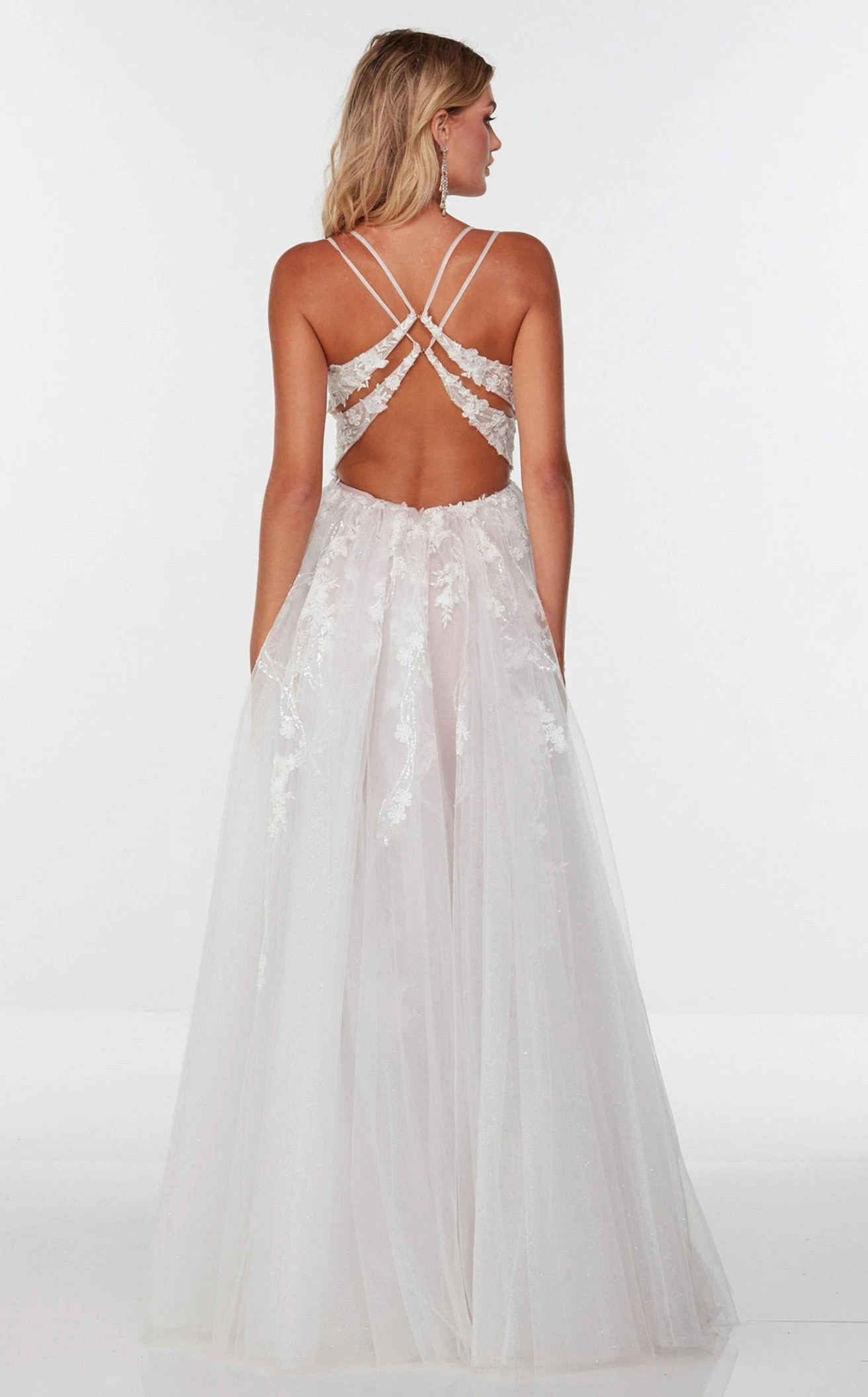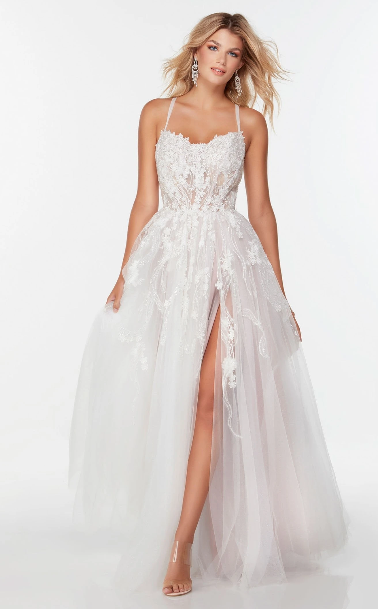 This sweetheart neck tulle lace A-line gown by Alyce 61077 would make your high school prom night memorable for years to come. A strappy back and double spaghetti strap complemented with an illusion bodice, this is a truly magnificent gown with a fit and flare skirt that has a sexy long front slit. Complement this dress with a pair of nude d’Orsay.