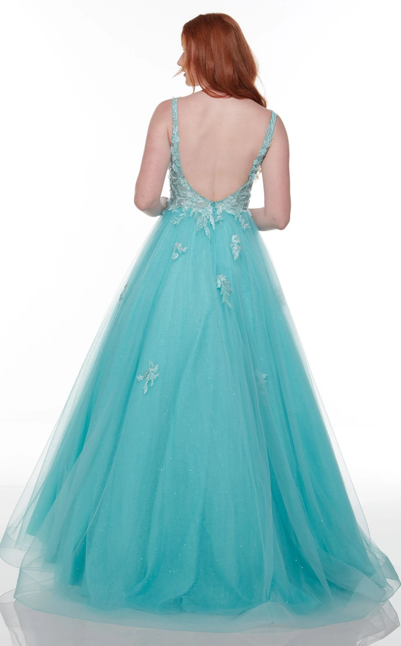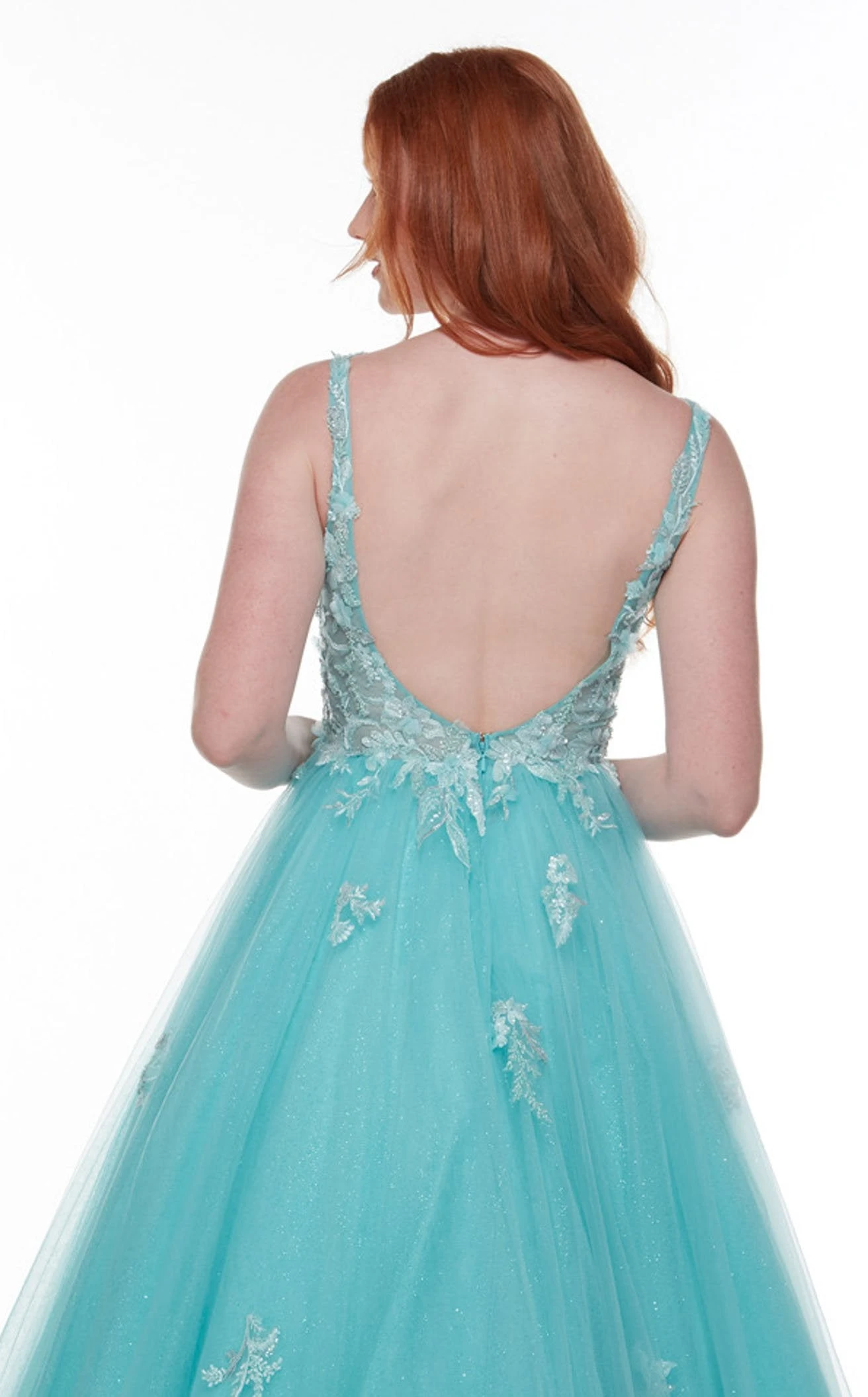 Make a bold statement in this beautiful backless ballgown by Alyce 61105. This fitted bodice features in a plunging V-neckline and is backless to make you feel like the bold woman you are. Show a titillating bit of sexiness in the illusion, netted fabric that creates an illusion of bare skin, while still being secure and supportive. An A-line tulle lace is gradually flared to the floor from over the waistline.