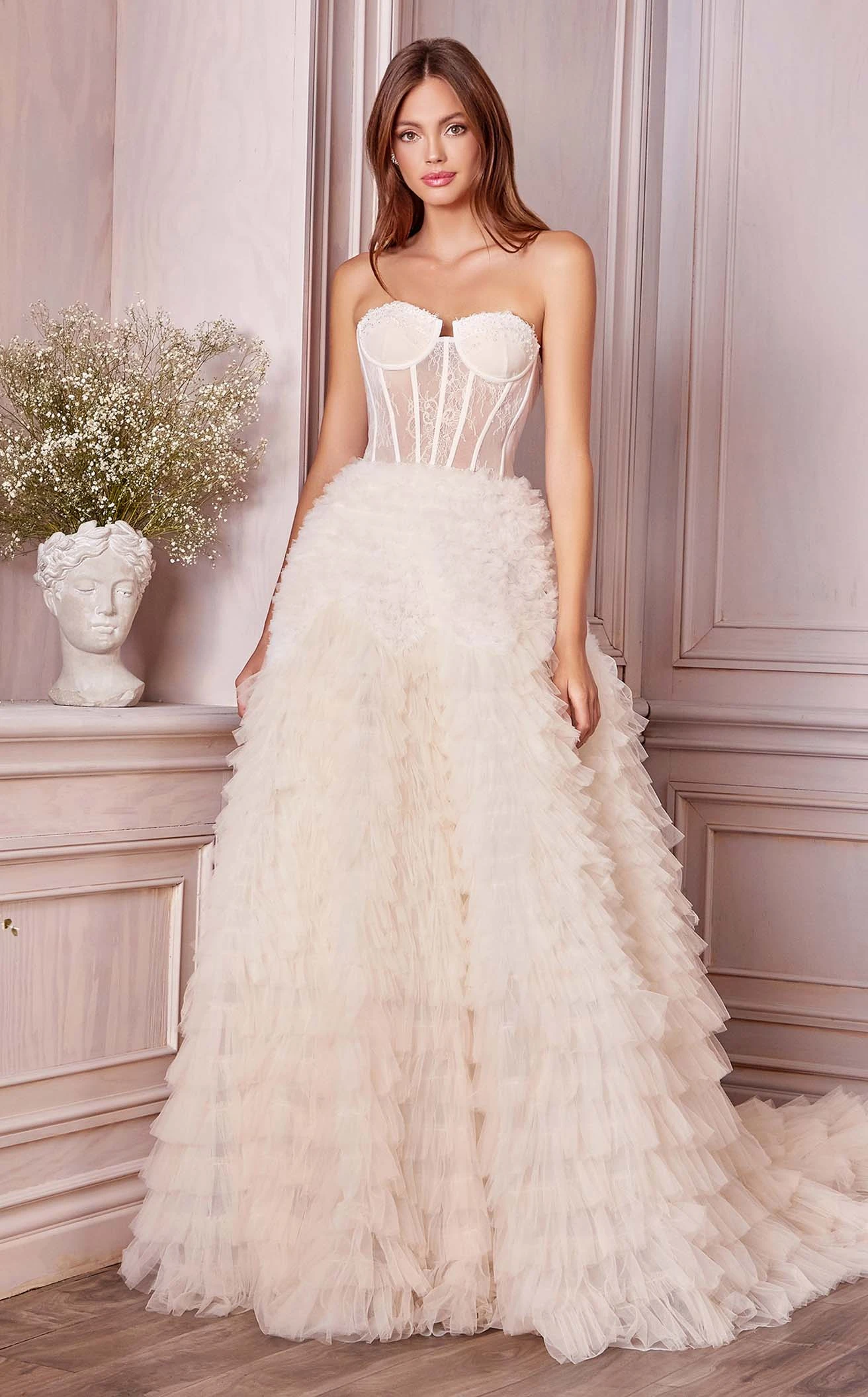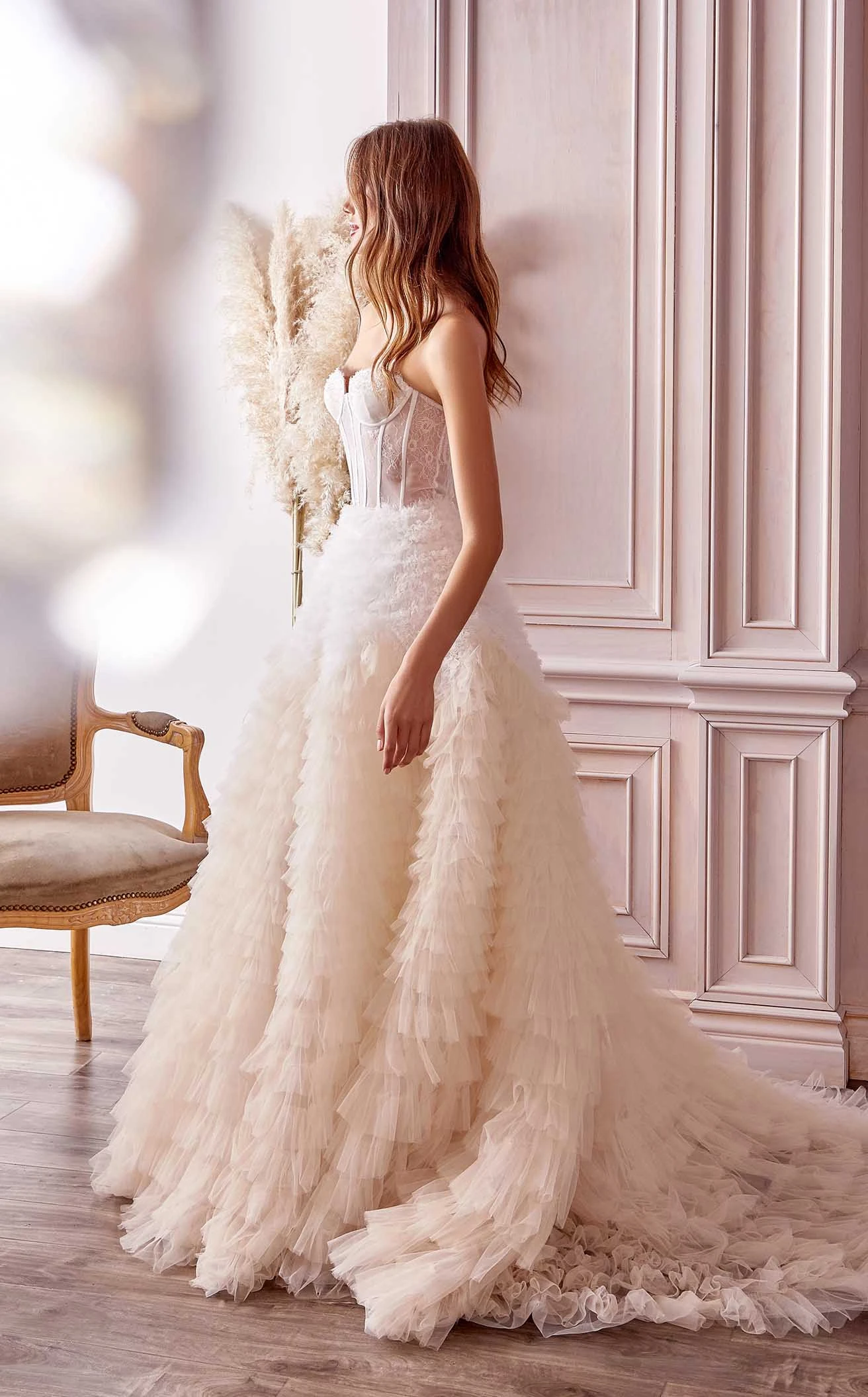 Look amazingly beautiful in Andrea and Leo A0767W Dress. This fantastic dress features a A-Line silhouette and Lace & Embroidery embellishments. This Long dress has a Sleeveless Strapless bodice and No slit.
