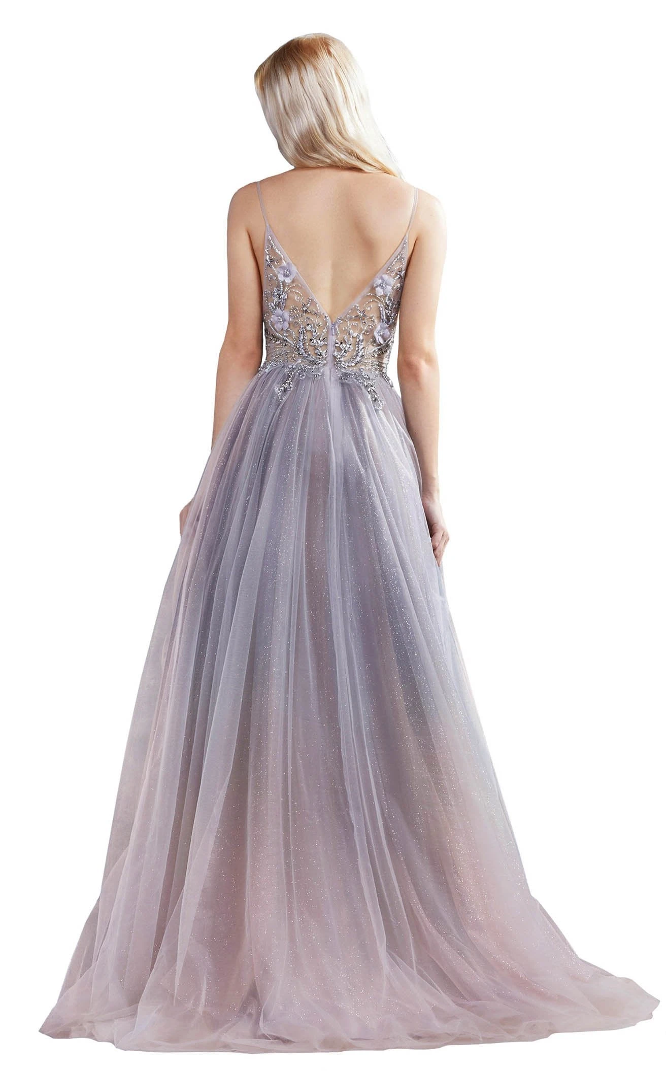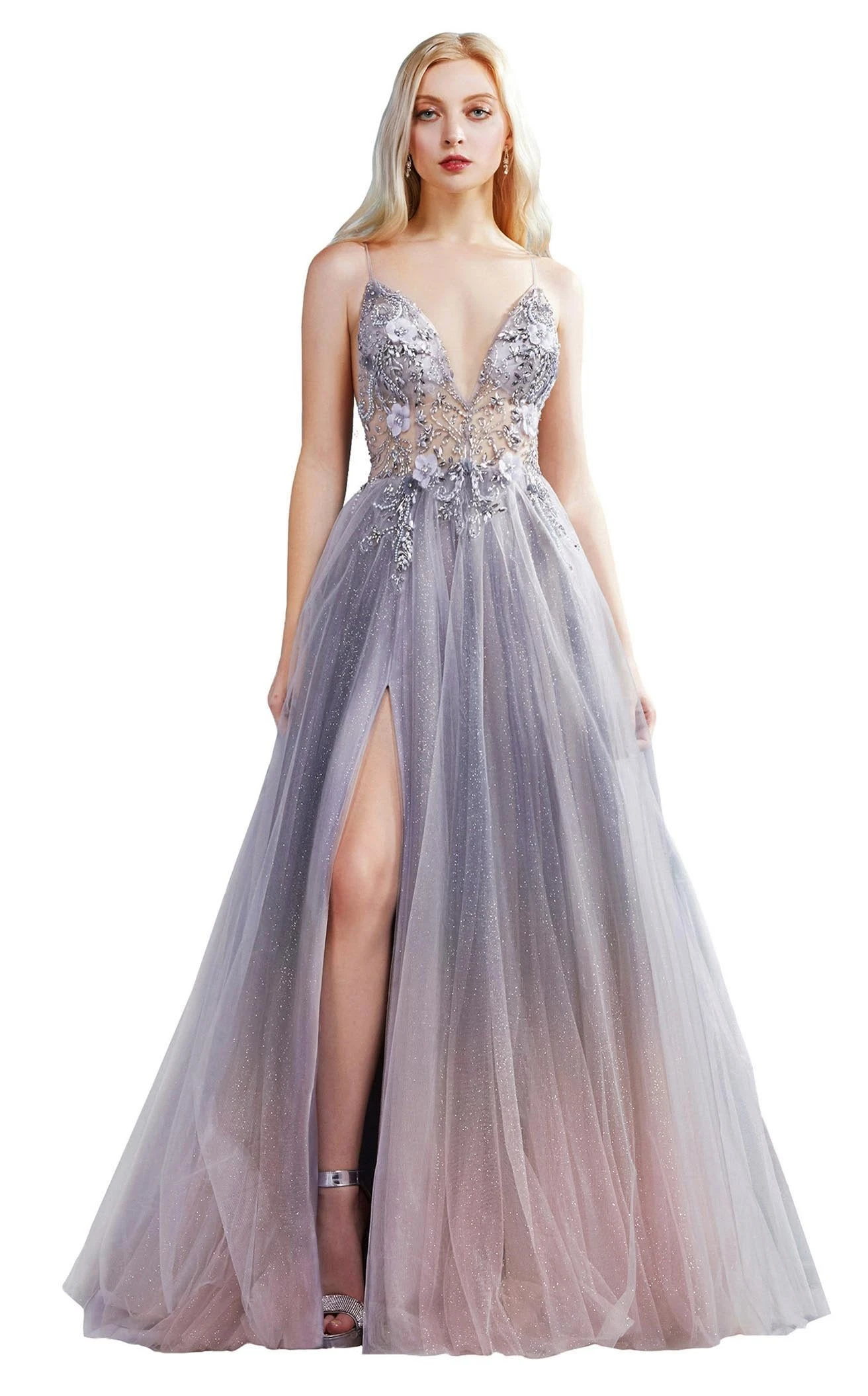 Flowers and beading on the bodice of this gown by Andrea & Leo add a wonderful overlay to the sheer fabric. Spaghetti straps lead to a deep v-neckline, a subtle way to elongate the torso for a more flattering silhouette. The ombre skirt is made with layers of sparkling sheer fabric and has a thigh high slit.
