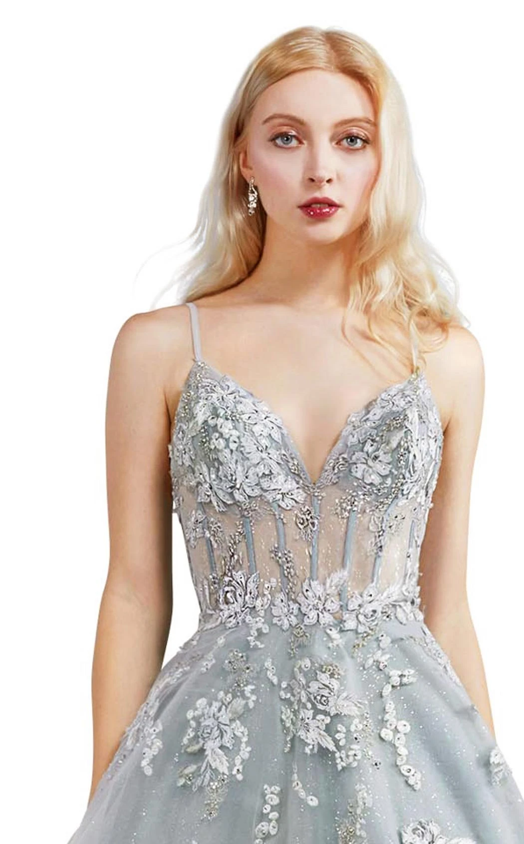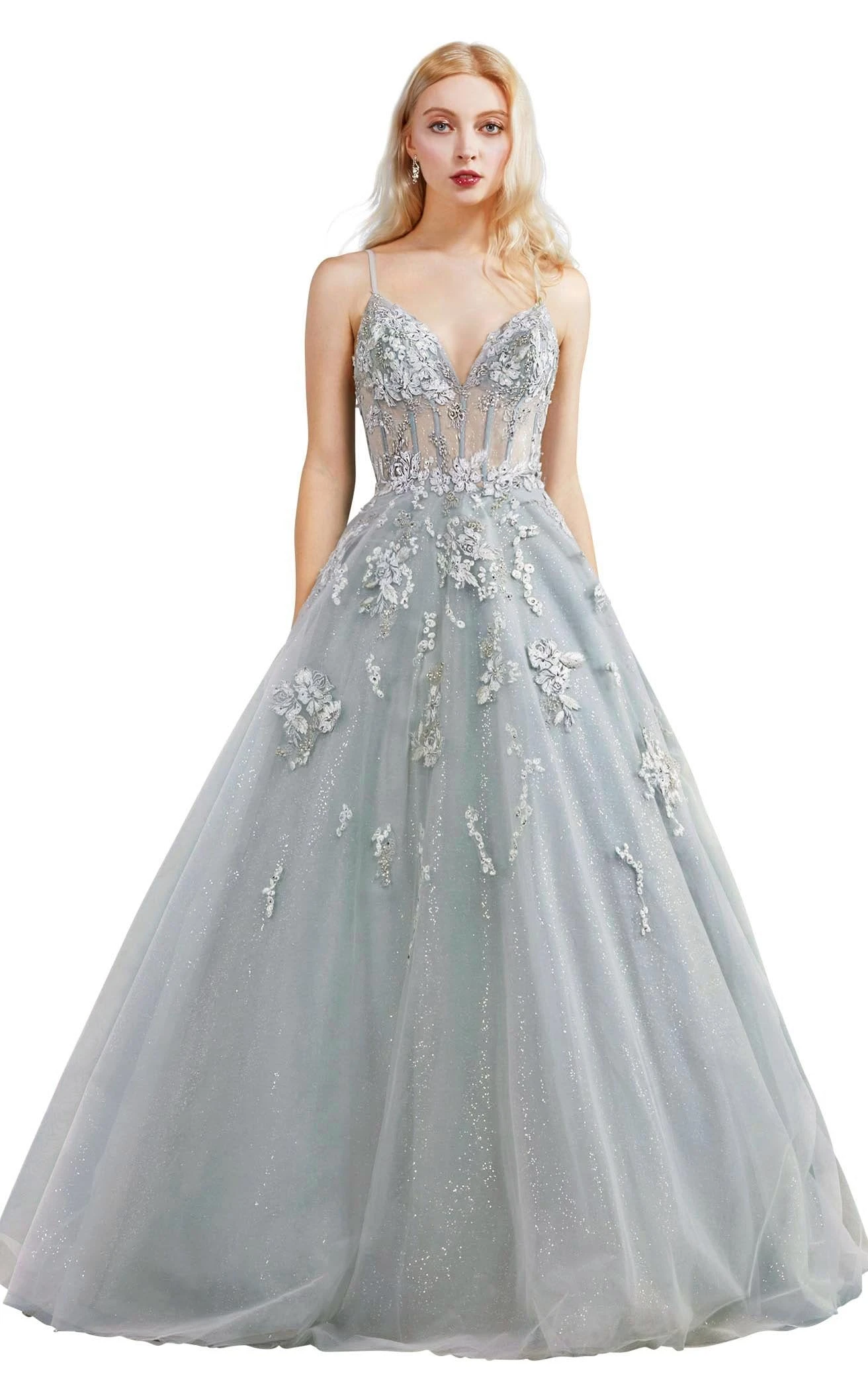 Make a glam statement and rock this dreamy creation from Andrea and Leo A0892. The fitted bodice has a sleeveless design with V-neckline and spaghetti straps. Beautiful floral appliques with bead details display an eye-catching look. Cinched at the waist, the ballgown silhouette skirt flutters and flourishes in layers of tulle to the floor-length and ends with a sweep train.