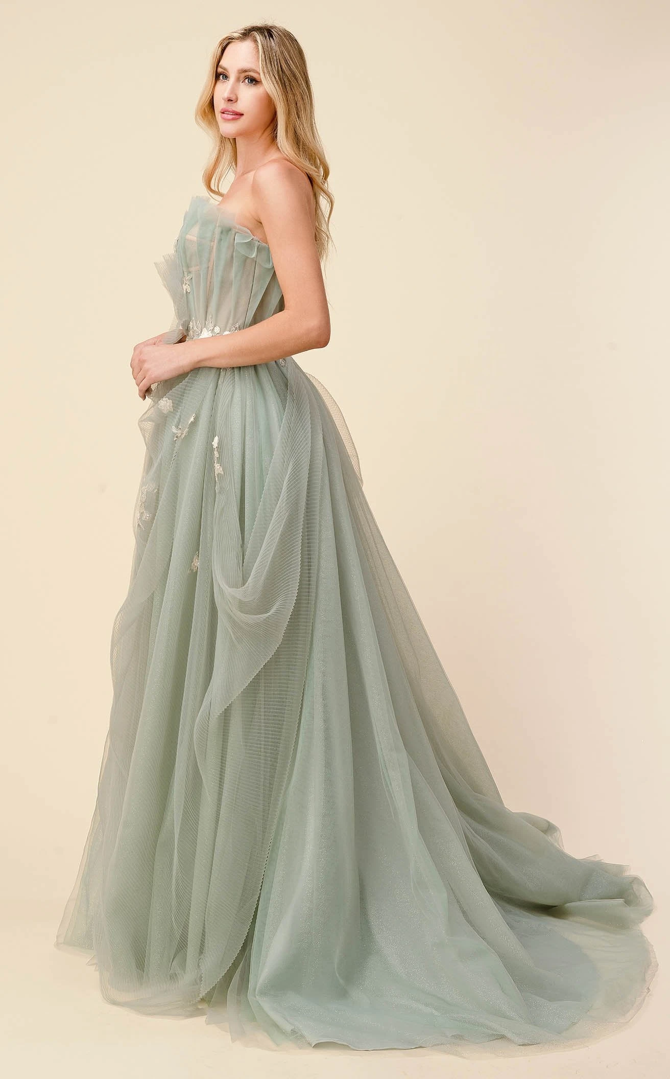 Look absolutely wonderful in Andrea and Leo A1015 Dress. This gorgeous piece features a a-line silhouette and glittering accents. The sleeveless bodice has a strapless neckline and a natural waist.