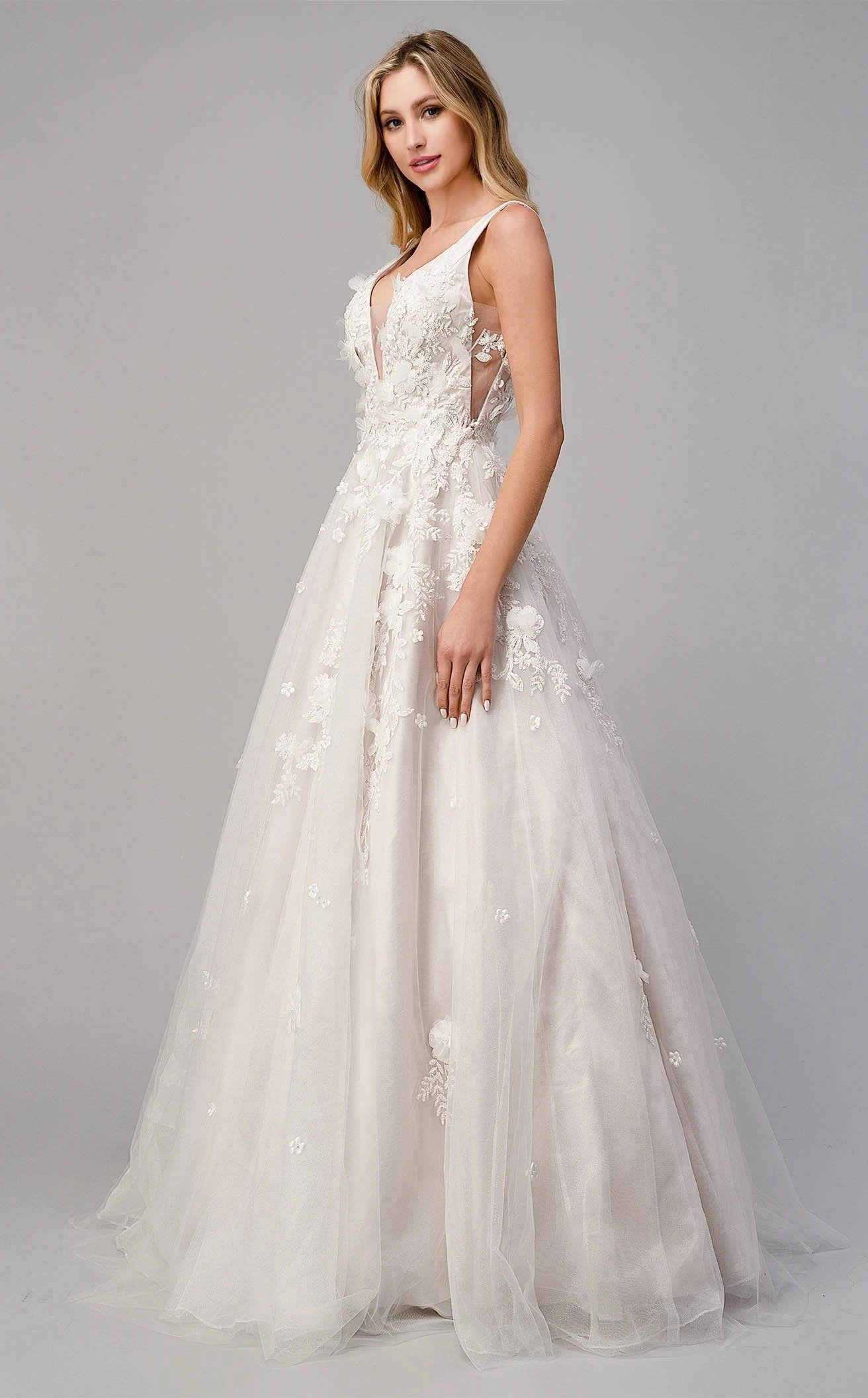 Look absolutely exquisite in Andrea and Leo A1028W Dress. This marvelous piece features a a-line silhouette and glittering accents. The sleeveless bodice has a v-neck neckline and a natural waist.