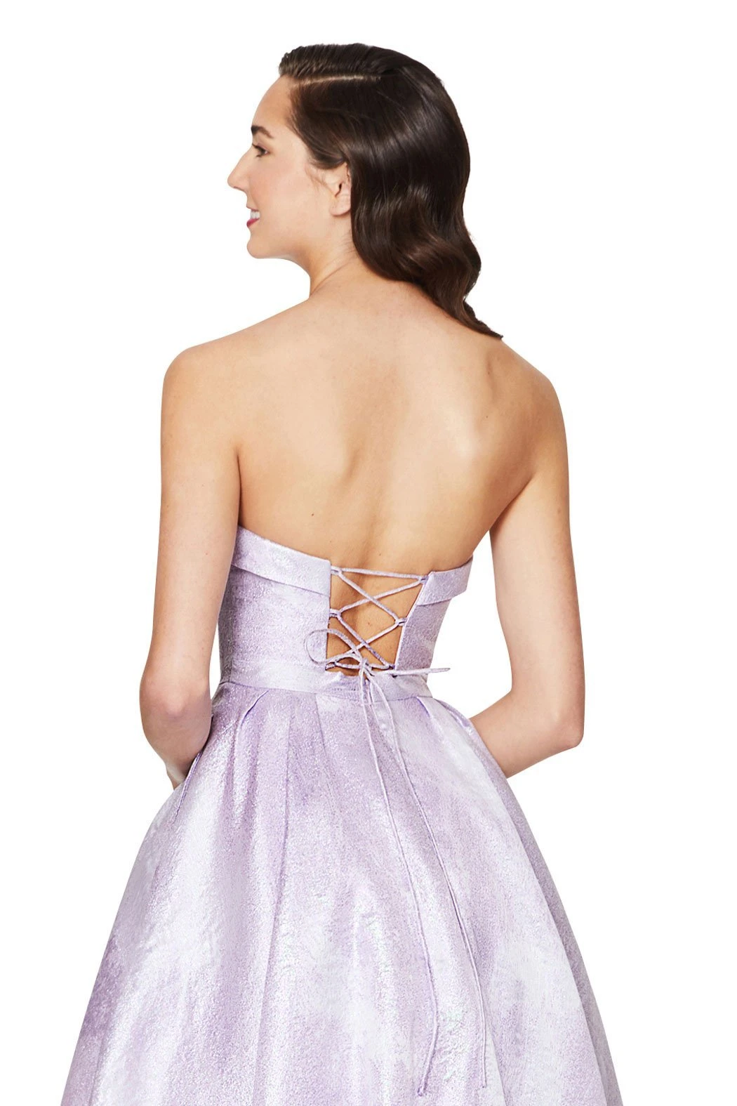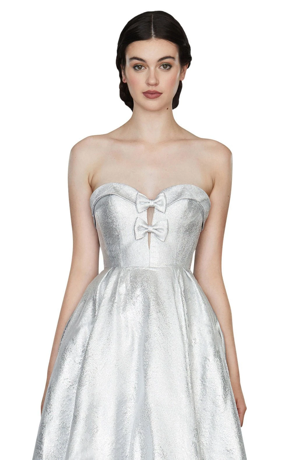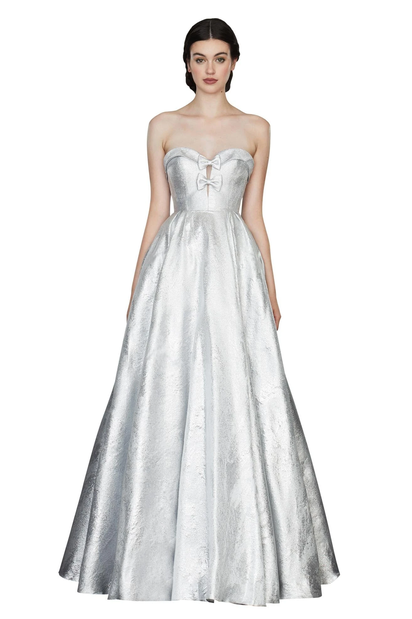 Angela and Alison bring a trendy feel to formalwear with this fantastic evening gown. Strapless this dress has a structured bodice with bows down the center. This gown has a nipped waist and pronounced A-line skirt with full length hem. A subdued print works throughout gown.