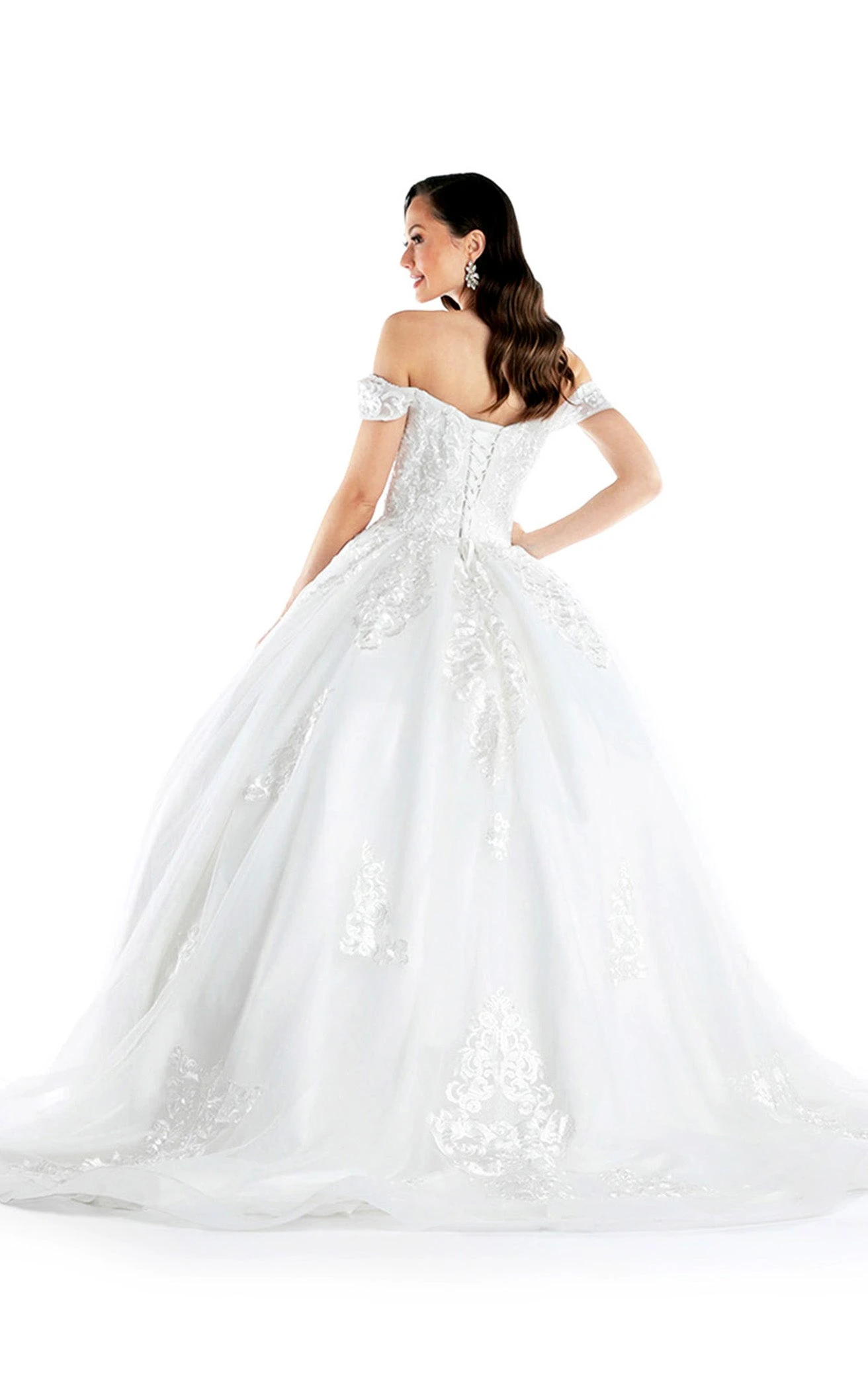 This alluring, elegant, and ethereal lace gown from Anny Lee is the perfect choice for any special occasion. It is made of a stunning tulle fabric that is sure to capture the attention of any onlooker. The bodice of this exquisite lace wedding dress is covered in a flattering corset waistline that will accentuate the hourglass shape of your body.
