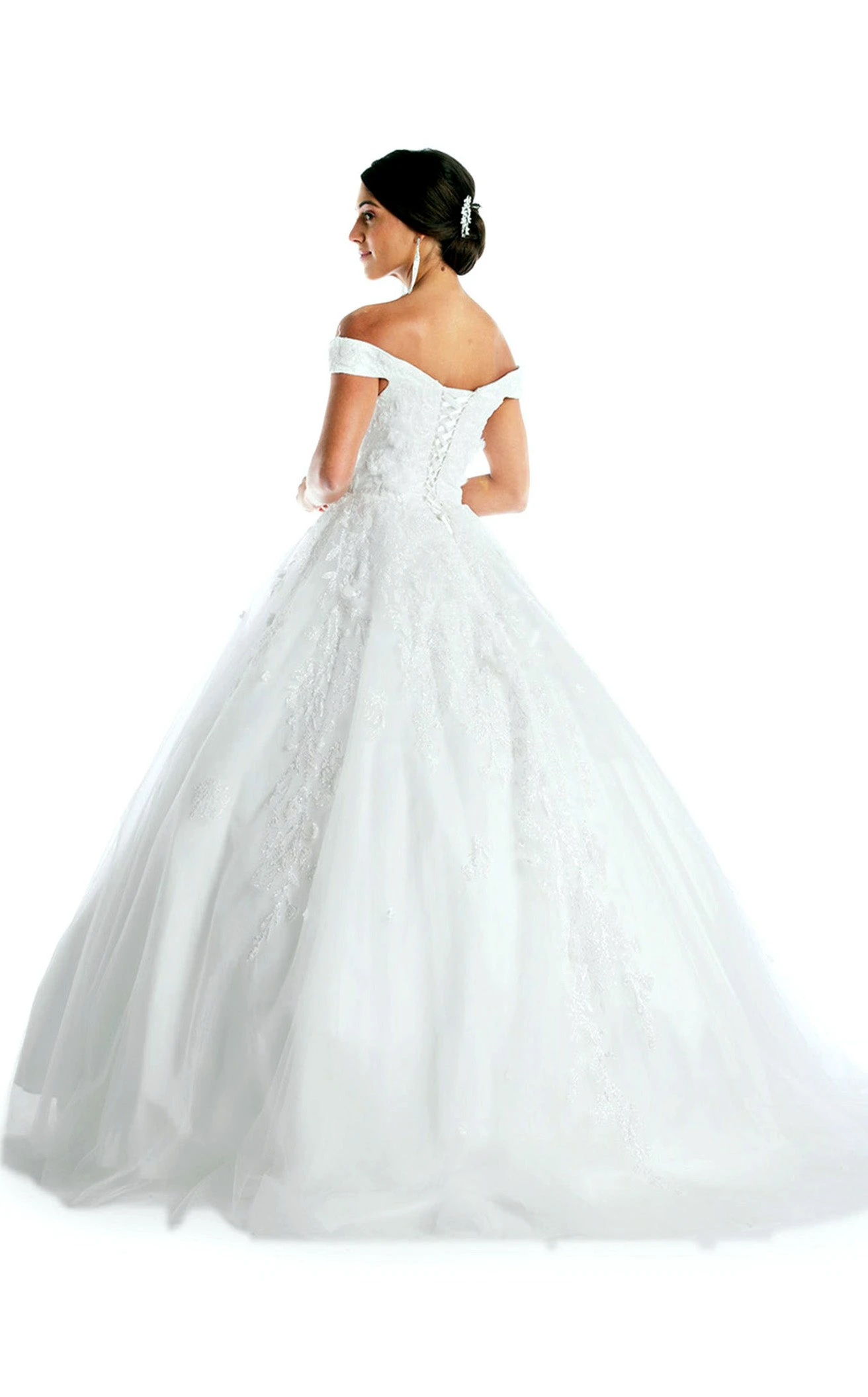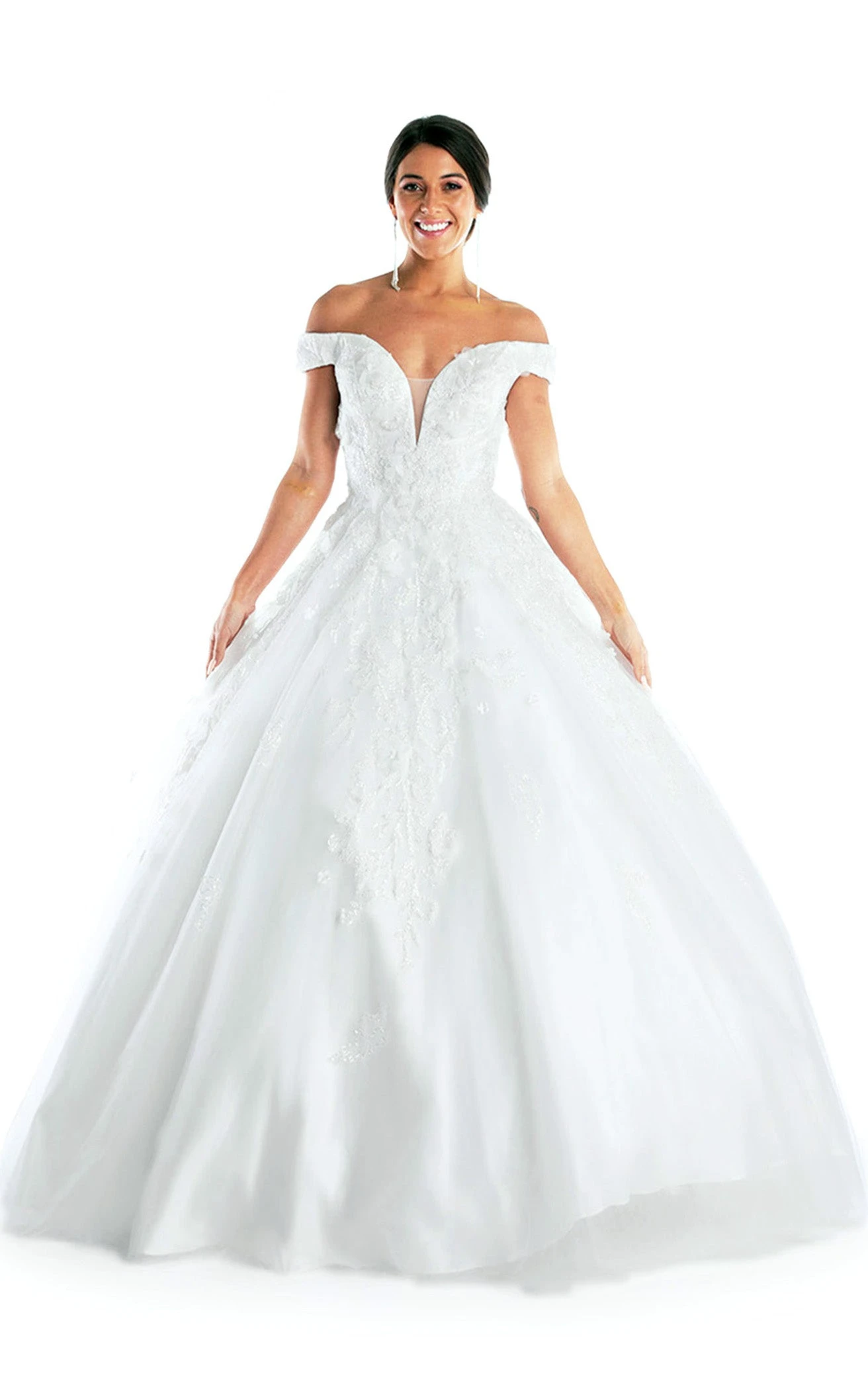 Off Shoulder Sleeve Sheer Plunging Neckline Floral Embroidered A-line Dress by Anny Lee