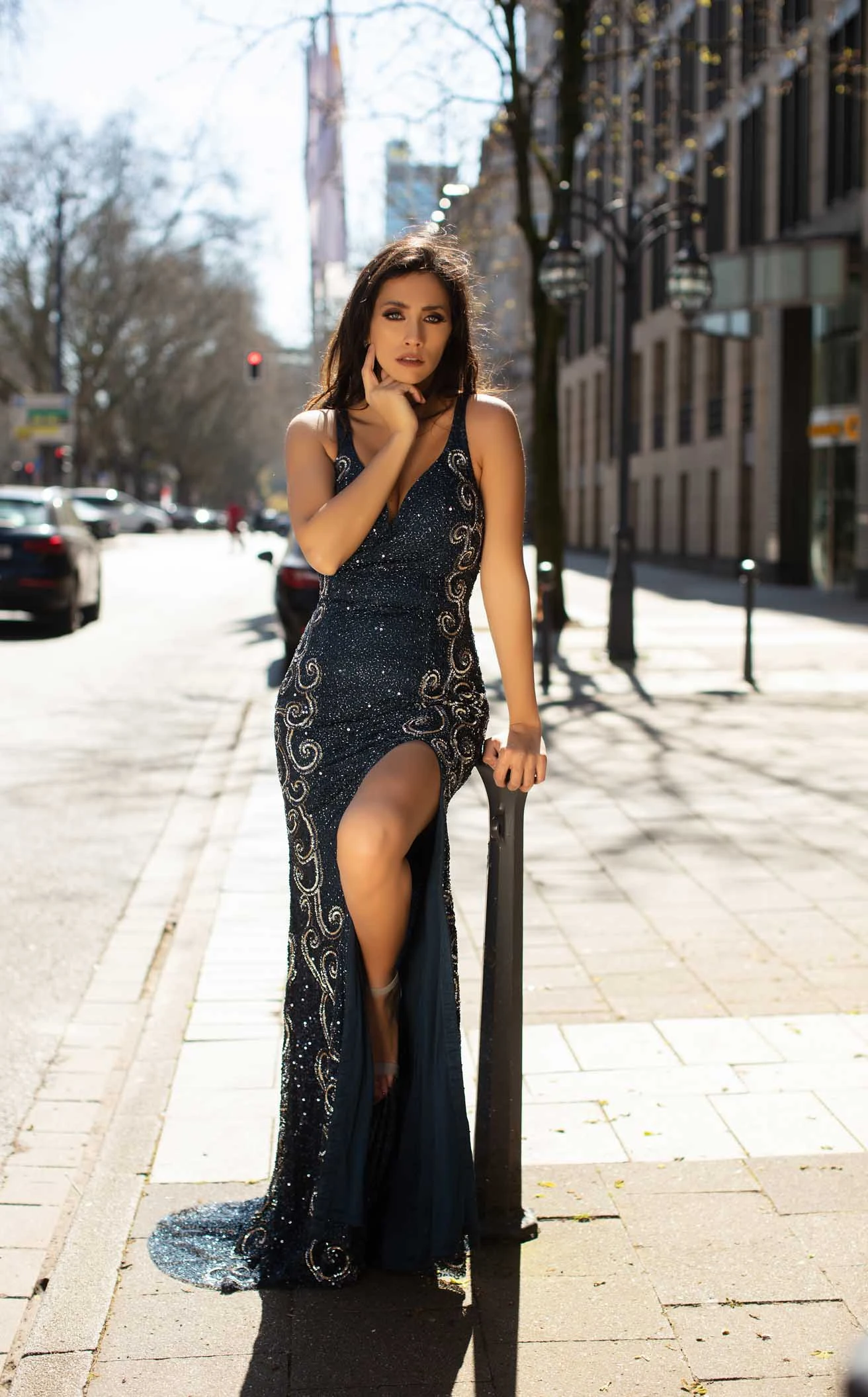 Look absolutely magnificent in Chic and Holland AN1406 Dress. This beautiful piece features a column silhouette and fully sparkling. The sleeveless bodice has a v-neck neckline and a natural waist.