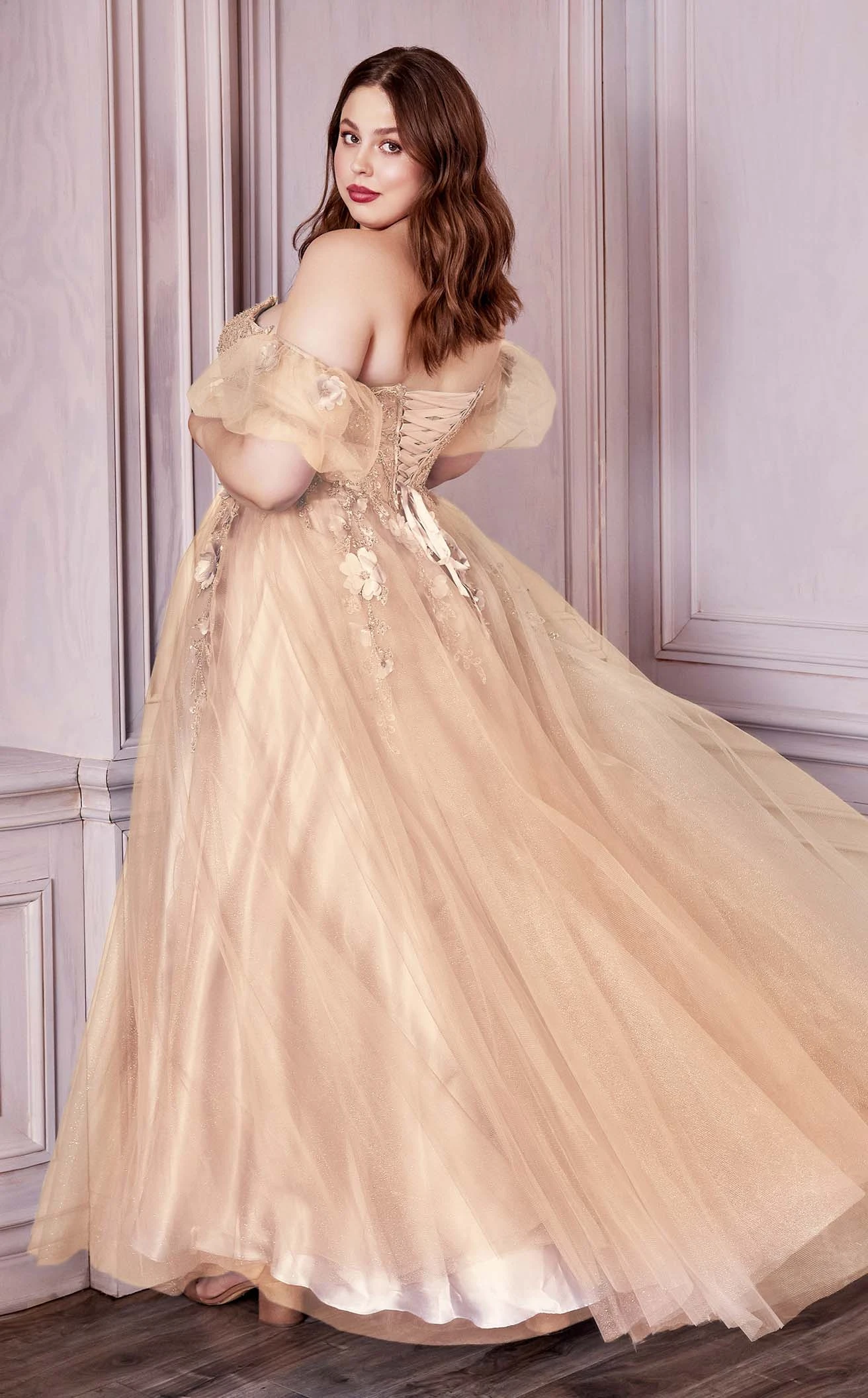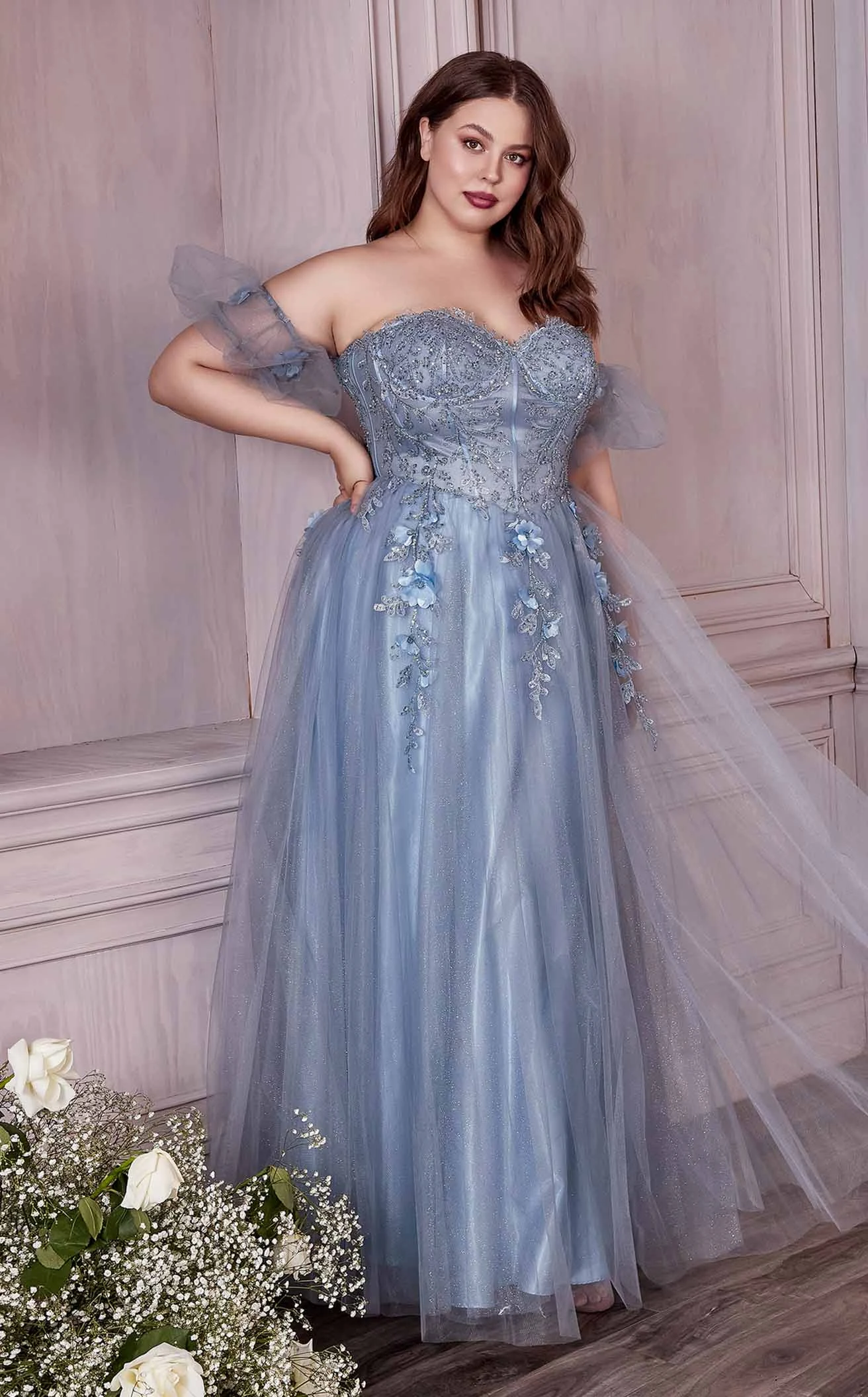 Slip into this stunning dress by Cinderella Divine CD0191C on your next black-tie event. Its corset bodice is glimmering with sparkles and beadwork that travel to the skirt in a floral pattern. Featuring an off-shoulder sweetheart neckline and detachable puff sleeves, the dress has a lot to give. Its beautiful satin skirt has a mesh overlay and ends with a full-length hem.