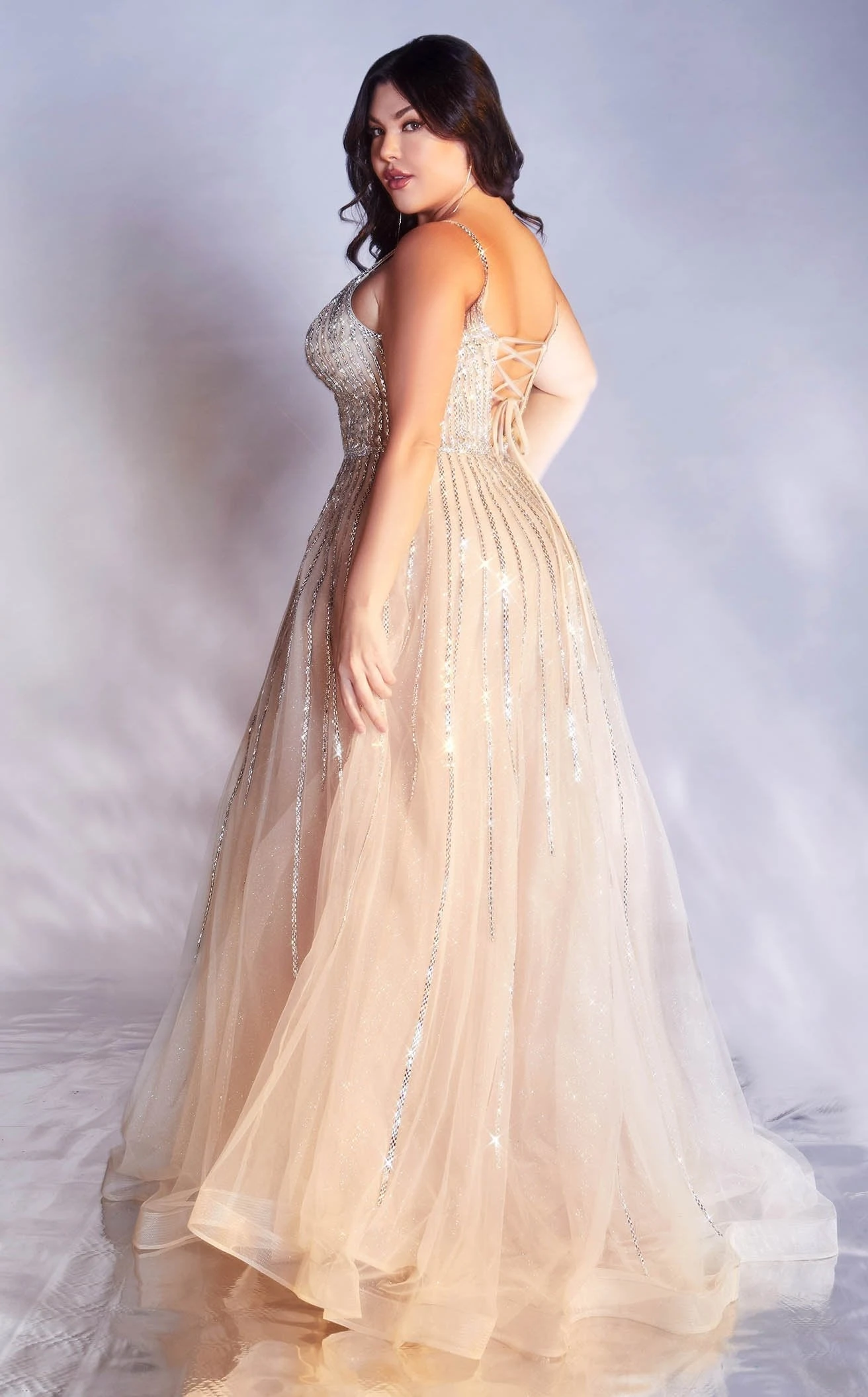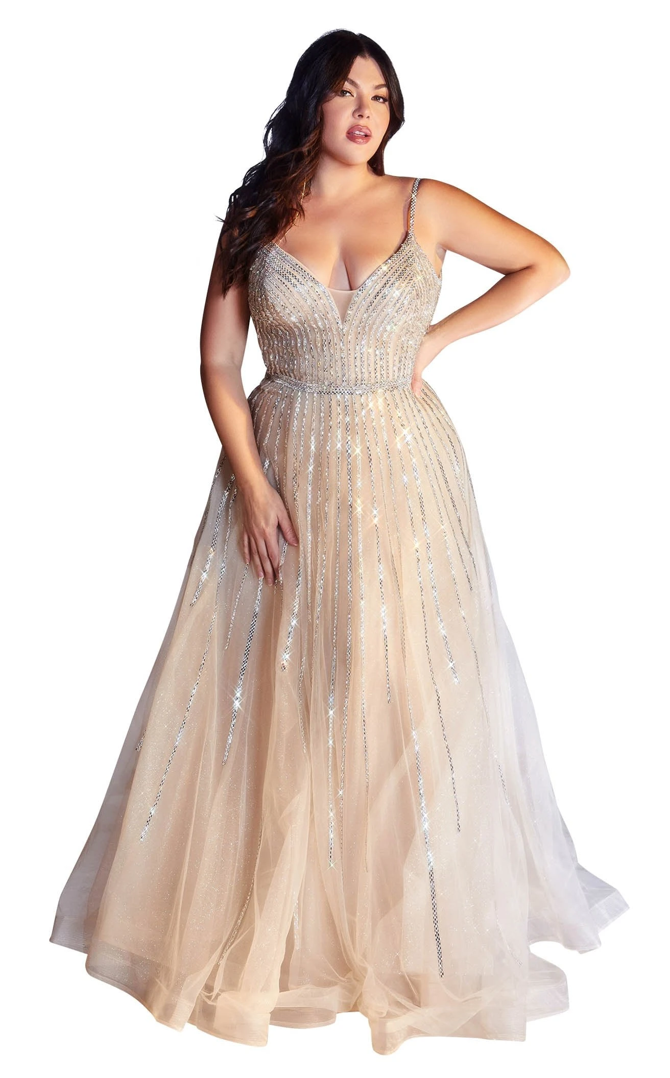 Look absolutely divine in Cinderella Divine CD940C Dress. This exquisite piece features a a-line silhouette and glittering accents. The sleeveless bodice has a v-neck neckline and a natural waist.