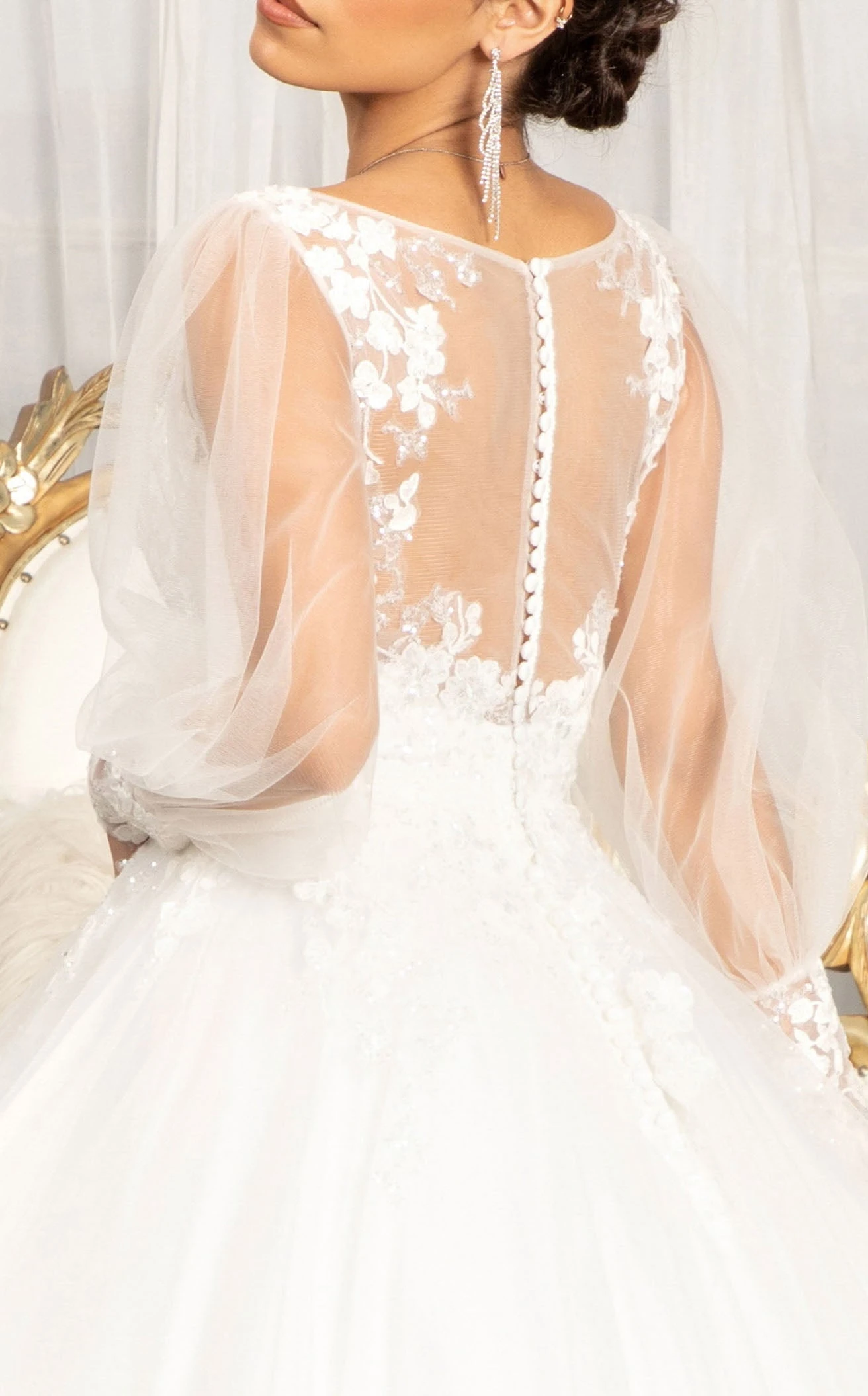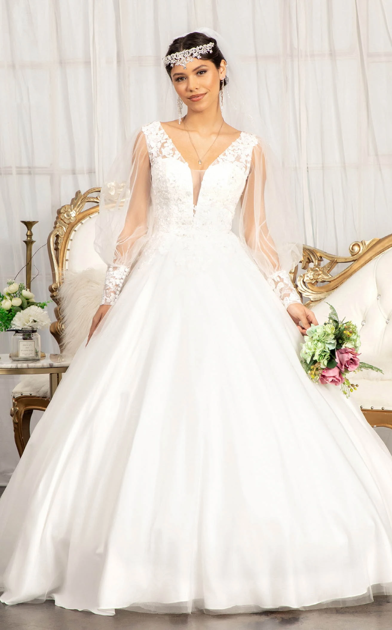 Add glamor to your wedding day with this beautiful dress designed by Elizabeth K GL1981. The plunging neckline is sexy along with the puffy mesh full-length sleeves. The lacy bodice looks exquisite. This is a voluminous bridal dress straight out of a fantasy that will make you the prettiest bride ever. It comes with a mesh veil.