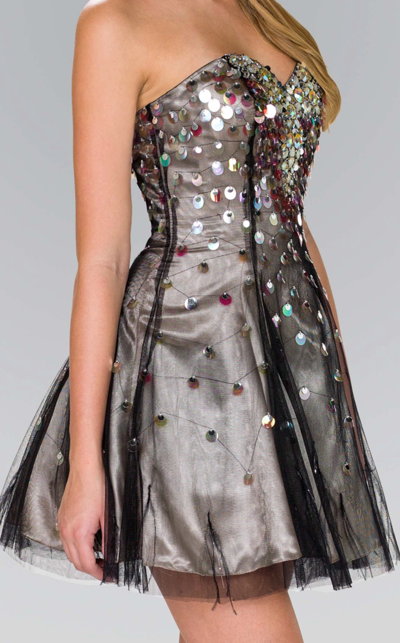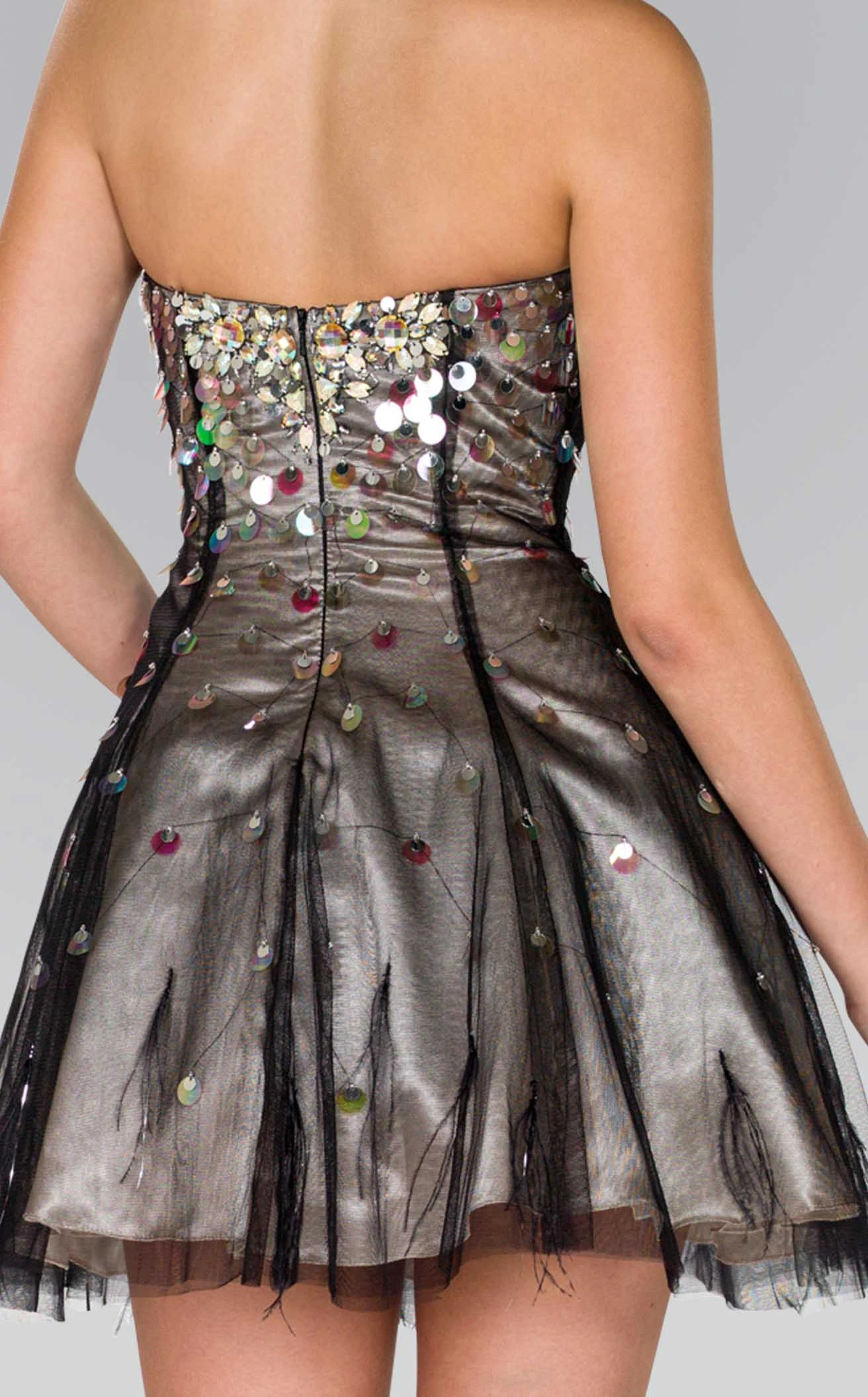 This radiant party dress from Elizabeth K GS1023 delights in a form-flattering bodice. Embellished with gleaming beads throughout, the dress flourishes a flowy A-line skirt that ends at the mid-thigh hem. The strapless sweetheart neckline adds a touch of sensuality to the entire attire. Dance the night away in this party-perfect short dress!
