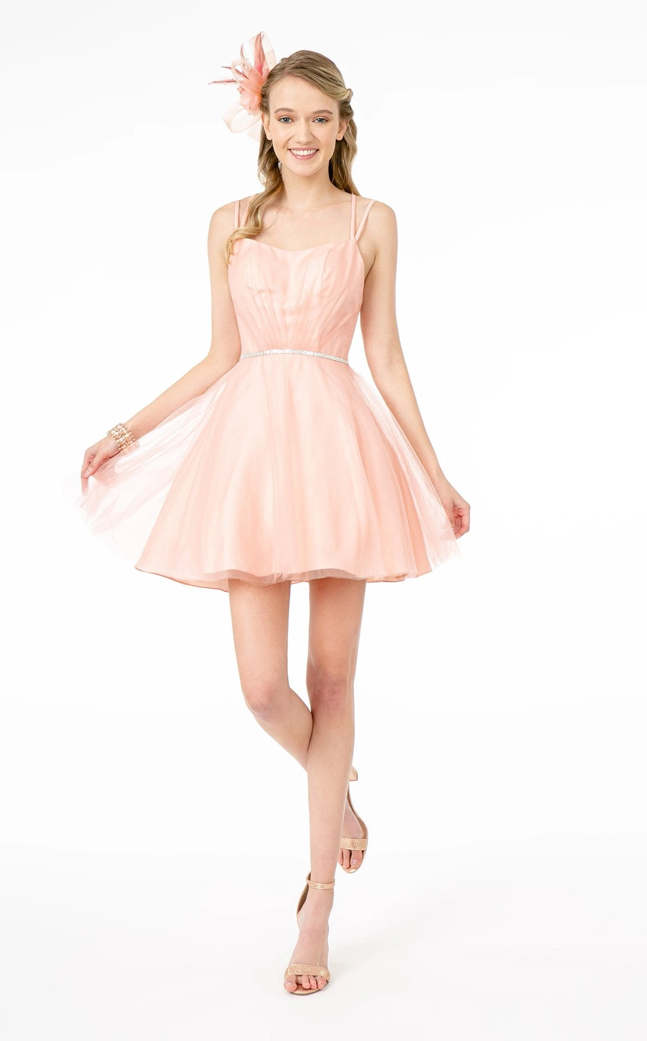 This Elizabeth K collection truly channels your romantic vibes. Featuring a fitted bodice with a straight neckline, this strappy beauty flourishes an elegant A-line silhouette. The bodice visualizes soft ruching patterns over the bust and a jewel trim sequined belt over the cinched waist. Beautiful tulle pleats are displayed over the thigh-high skirt.