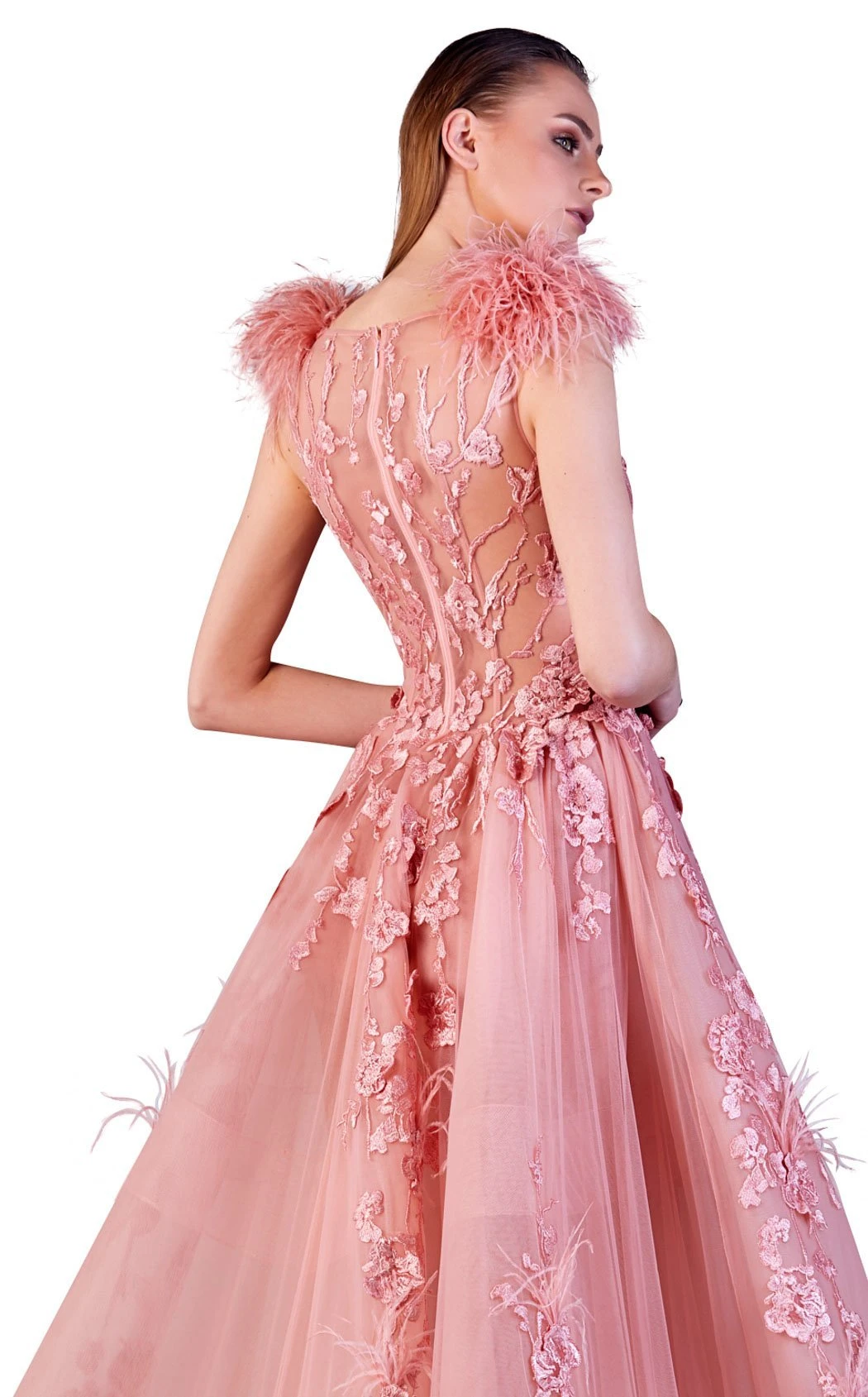 Experiment with your style statement with this lavish floral and feather detailing dress from the house of Gatti Nolli. This gorgeous gown begins with lovely feather detailing on the shoulder, sweetheart neckline and sheer back. The fit-and-flare gown has fabulous floral and feather detailing on the well-fitted bodice and A-line silhouette skirt with a slight sweep train.