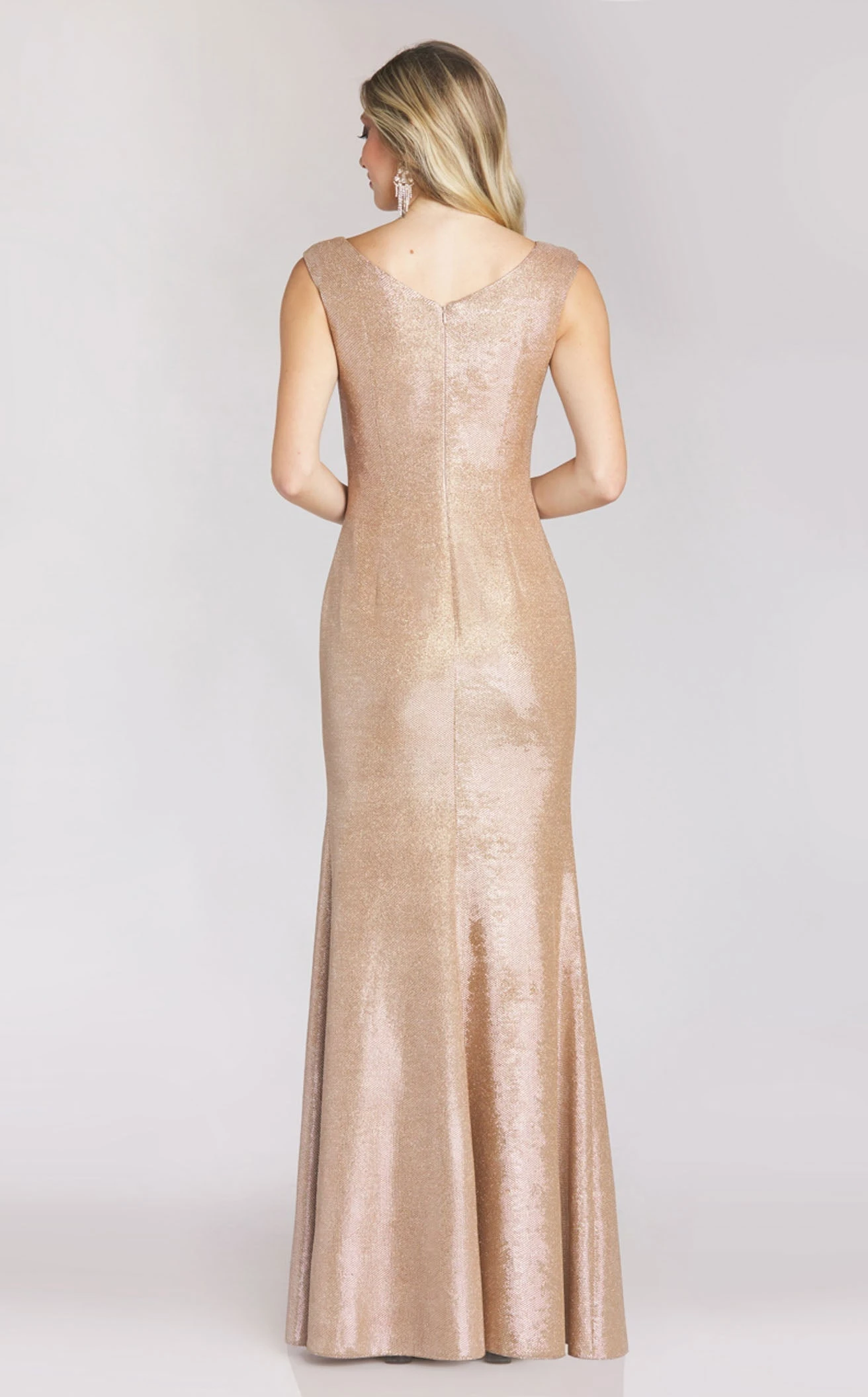 Look like a queen in this sparkling sheath gown designed by Gia Franco 12207. It has a fitted bodice with a V-neck and zippered back. The midriff is adorned by a gathered bow accent and slips straight into a high-slit skirt. Flowing into the full-length finale, this gown is a perfect fit for your formal parties.