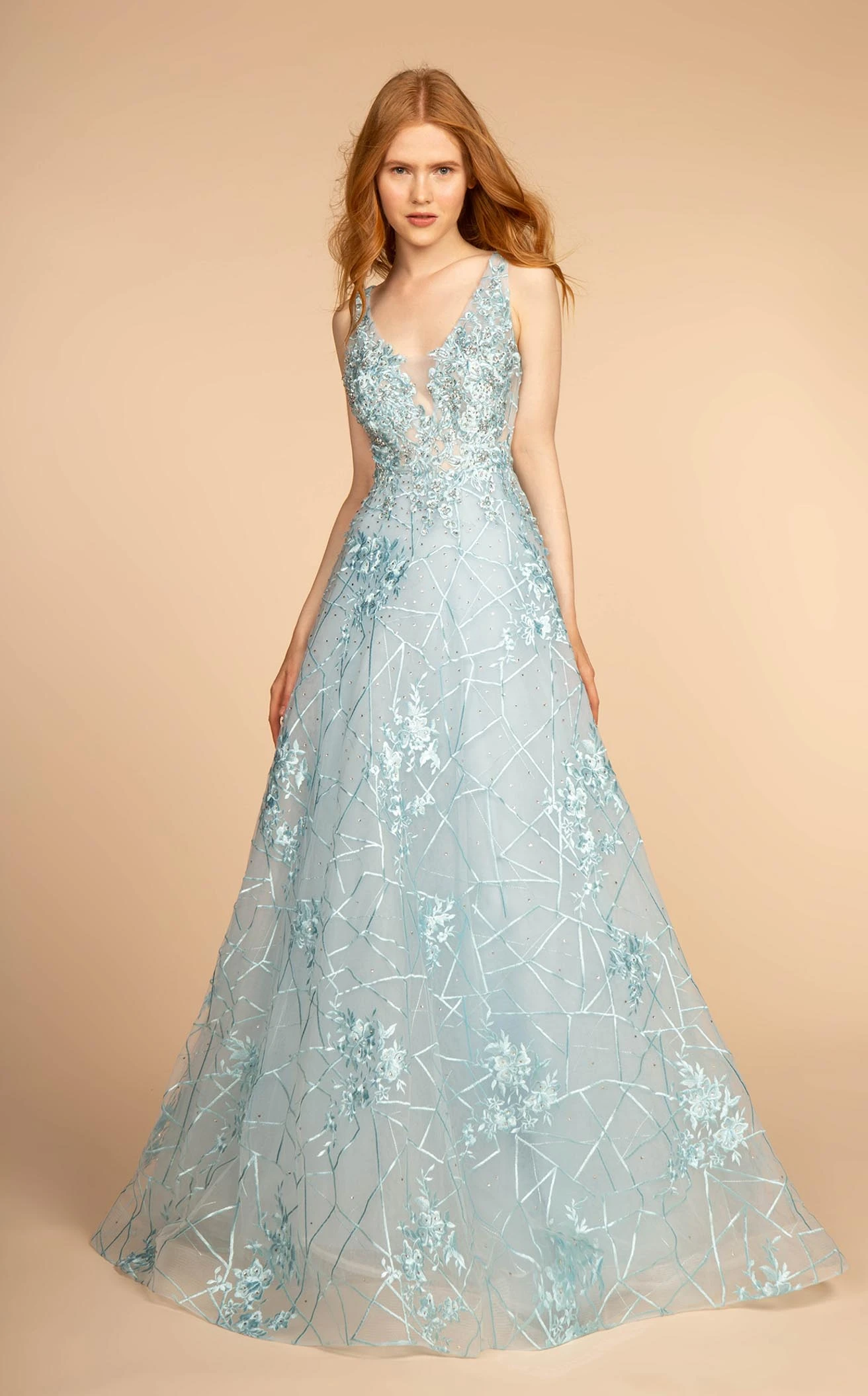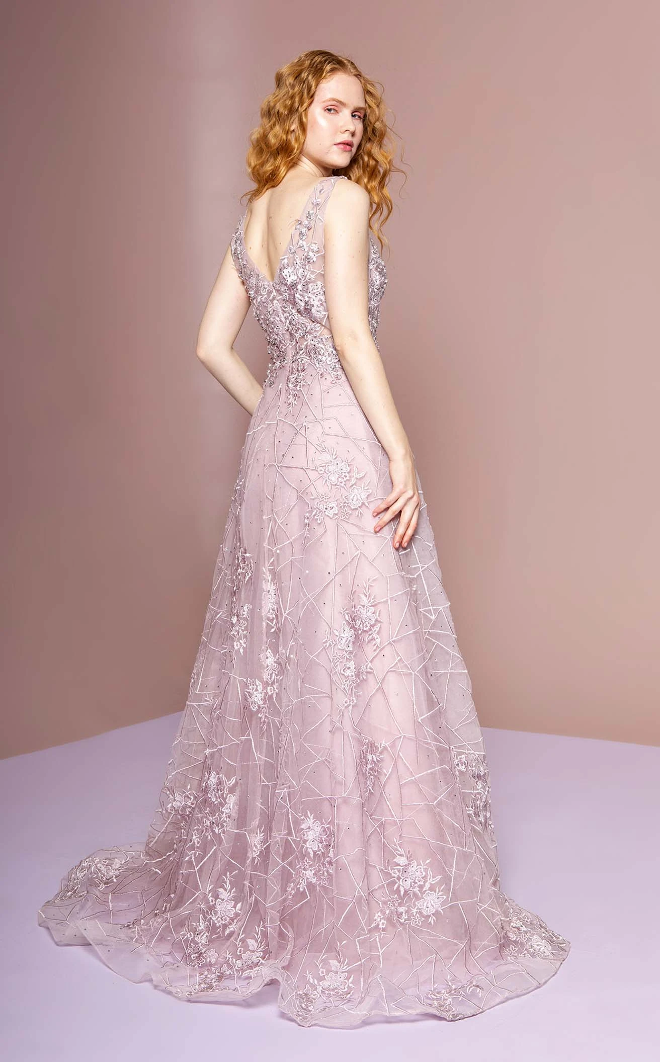 This endearing piece of creation by Gloria features a beautiful curvy fitted bodice and a plunging V-neckline anchored to a V-bareback. The A-line hem has a floor-length and comes with enthralling embroidery on a mesh jersey shining the entire ensemble in a unique light.
