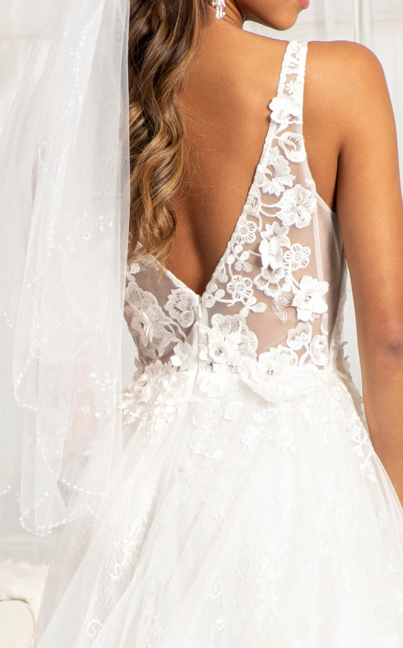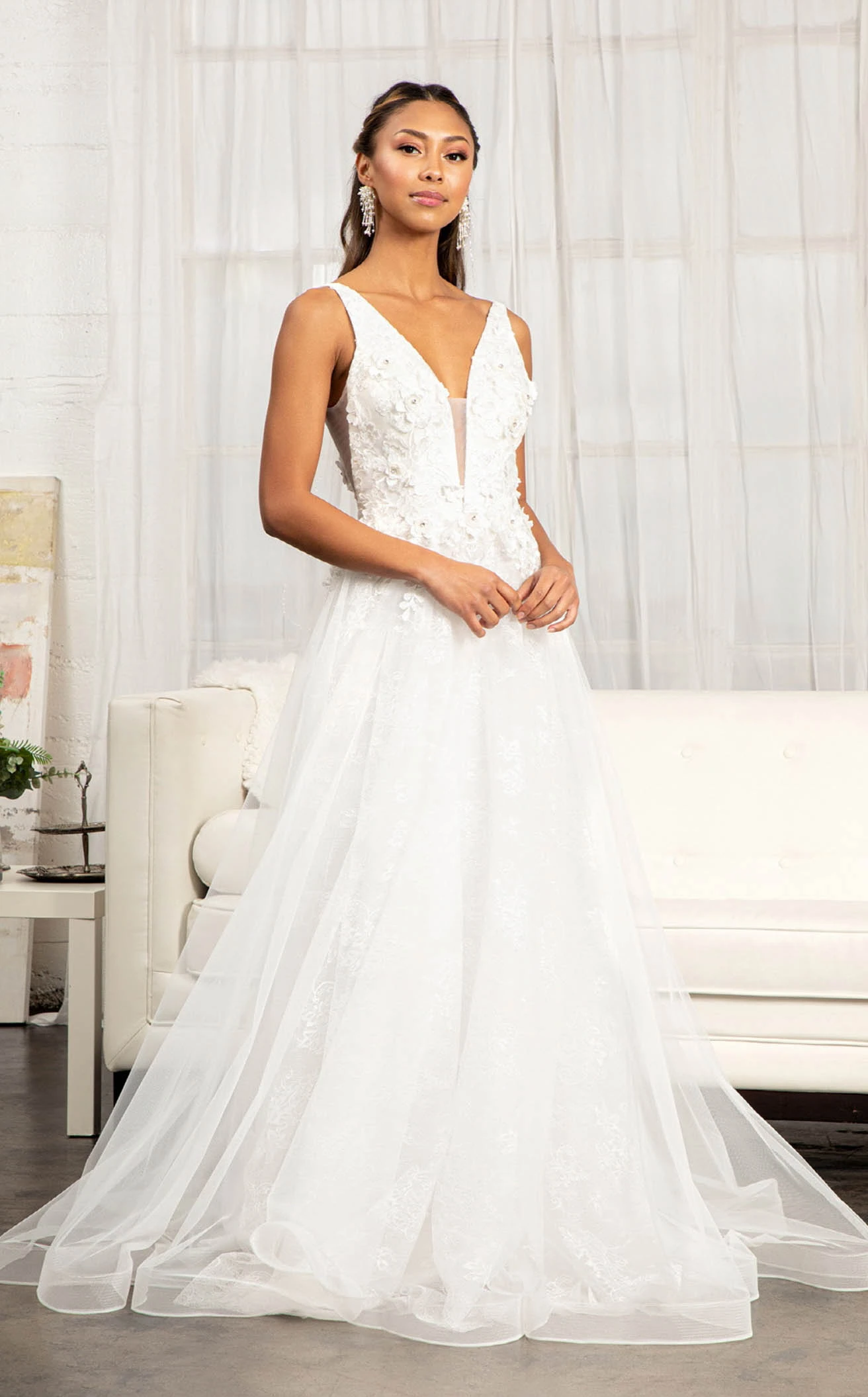 Spice up your special event in this dramatic dress from GLS by Gloria GL3012. The rhinestone embellished dress is sleeveless and shows 3D floral appliques exiting the torso. The natural waist allows an A-line silhouette to flourish to the floor in a full-length hem and a lavish sweeping train.