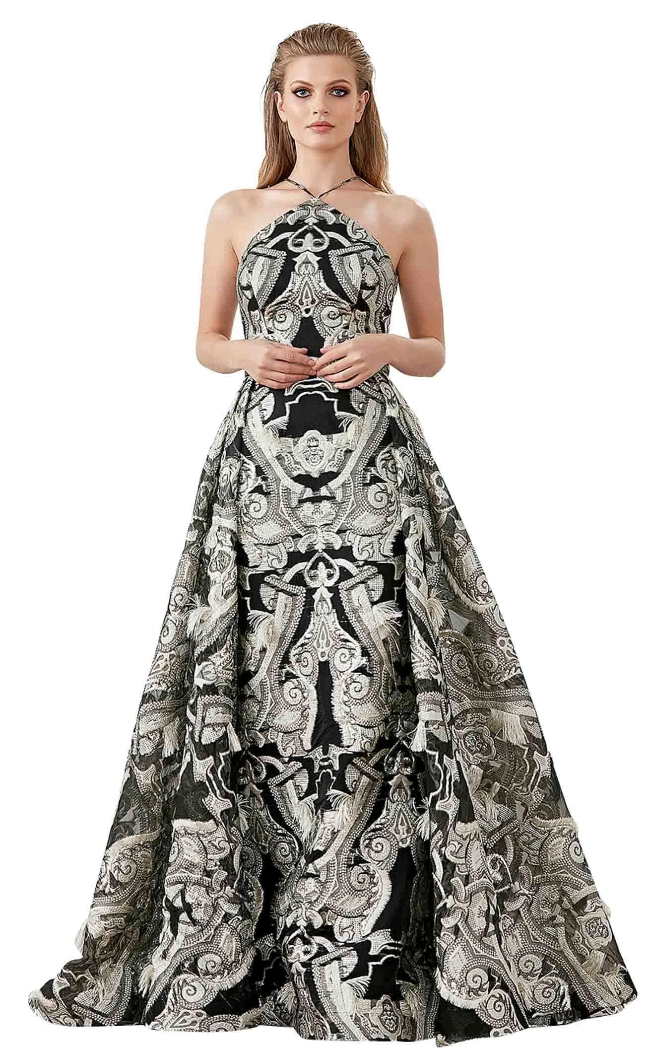 Look party-ready in this picturesque gown by Clarisse. The elegant design draws inspiration from vintage fashion trends and has intricate embroidery throughout. It mixes modern elements of a halter neck with cut-in shoulders. This attractive full-length A-line gown ends with a sweep train.