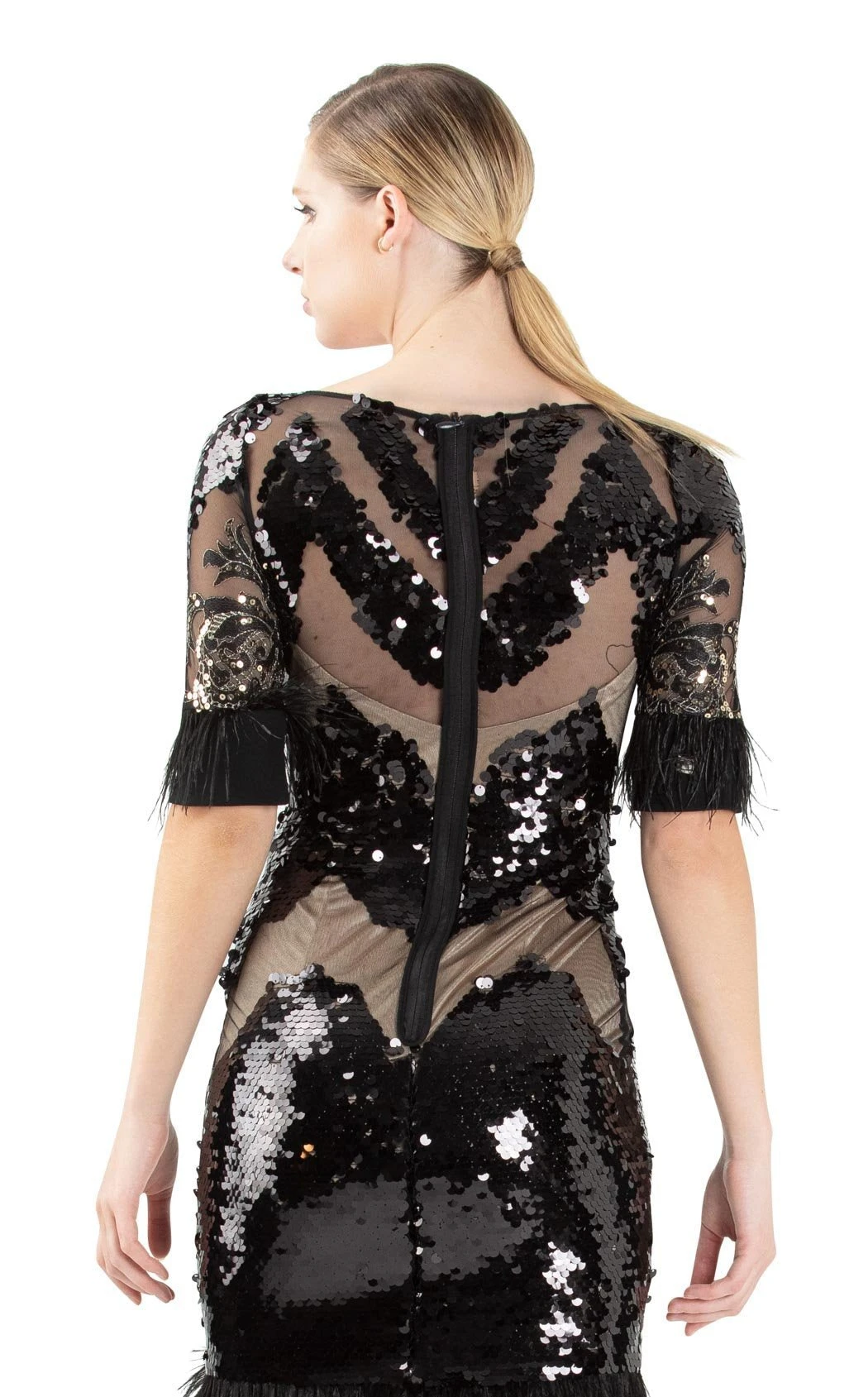This Ilmio 1940 creation is simply breathtaking! This chic short dress features an illusion bateau neckline with sweetheart lining and short sheer sleeves. Embellished with glitzy sequins in an intricate fashion, this figure-flattering dress slides down to the mid-thigh hem. Fringed and banded detail on the sleeves and hem add to its chic appeal.