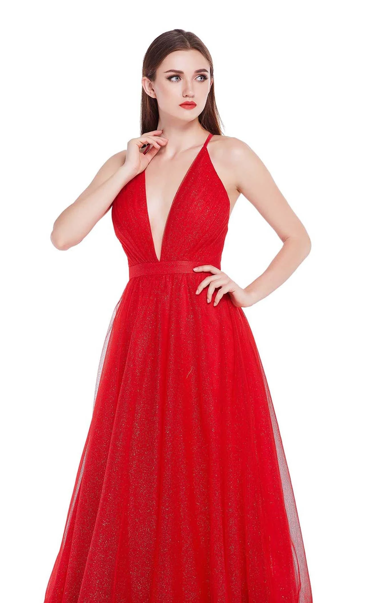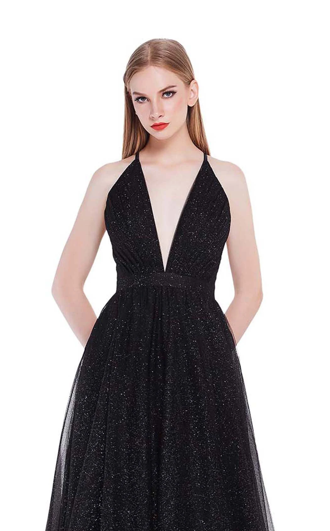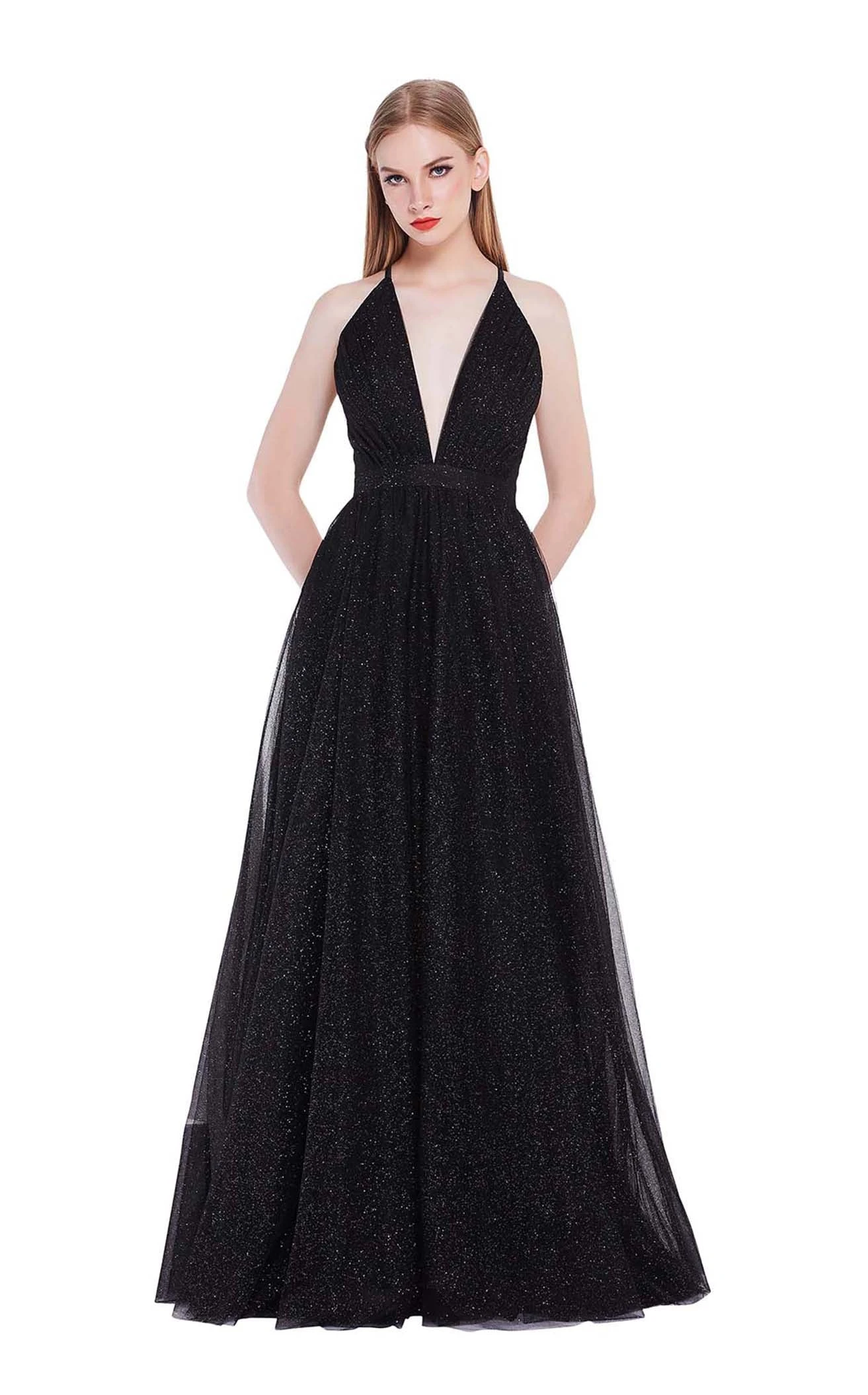 The classic A-line silhouette ballgown from Jadore J14041 is an ideal pick for the opening ball dance of your big night. Featuring a sleeveless fitted bodice, this gown has a plunging V-neckline and a cross-strap open back. This shimmering gown flares into an A-line skirt with a thin waistband and ends in a slight train.