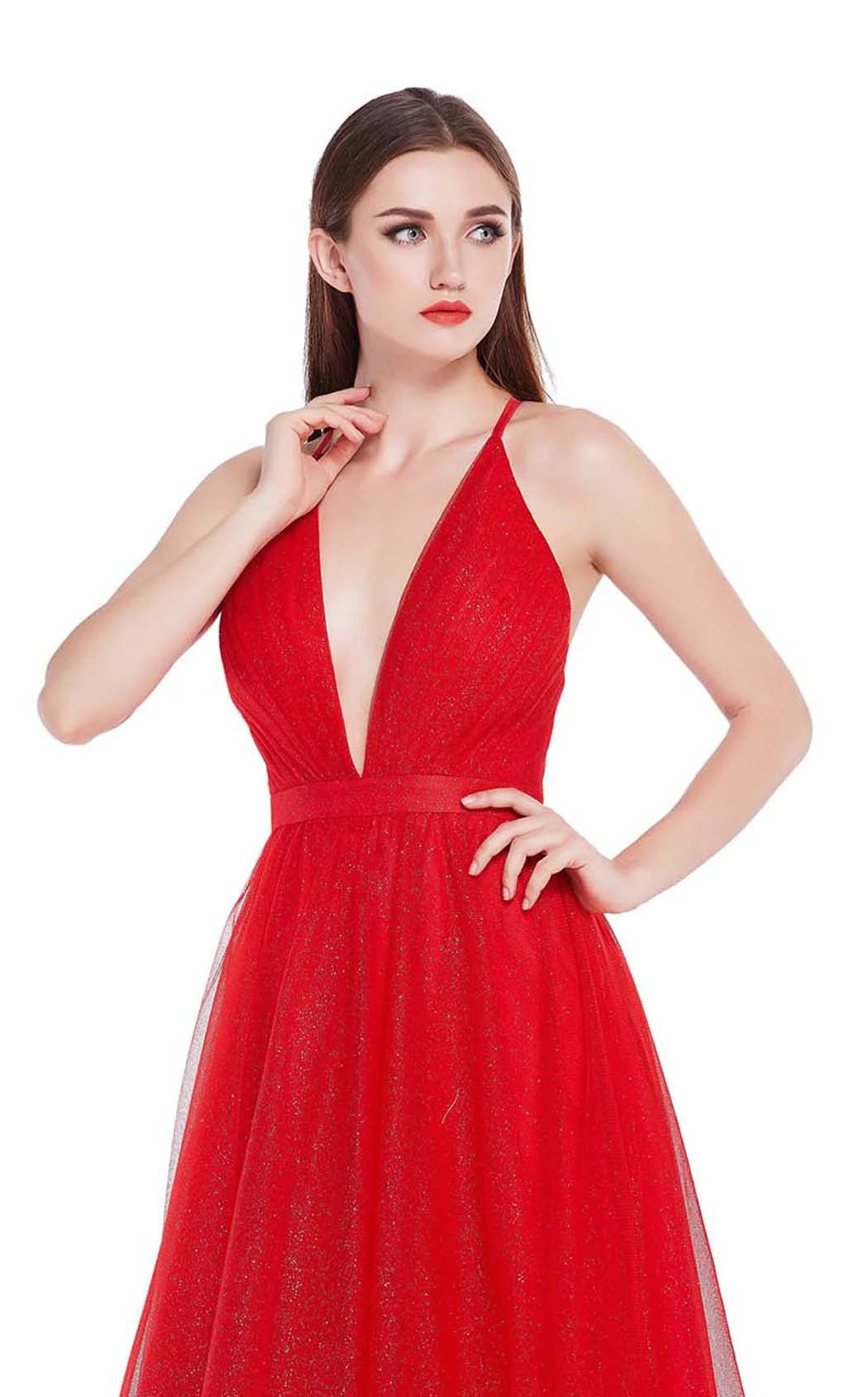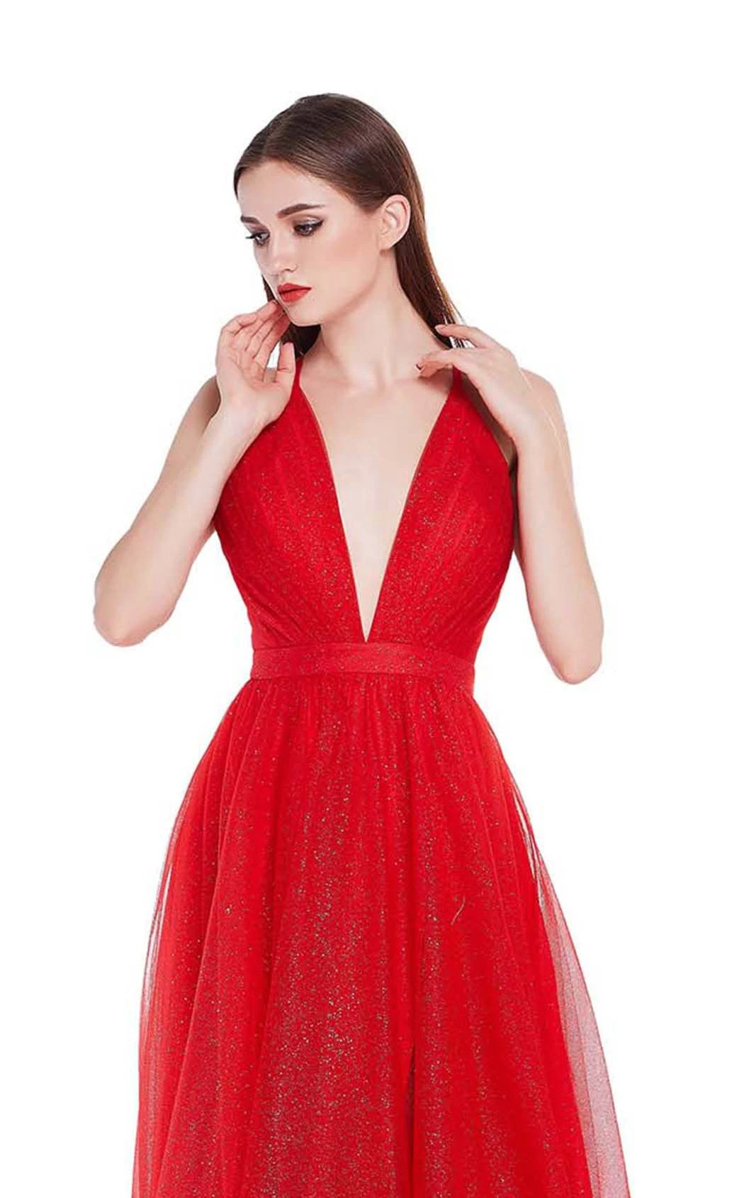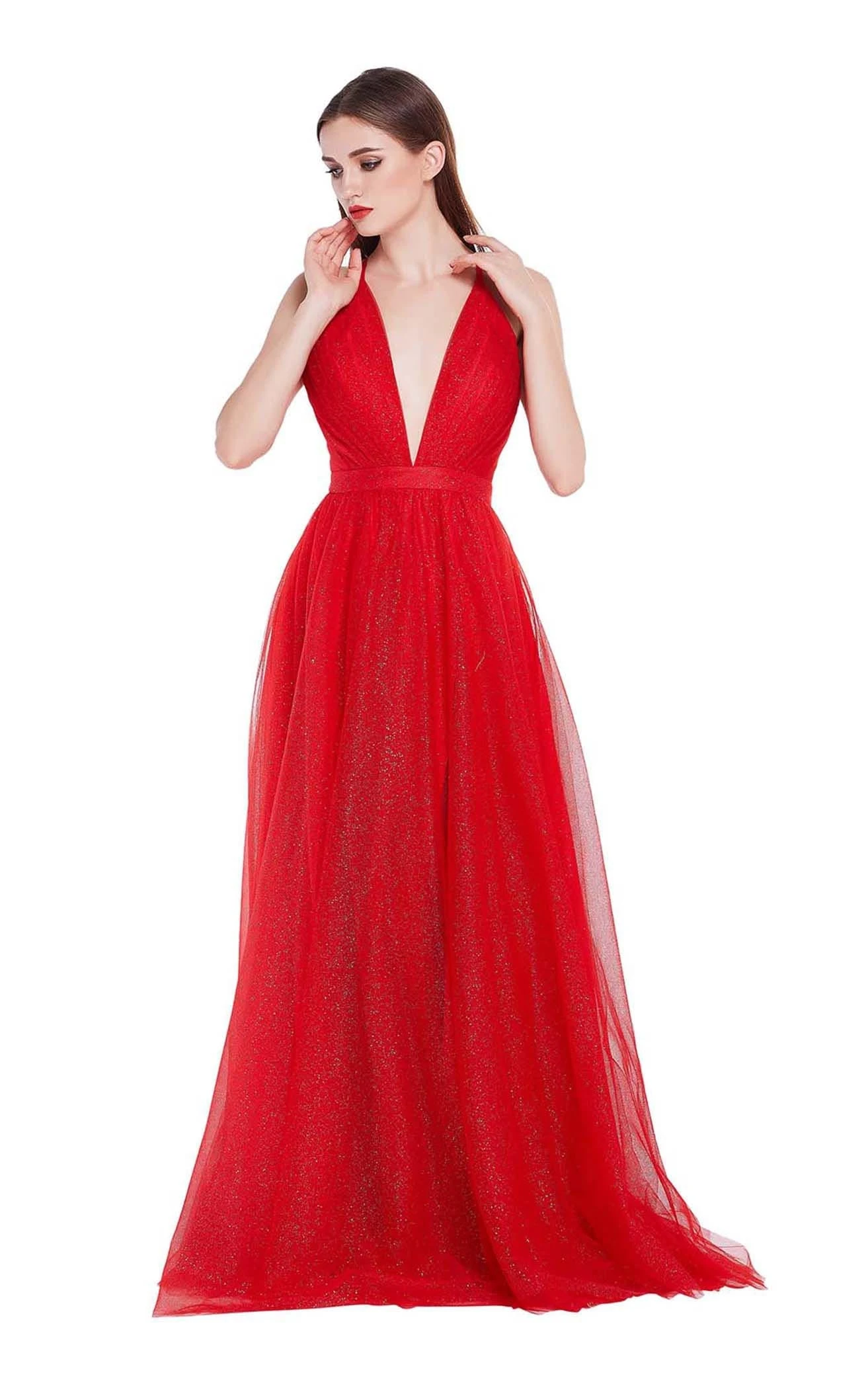 The classic A-line silhouette ballgown from Jadore J14041 is an ideal pick for the opening ball dance of your big night. Featuring a sleeveless fitted bodice, this gown has a plunging V-neckline and a cross-strap open back. This shimmering gown flares into an A-line skirt with a thin waistband and ends in a slight train.