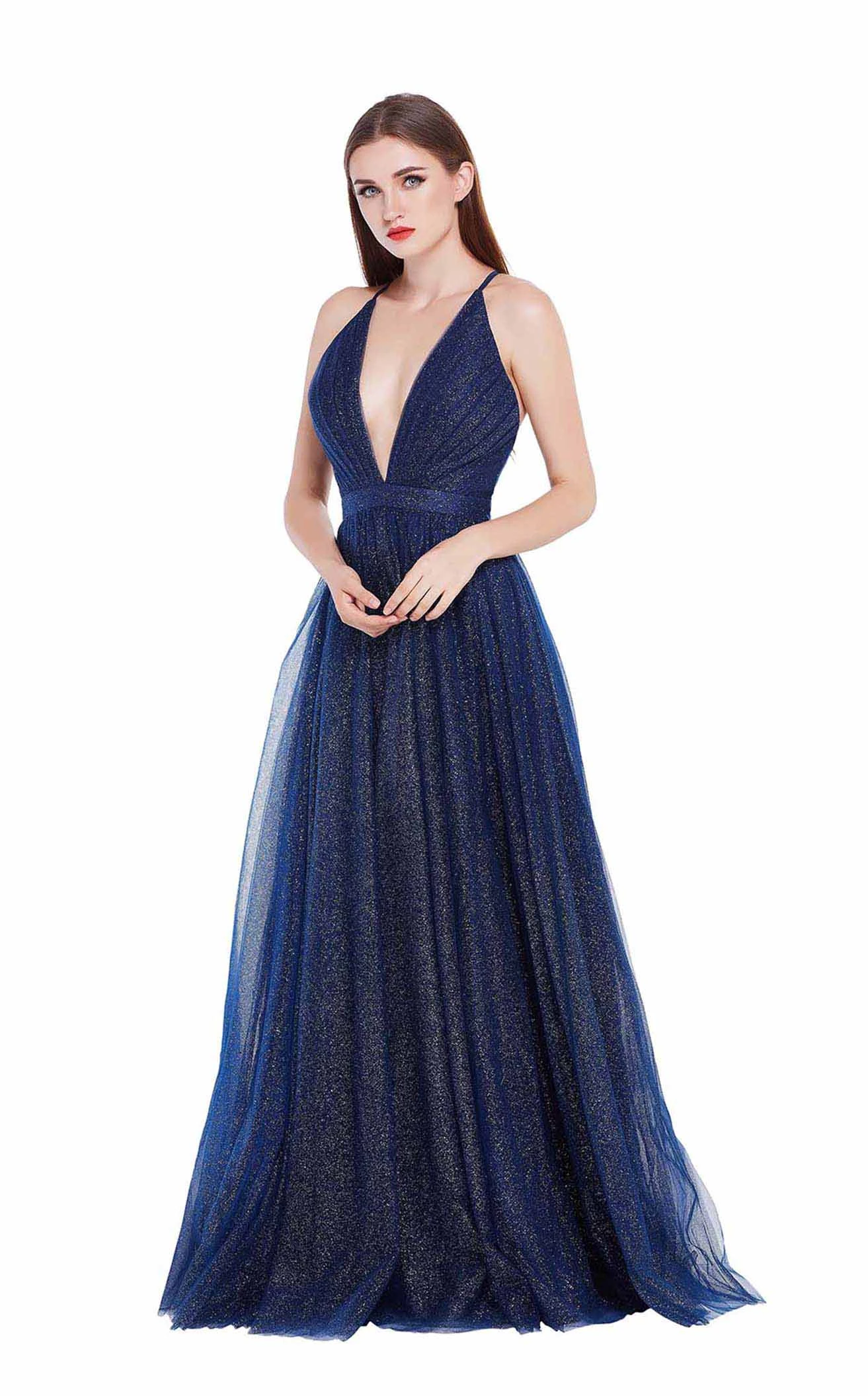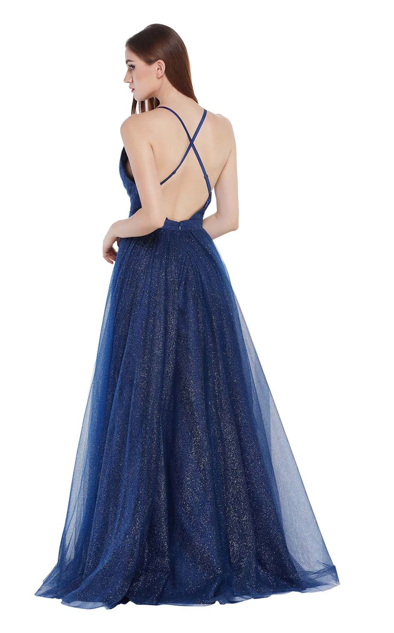 A-line ballgown with plunging V-neckline and cross-strap open back by Jadore