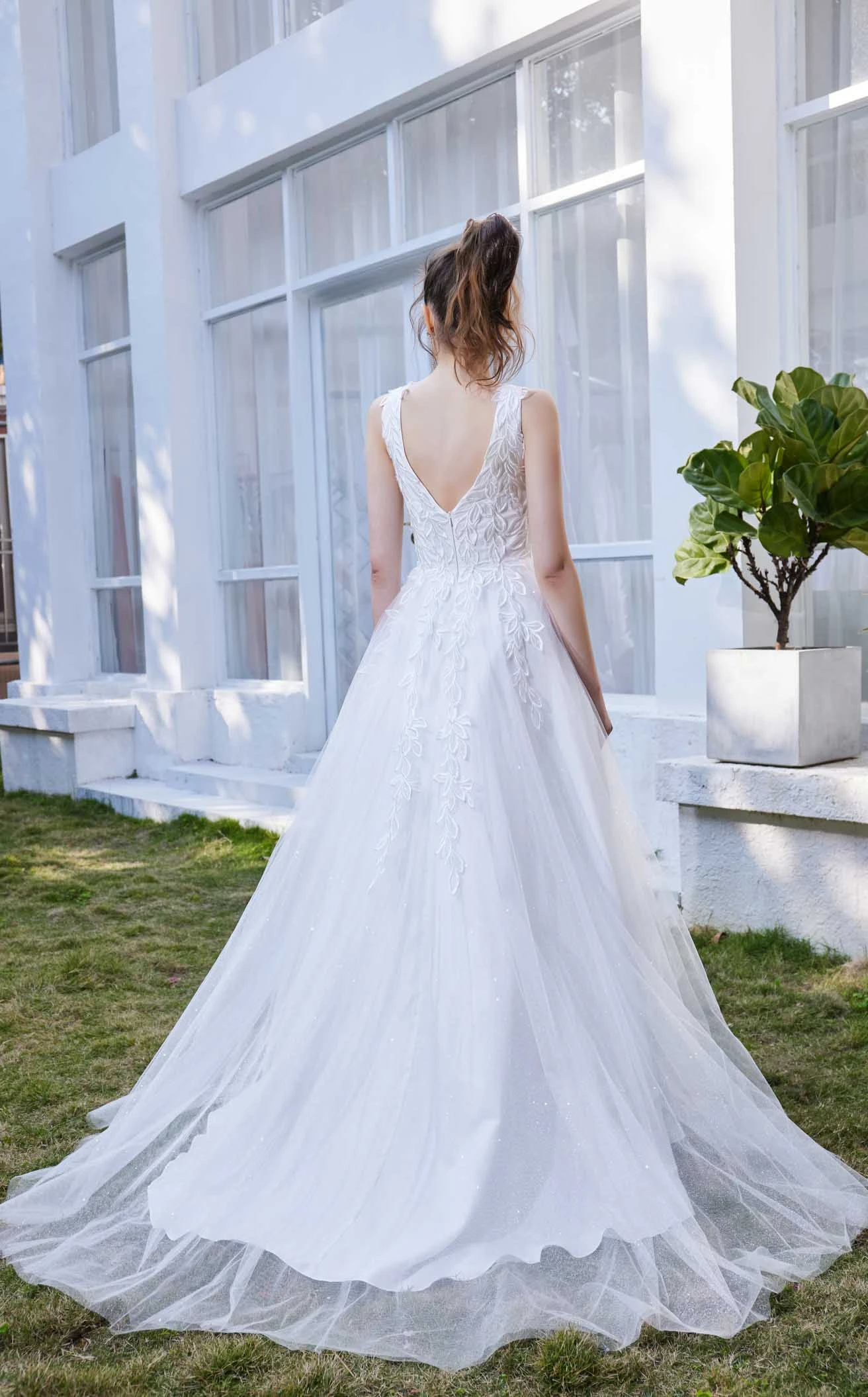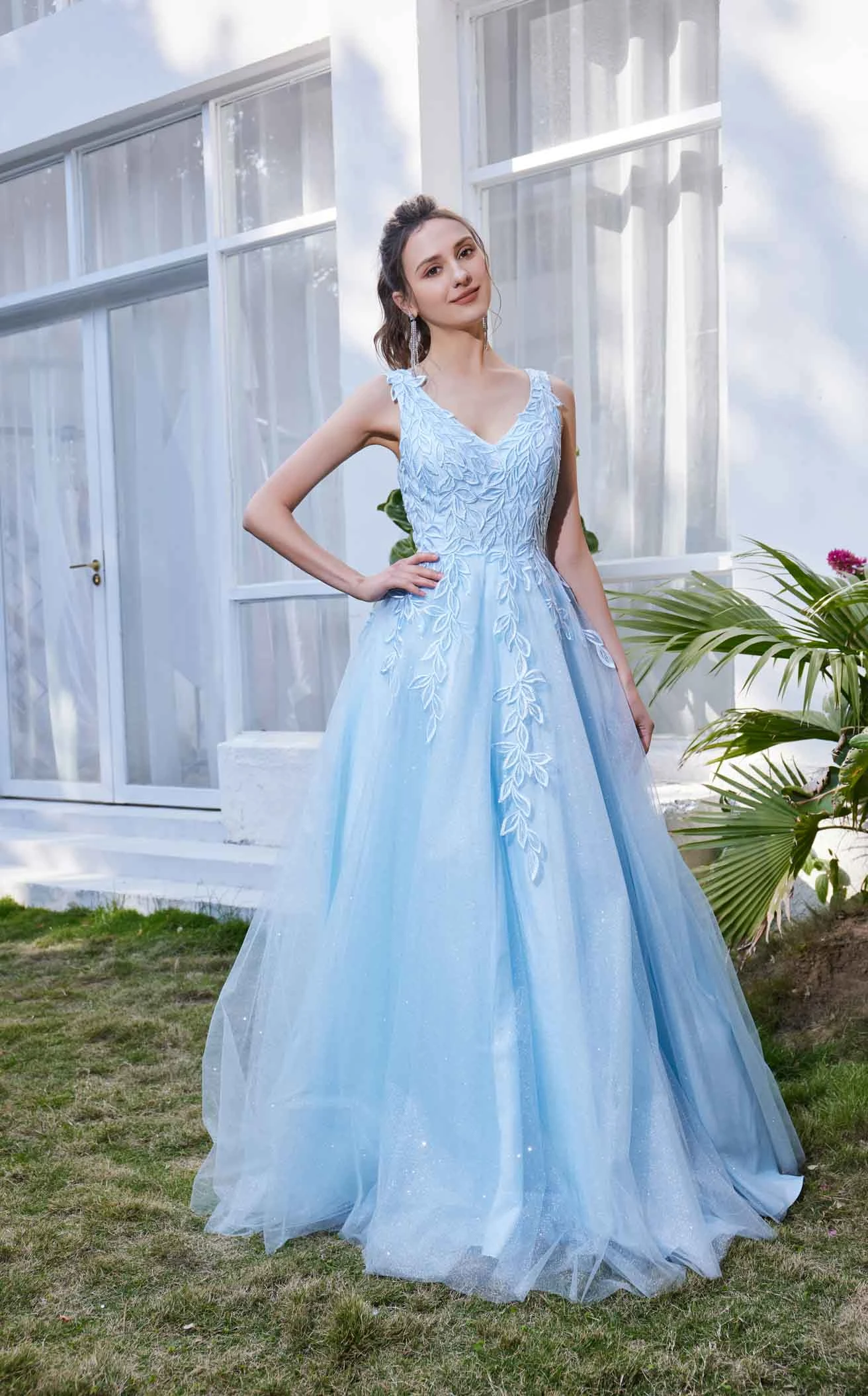 Leaf Applique Embroidered V-neckline A-line Tulle Dress by Jadore