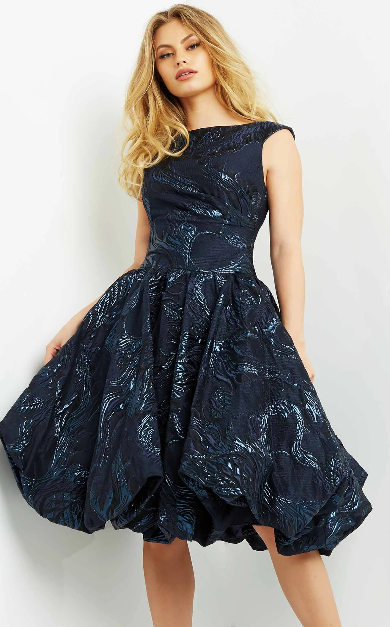 Style this brocade homecoming dress designed by Jovani for a spectacular night. Featuring a side-ruched bodice with a bateau neckline and low V-cut back, the dress would gather you many compliments. The midi dress has a bubble pleated skirt and empire waistline to give a tempting look on your special day. Its cap sleeves give you the perfect opportunity to glam up with a bracelet of your choice. To complement this beautiful dress, you can wear a pair of stilettos.