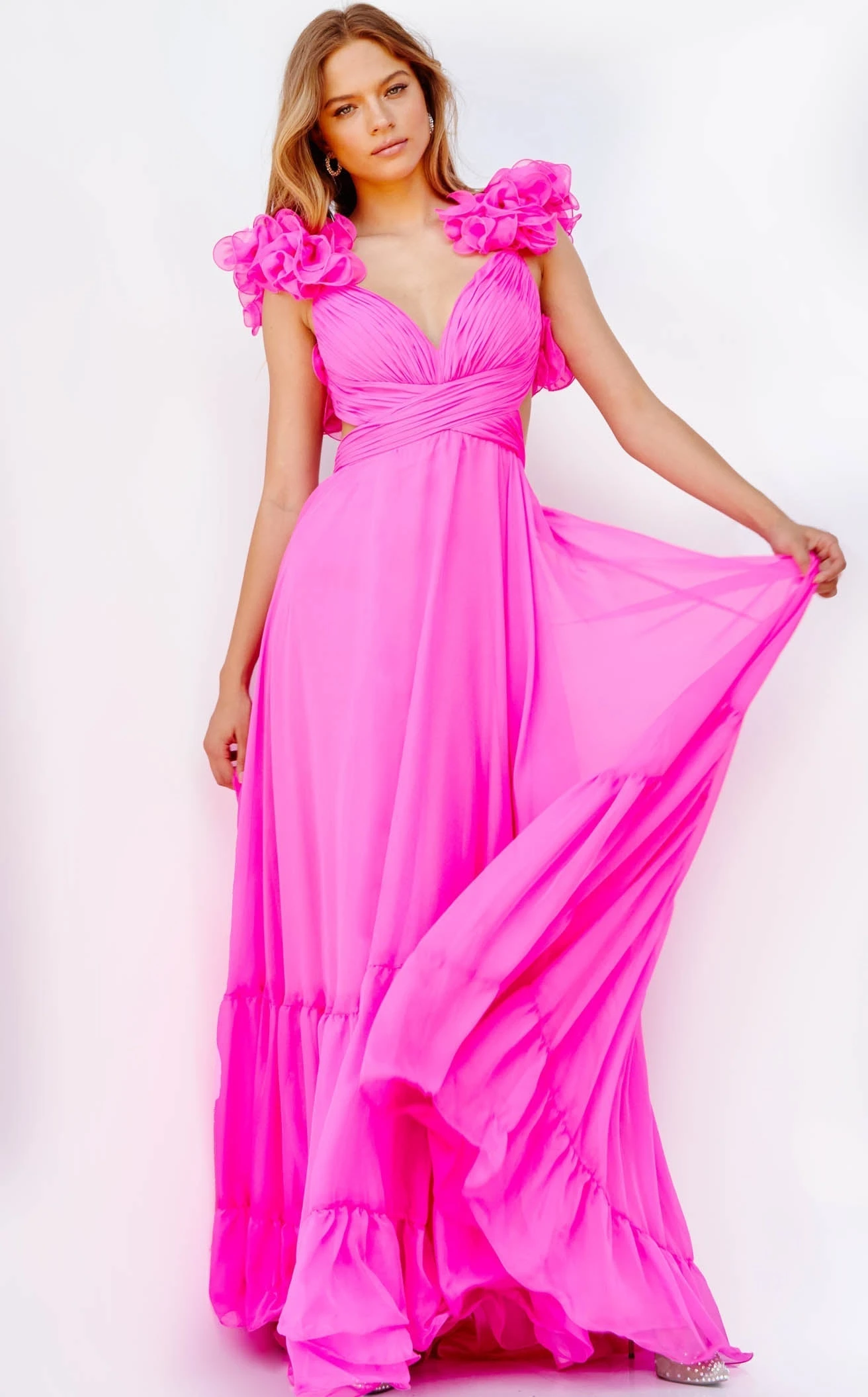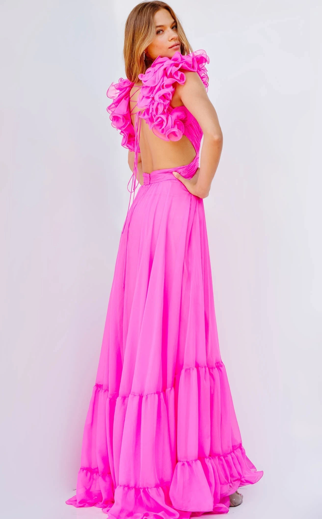 Enticing Hot Pink Ruffled Flowy Gown by Jovani.