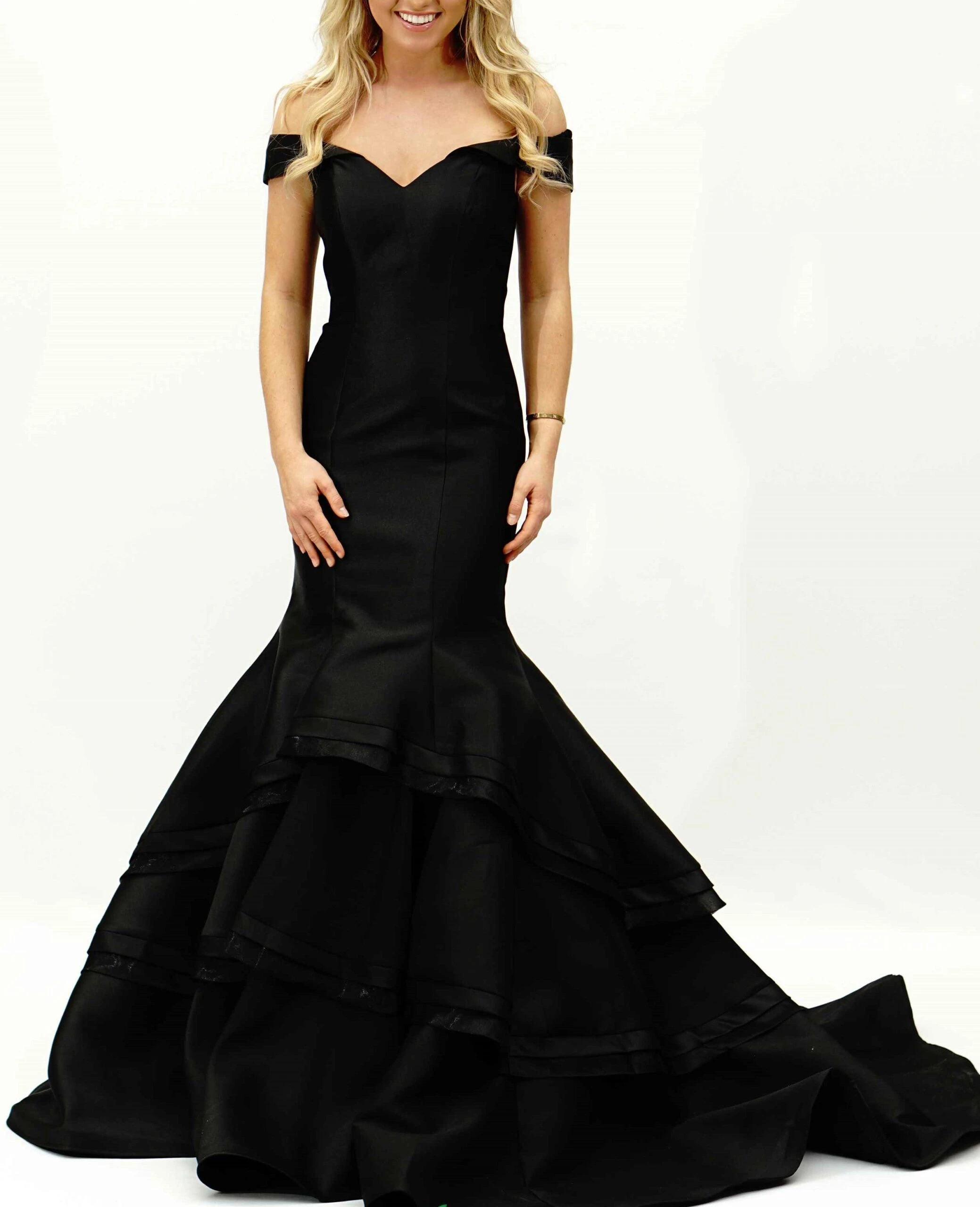 Turn heads in this enchanting evening gown by Jovani 31100. The fashionable sweetheart neckline bodice has timeless off the shoulder straps and is made to hug your shape. Form fitting to the low hip, this lavish ensemble drapes to the exaggerated full-length mermaid silhouette hem in sensational ruffled layers in this decadent fairytale look.