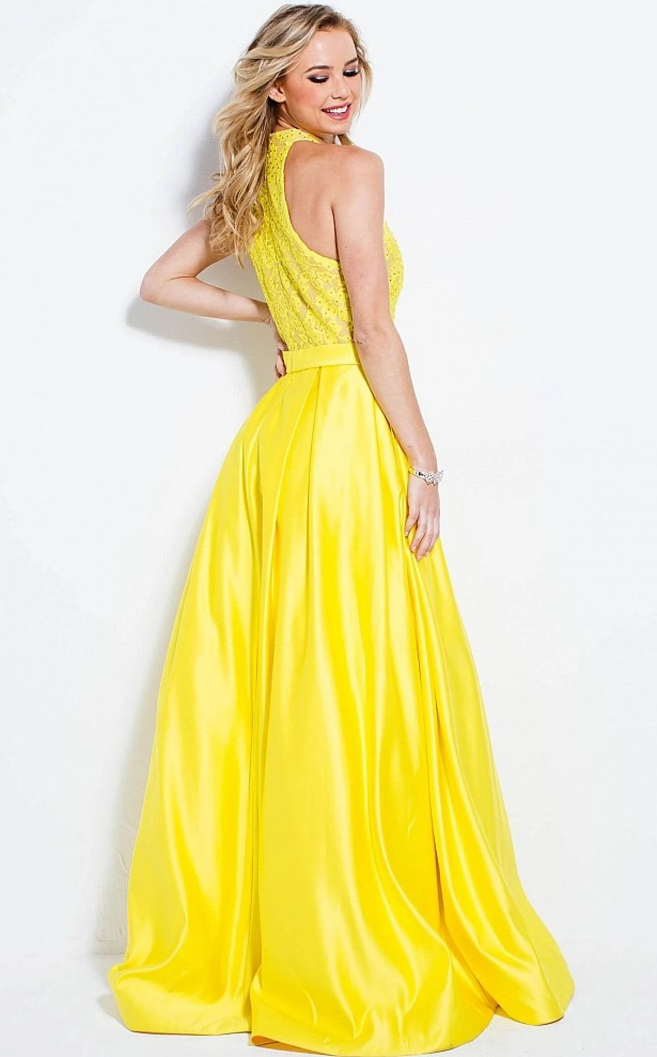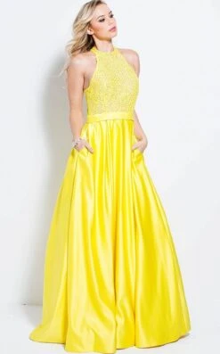 Look absolutely lovely in Jovani 57940BG Dress. This pretty piece features a a-line silhouette and glittering accents. The sleeveless bodice has a halter neckline and a natural waist.