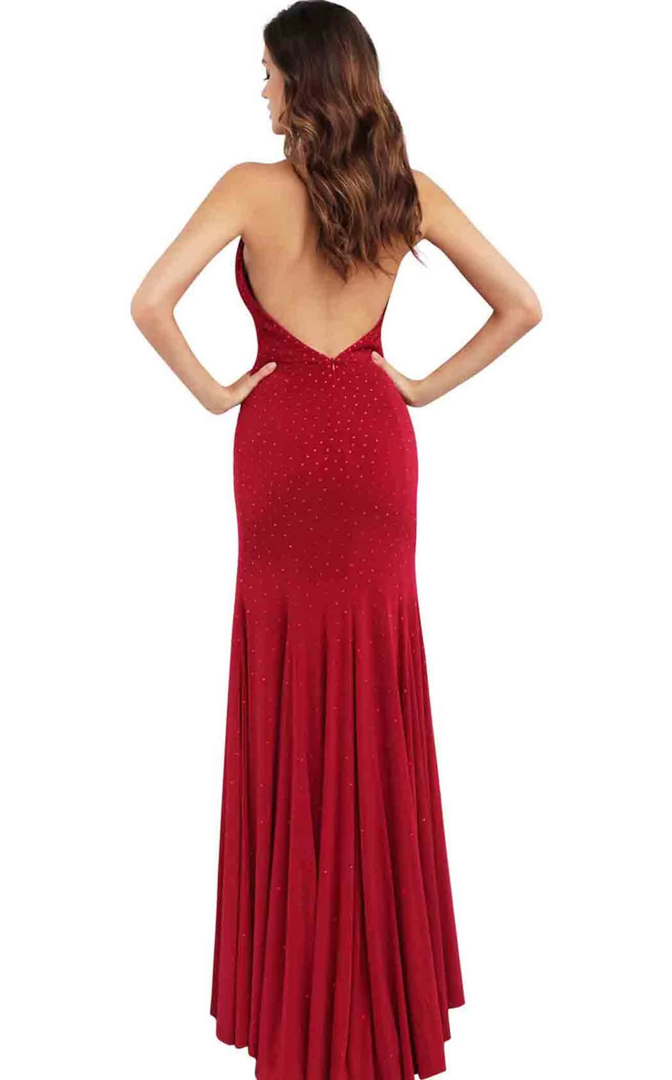 Magnificent beaded plunging halter neck prom dress by JovaniBe the one everyone has their eyes on wearing this fitted party dress from Jovani. Offering a body-hugging silhouette, this elegant dress has a revealing plunged V-neckline and a sexy open back. This ensemble is adorned with tone-on-one beads scattered from top to toe. An elegant flowy skirt smoothly flares as it slides to the full-length hem and ends with a small sweep train and high side slit.