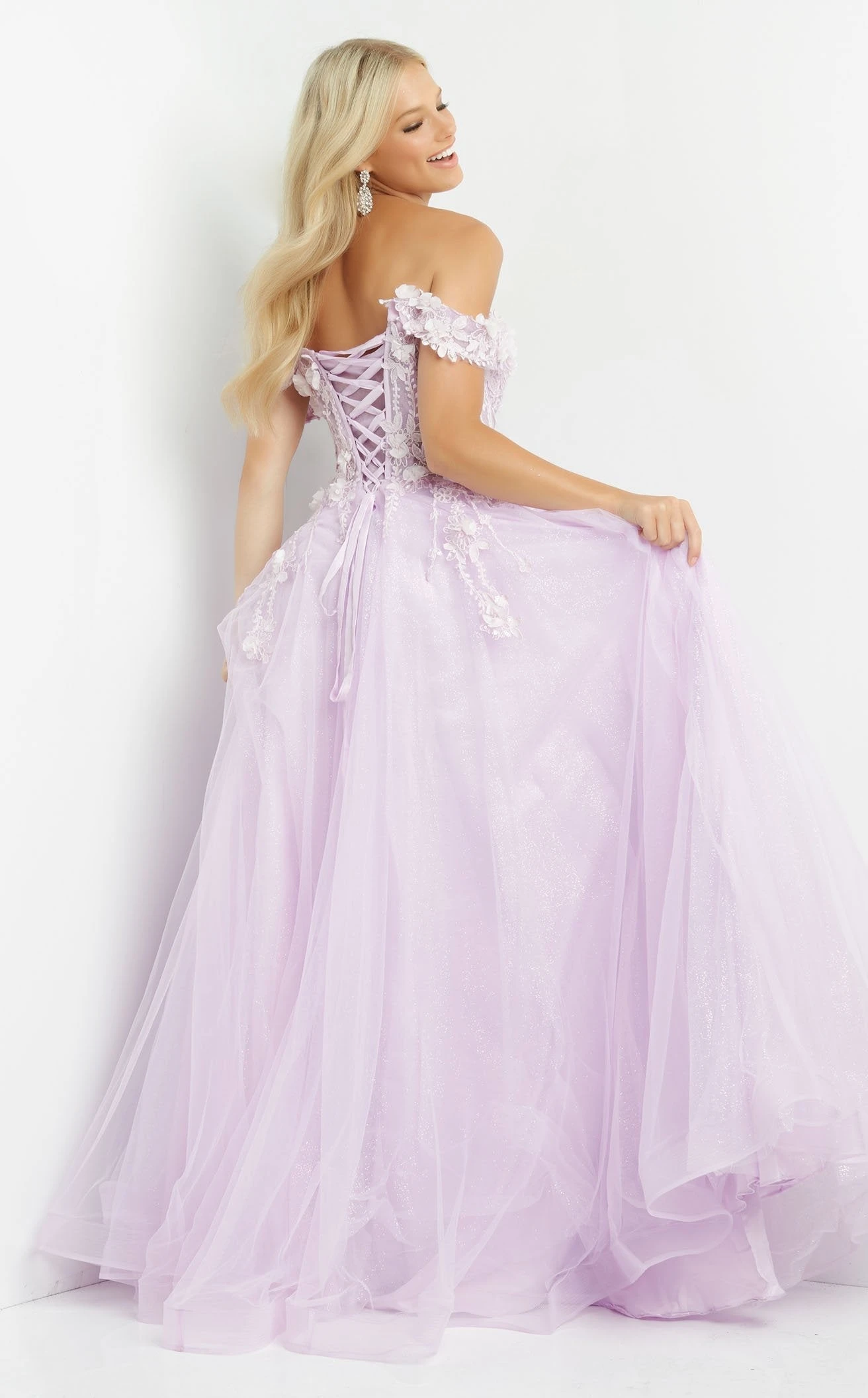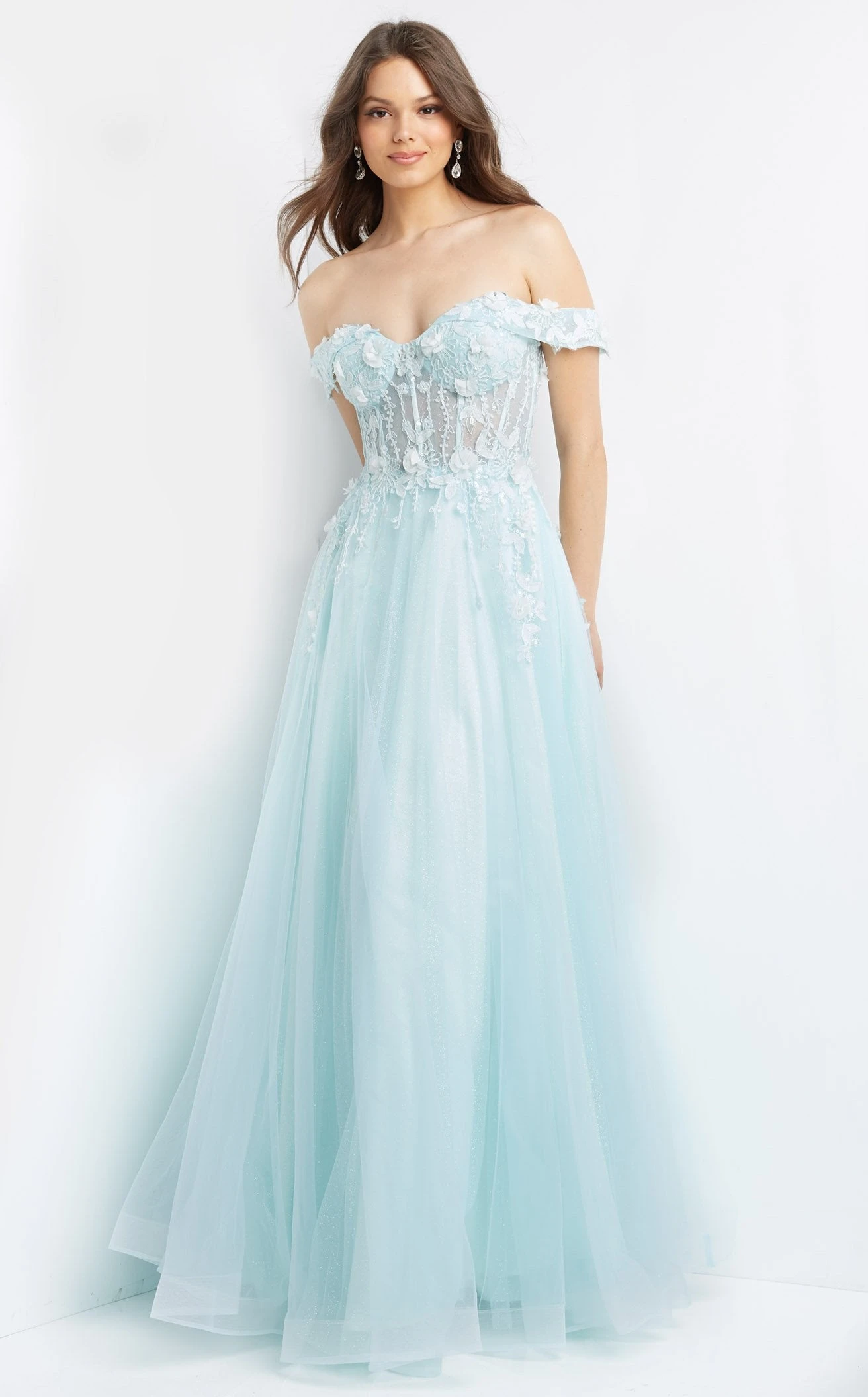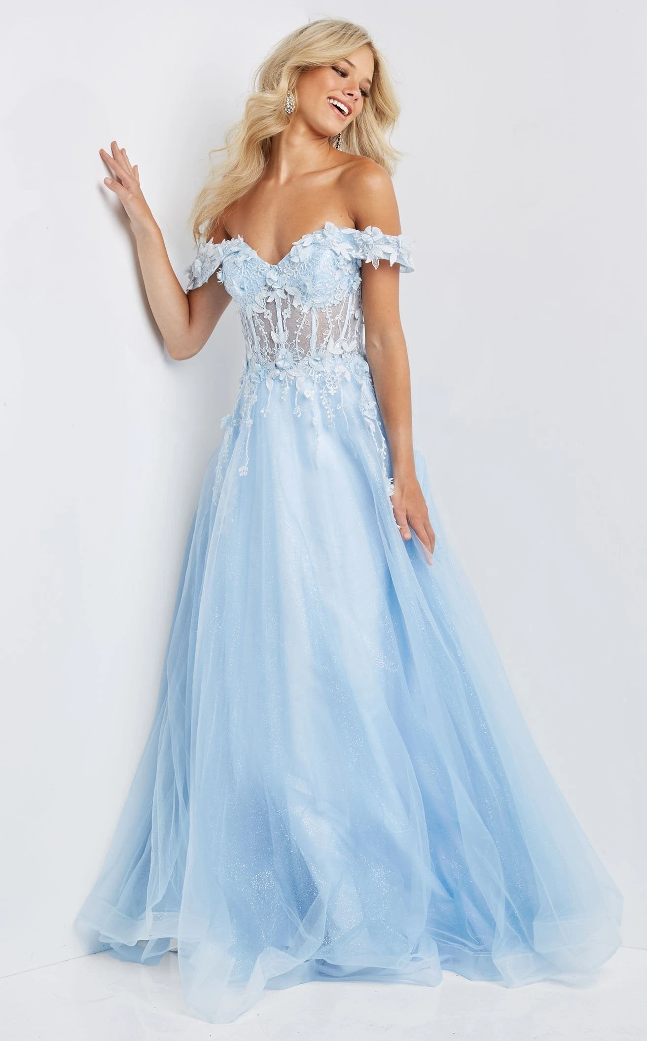 Turn yourself into a sensation wearing this gorgeous prom piece from the house of JVN by Jovani JVN08295. Its sheer corset bodice is graced by a sweetheart neckline and cap sleeves. The back has a mid-open laced closure that gives you a graceful look from the back. This dress is engulfed with floral appliques flowing below the waist while the skirt has an A-line silhouette with a train for a flowy touch.