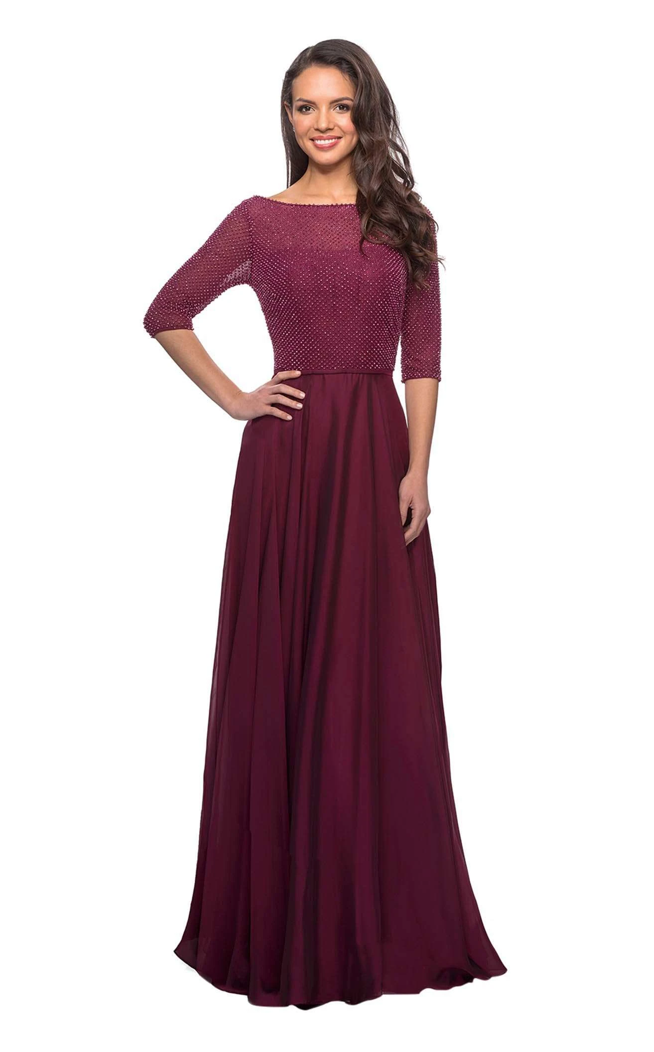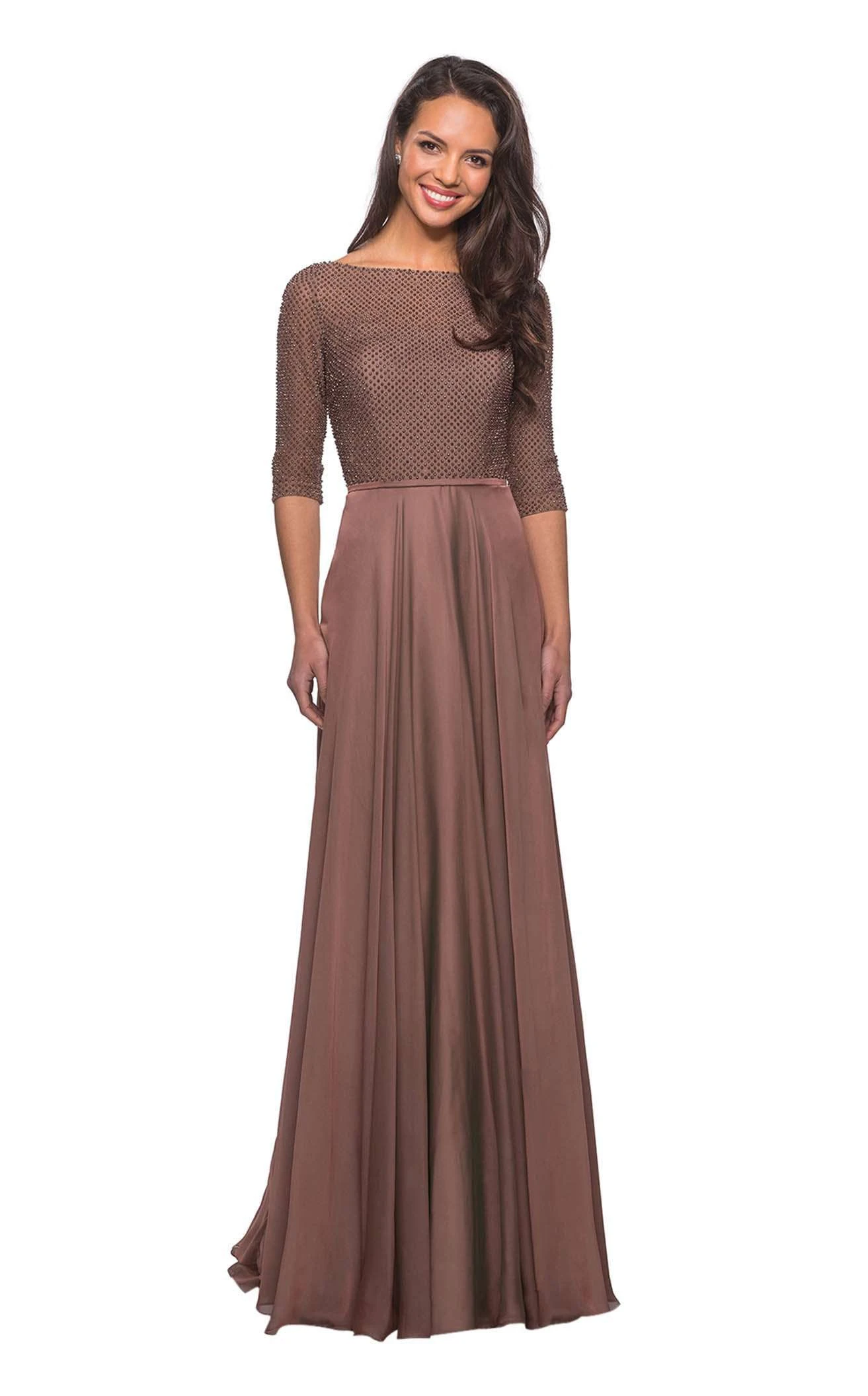 This lovely dress from La Femme 25011 is a graceful gown to wear in casual parties for a dance. Its fitted bodice is sumptuously beaded and has a bateau neckline paired with 3/4 sleeves and a zippered back. The empire waist of this dress is made complete with the thin waistband that gives way to an A-line skirt ending with a sweep train.