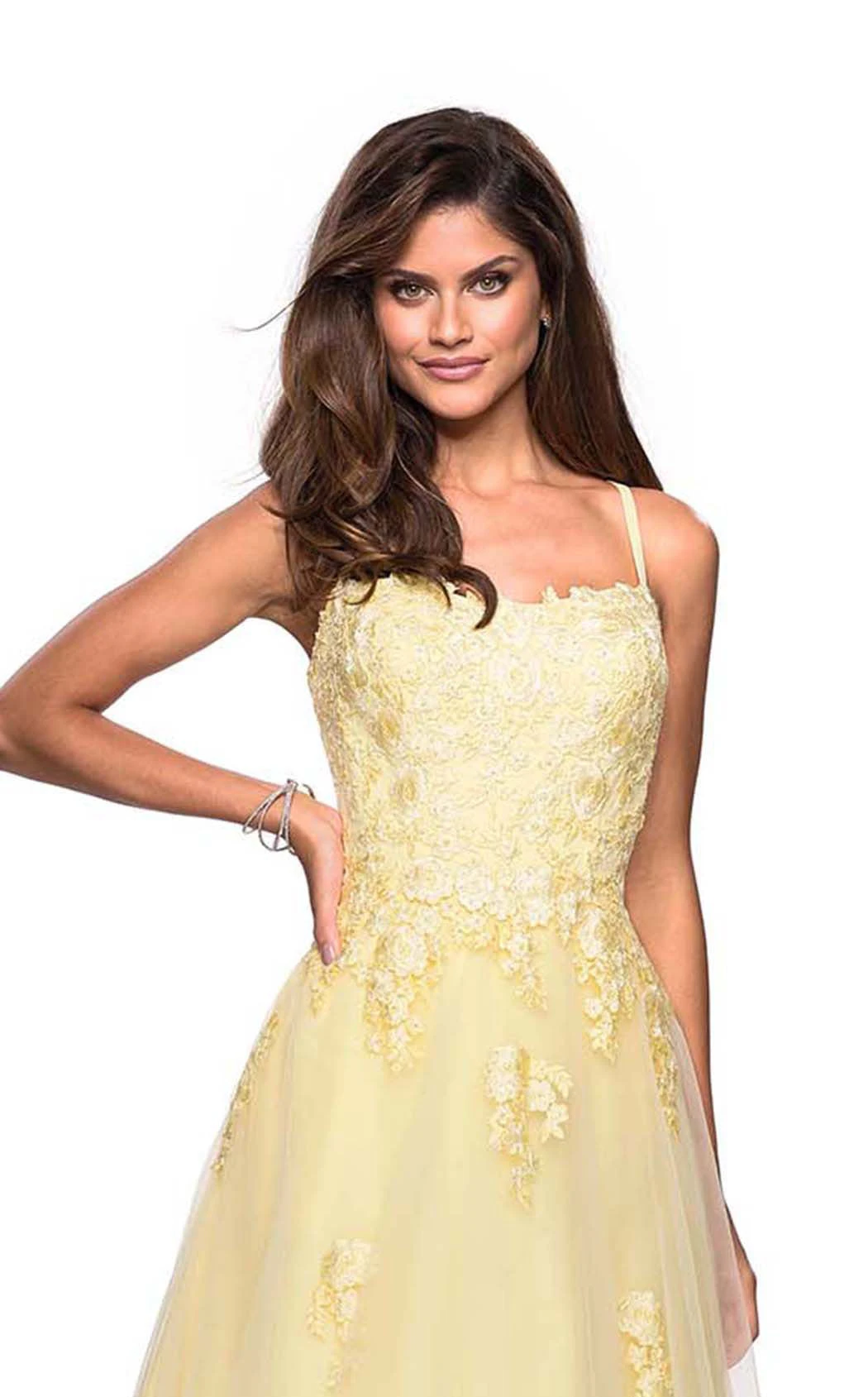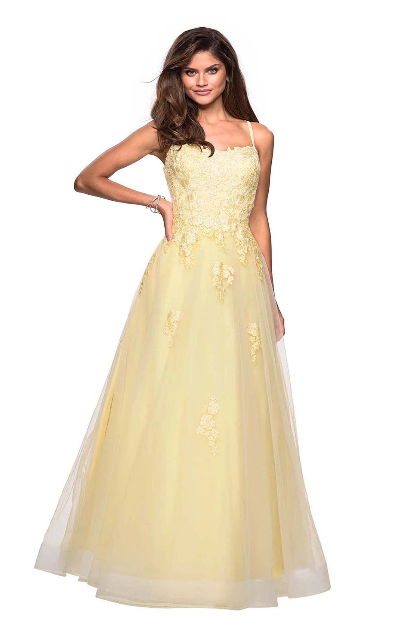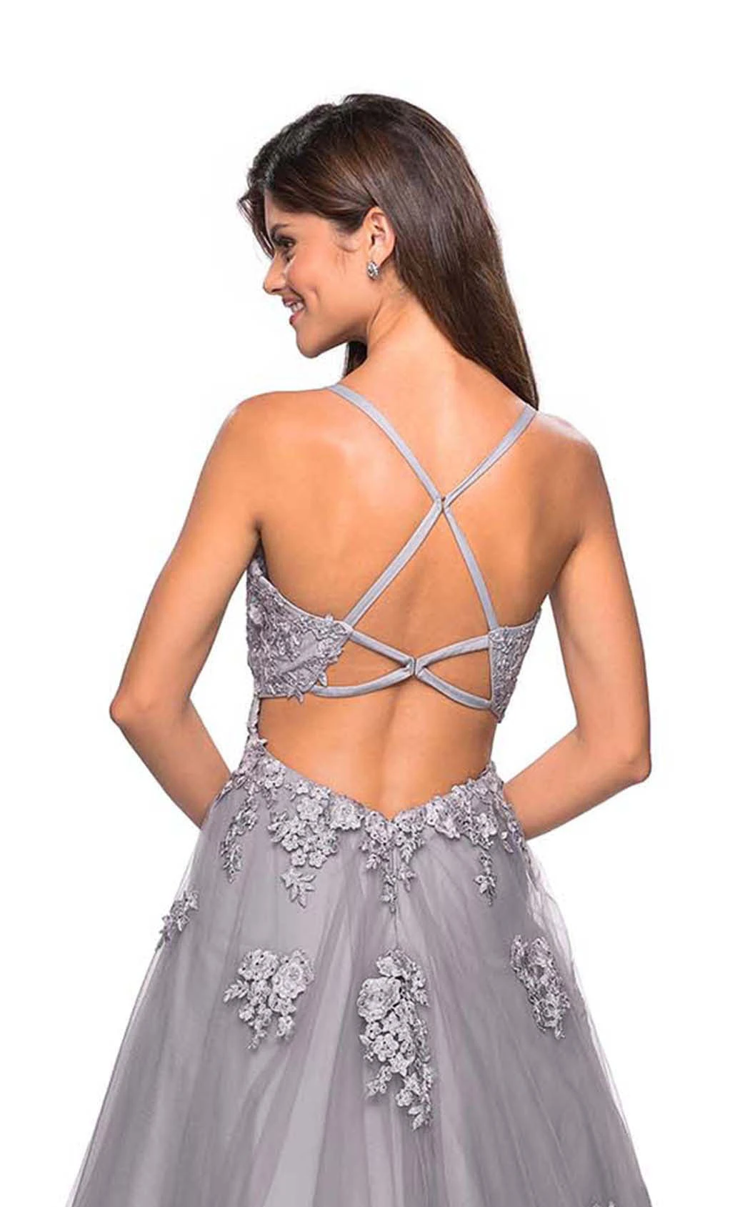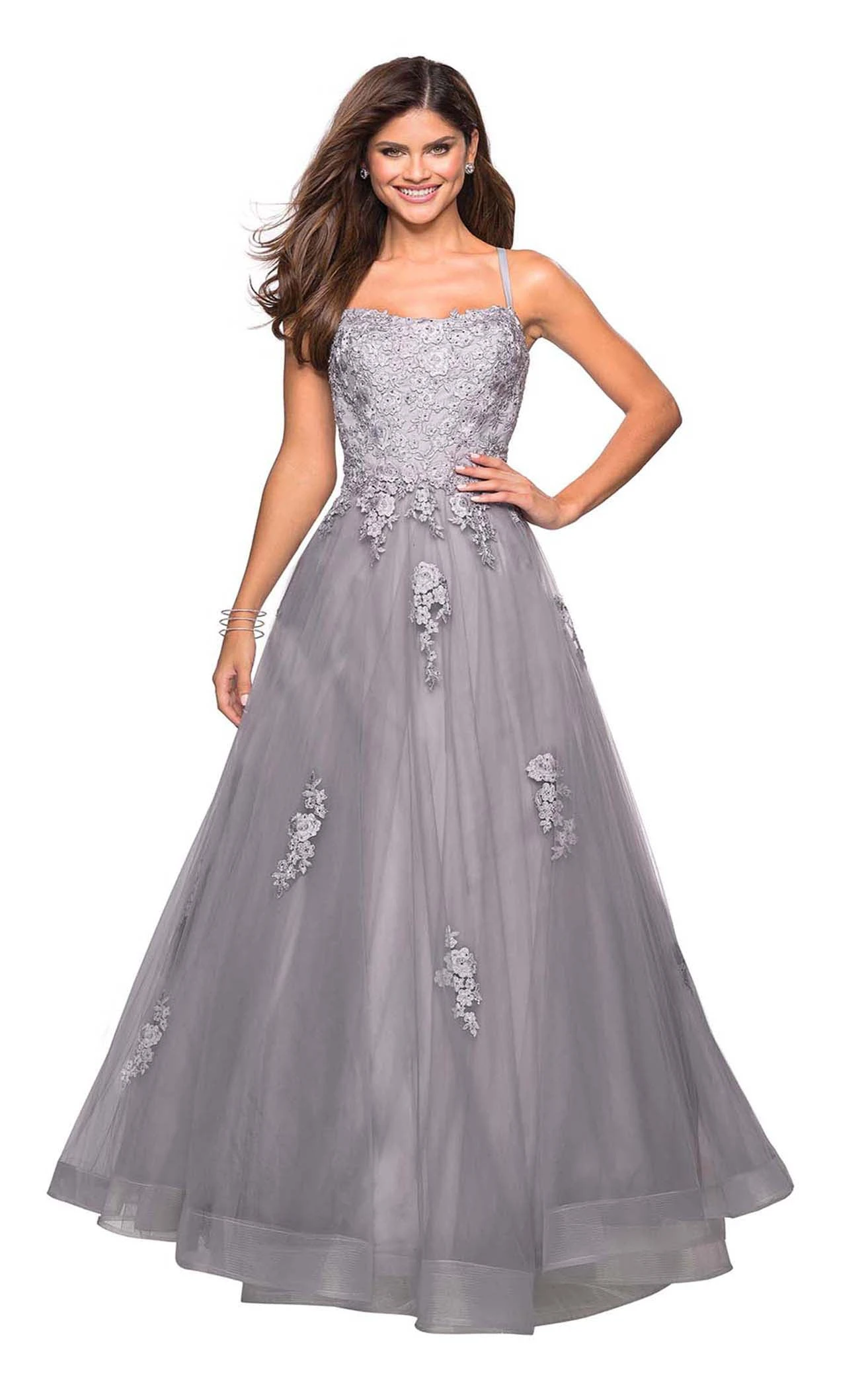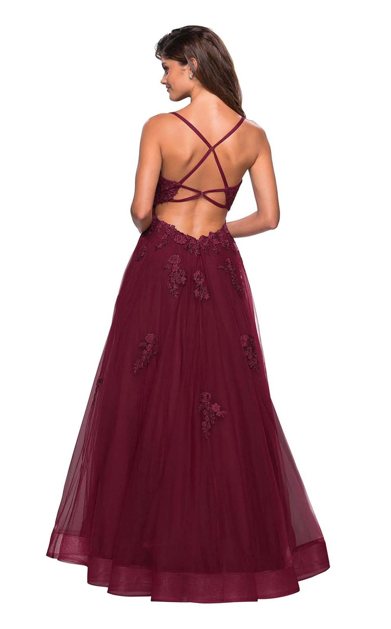 Sweetheart neck A-line gown with floral appliqued bodice by La FemmeAdorn the princess look with this breathtaking ballgown designed by La Femme. Adorned with rhinestones and floral appliques, the fitted bodice has a subtle sweetheart neckline that wraps around to a crisscross strappy back. The gown flares from the waist into an A-line silhouette tulle skirt with concealed side pockets and horsehair hemline.