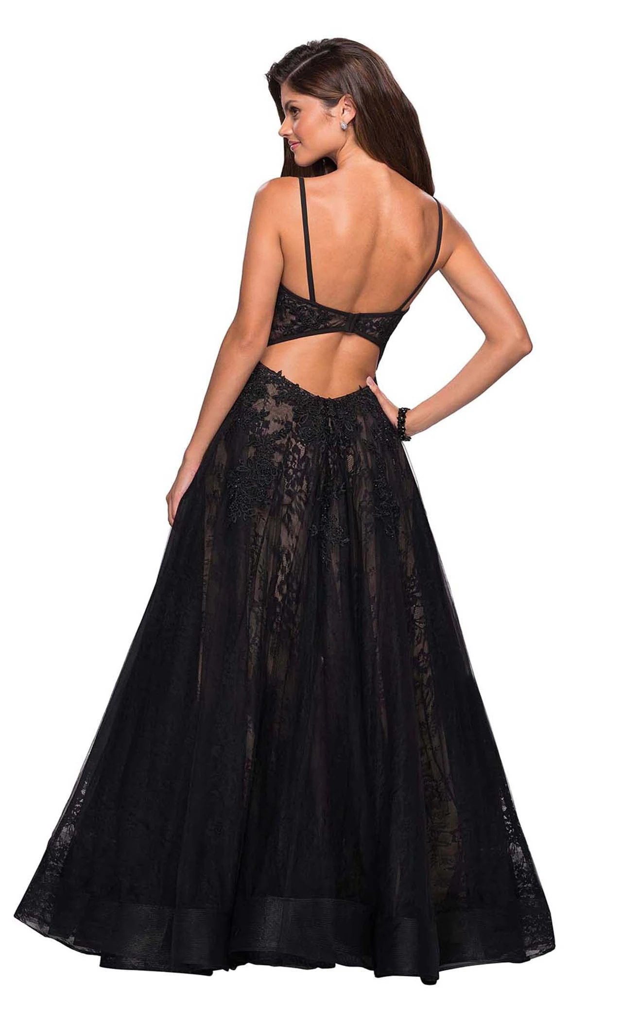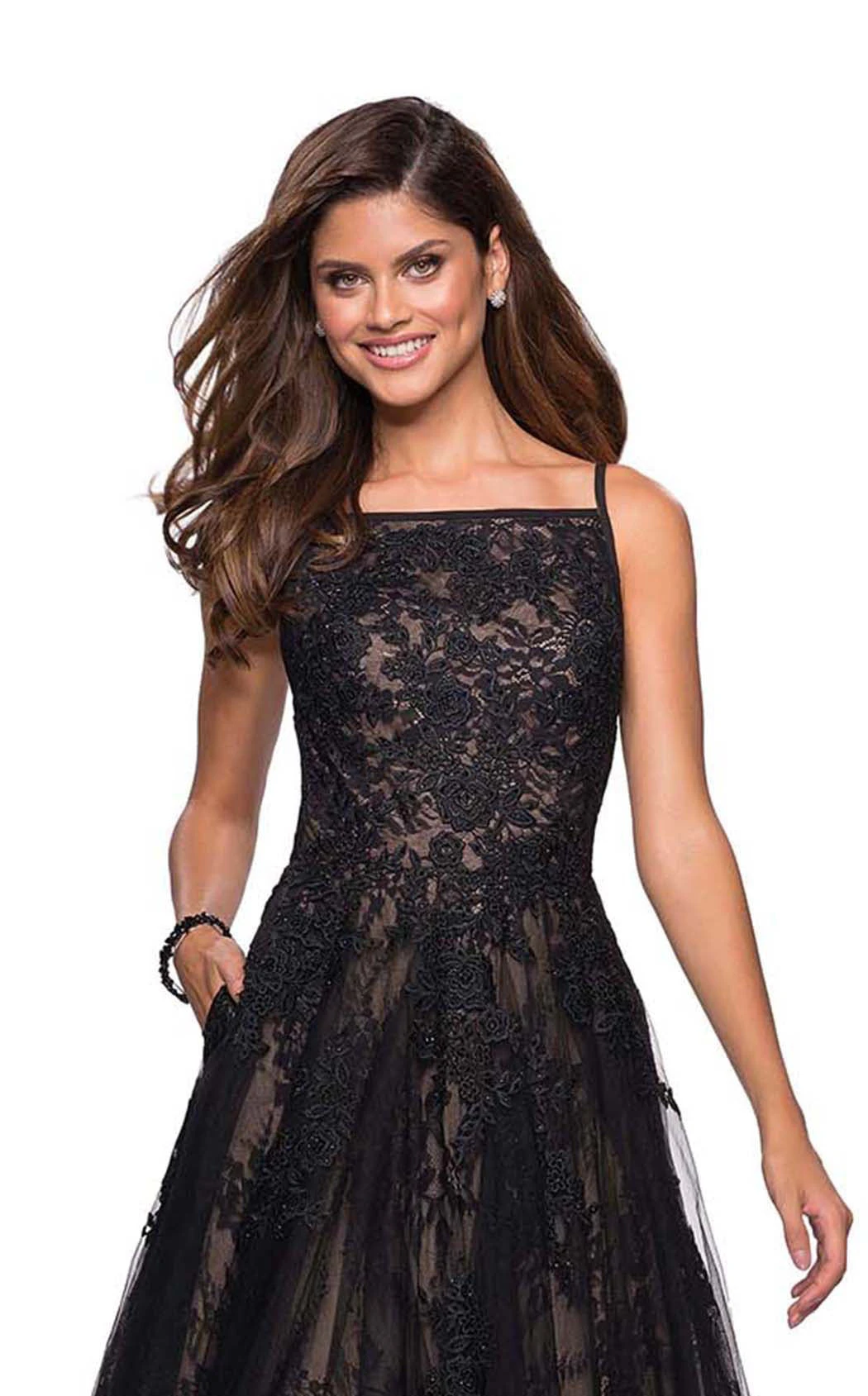Full-figured A-line gown with floral lace appliques by La FemmeShowcase a chic and sophisticated look in this long-fitted beaded dress from La Femme. The sleeveless bodice features a high straight neckline with spaghetti straps that lead to an open back with bra-style closure. Featuring floral appliques, the gown flares from the crystal waistline into a horsehair hemline.