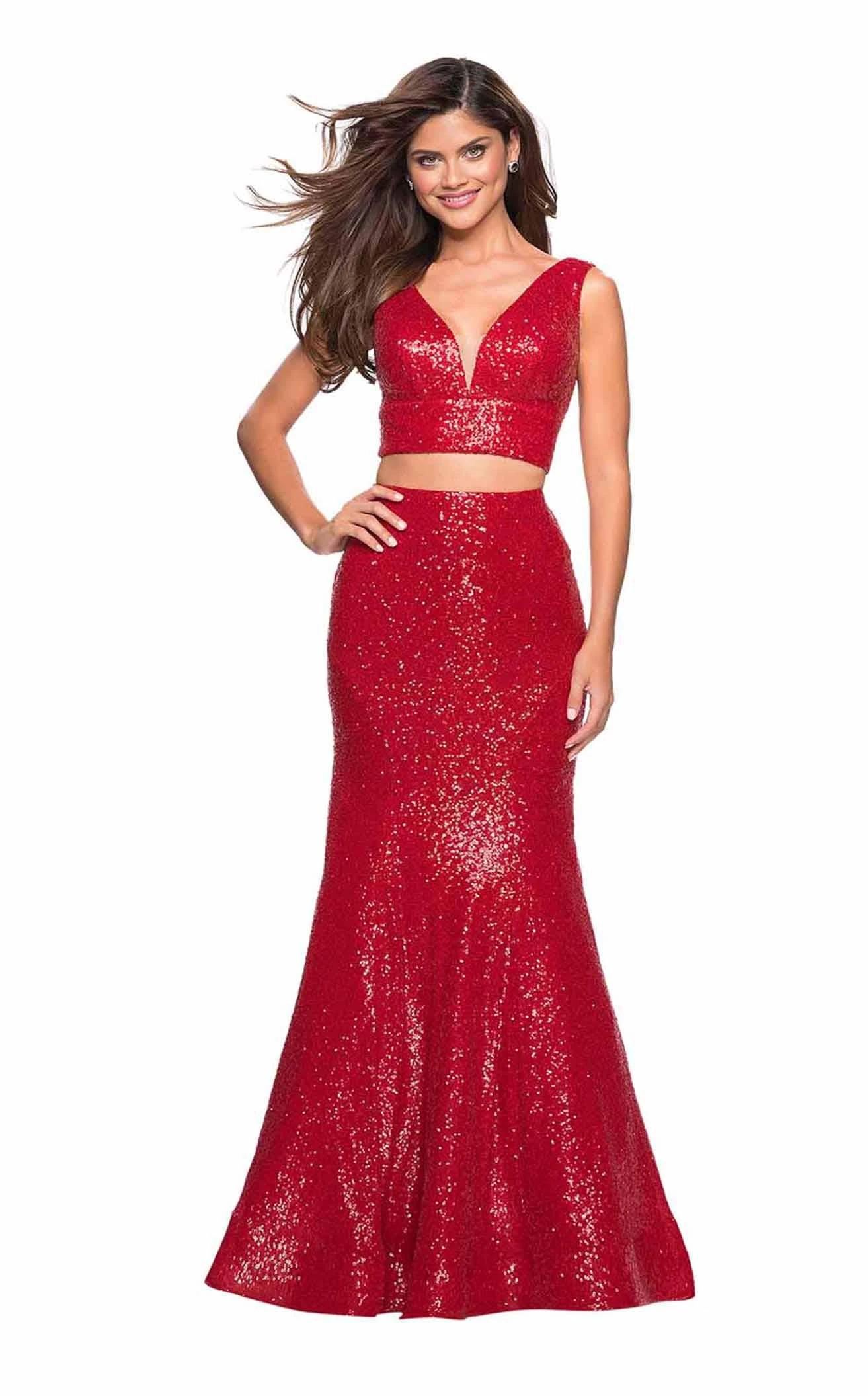 Sequined two-piece evening gown with plunging V-neckline by La FemmeTurn any evening affair in an unforgettable rendezvous in this sizzling two-piece dress designed by La Femme. Designed with shimmering sequins all around, the gown has a sheer inset plunging V-neck crop top bodice with a V-cut back. This ensemble has a fitted skirt that flares at the bottom with a trumpet silhouette and ends with a subtle sweep train.