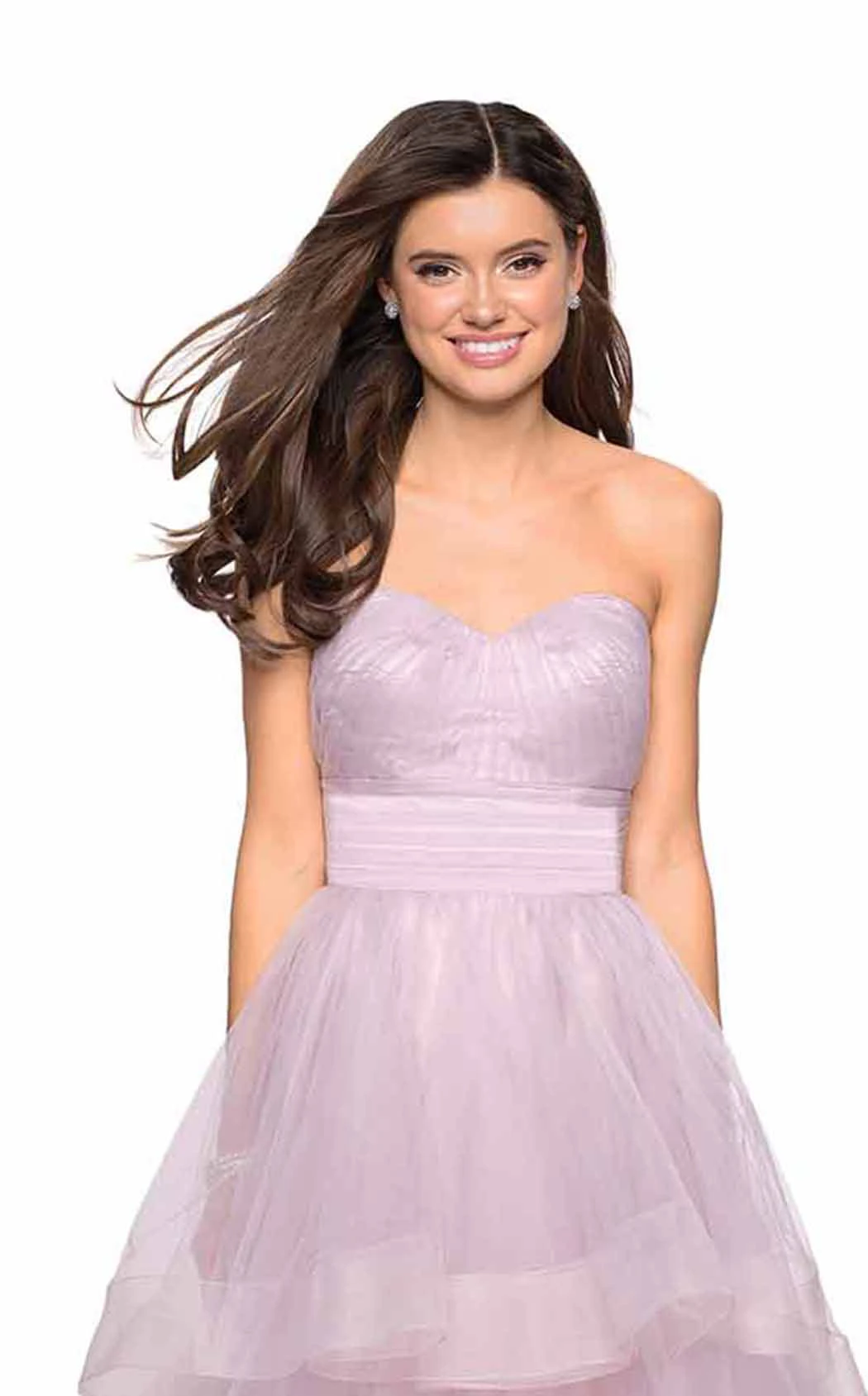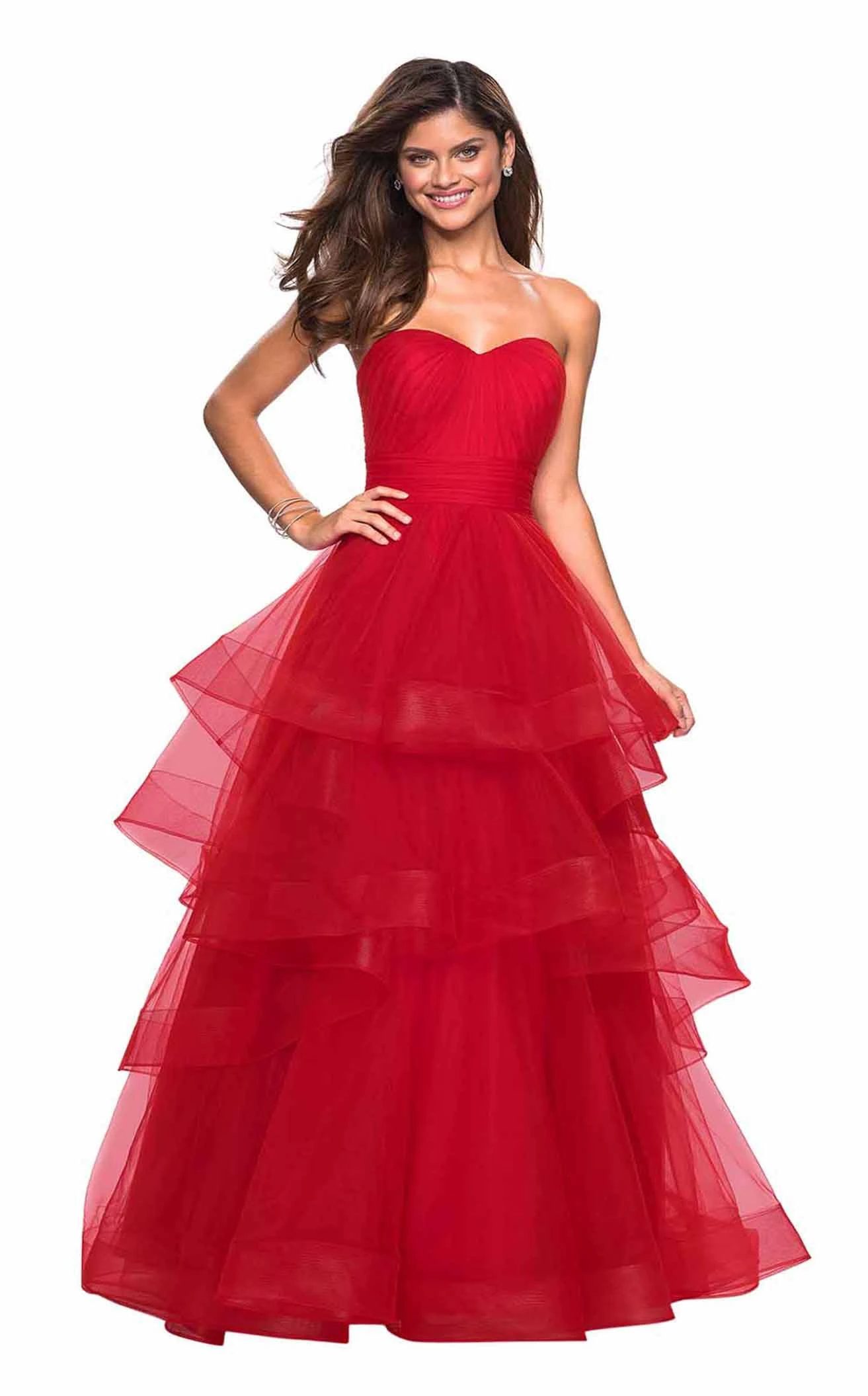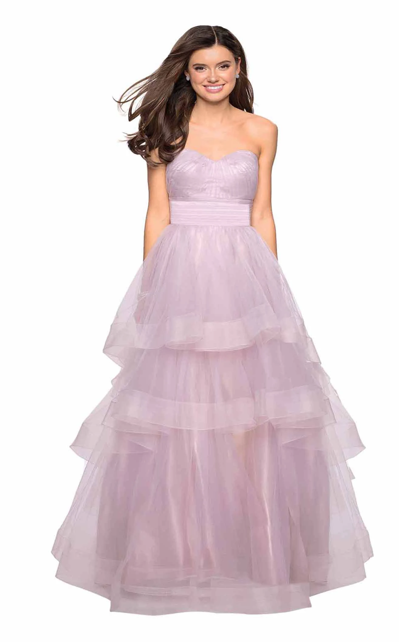 Strapless sweetheart neck A-line ballgown from La FemmeDance the night away in this graceful glitzy dress from La Femme. The fitted strapless bodice has a sweetheart neckline with ruched details and a mid-open zippered back. The A-line skirt flares from the ruched waist and flows to the floor in tiers and horsehair hem and ends with a sweep train.