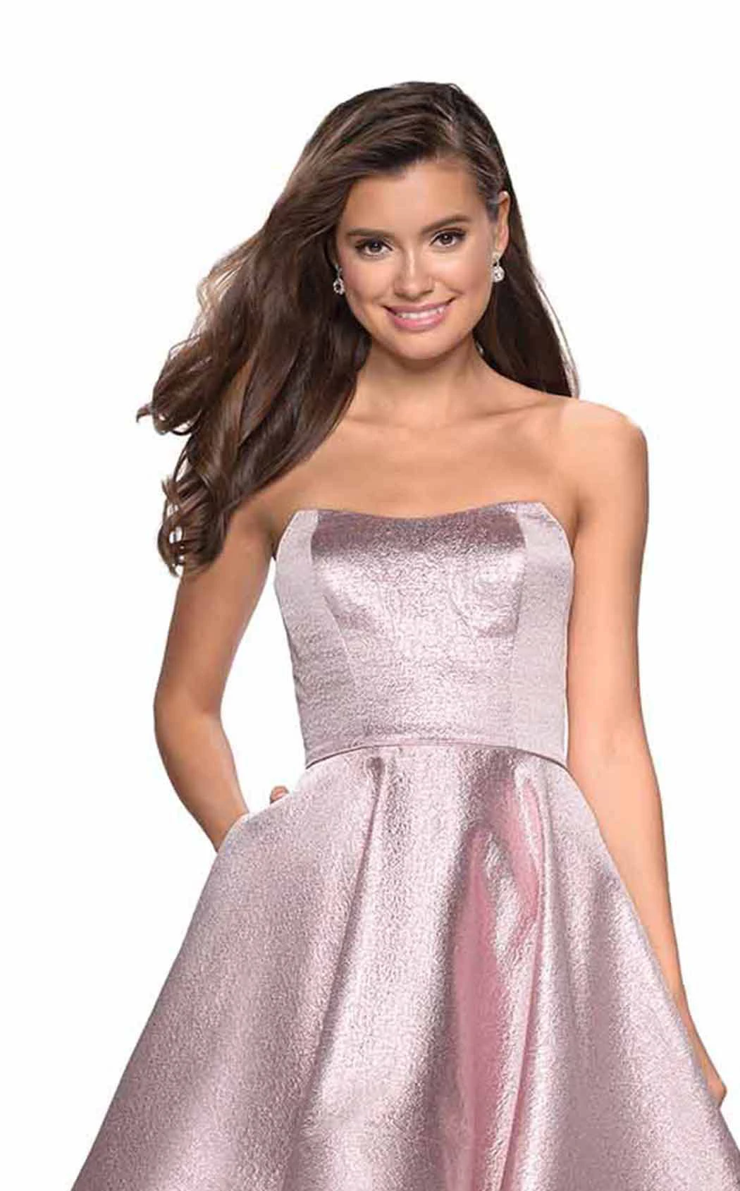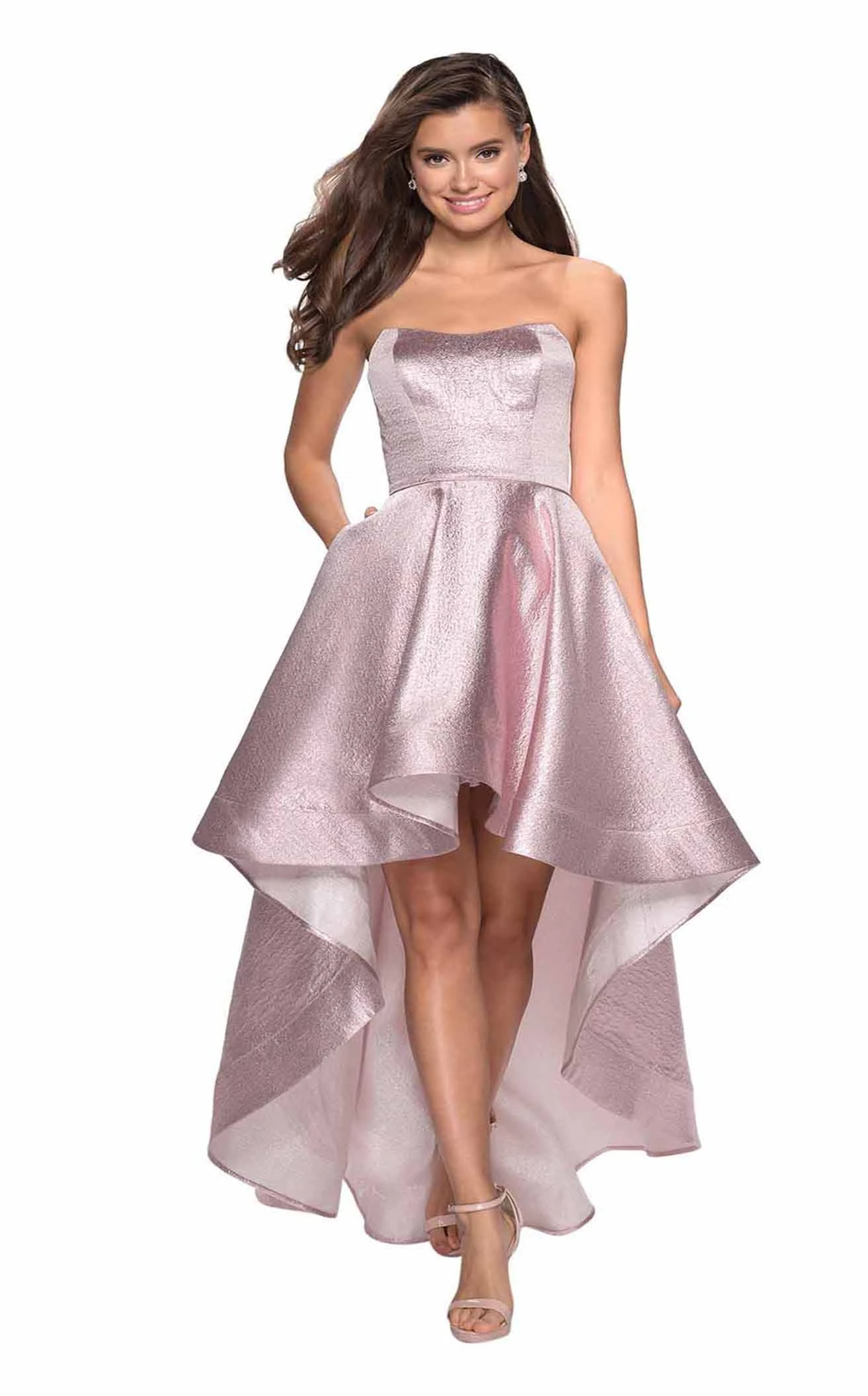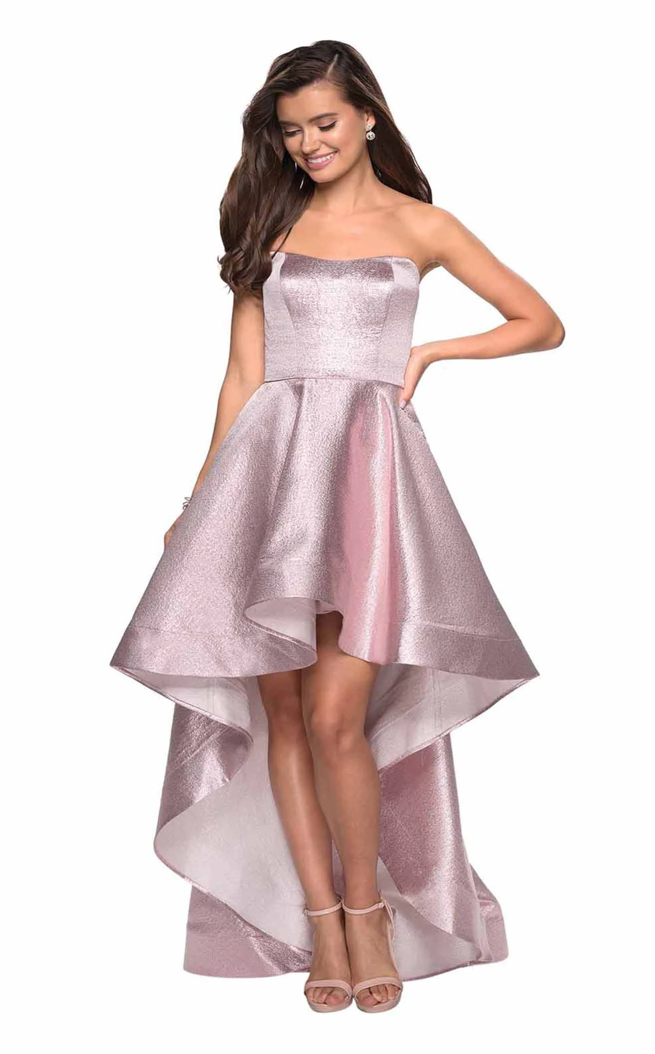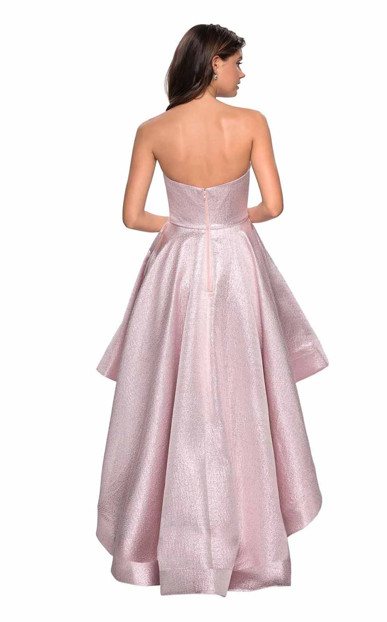 Hi-low A-line dress with a sweetheart neckline from La FemmeTurn yourself into a beautiful goddess in this creation by La Femme. The fitted bodice of this gown hugs the natural curves and has a sweetheart neckline with a mid-open zippered back. The waist makes way for a gorgeous hi-low A-line skirt with a dramatic sweep train.