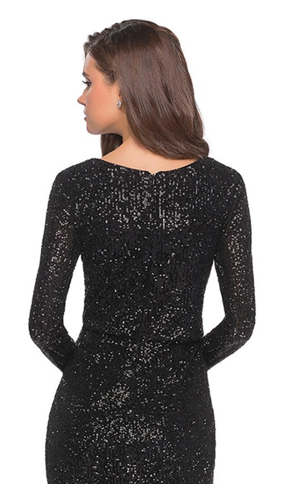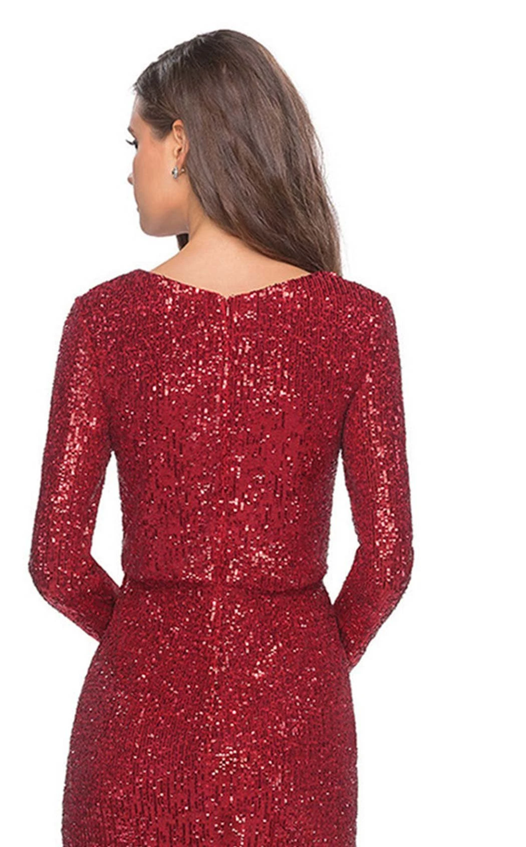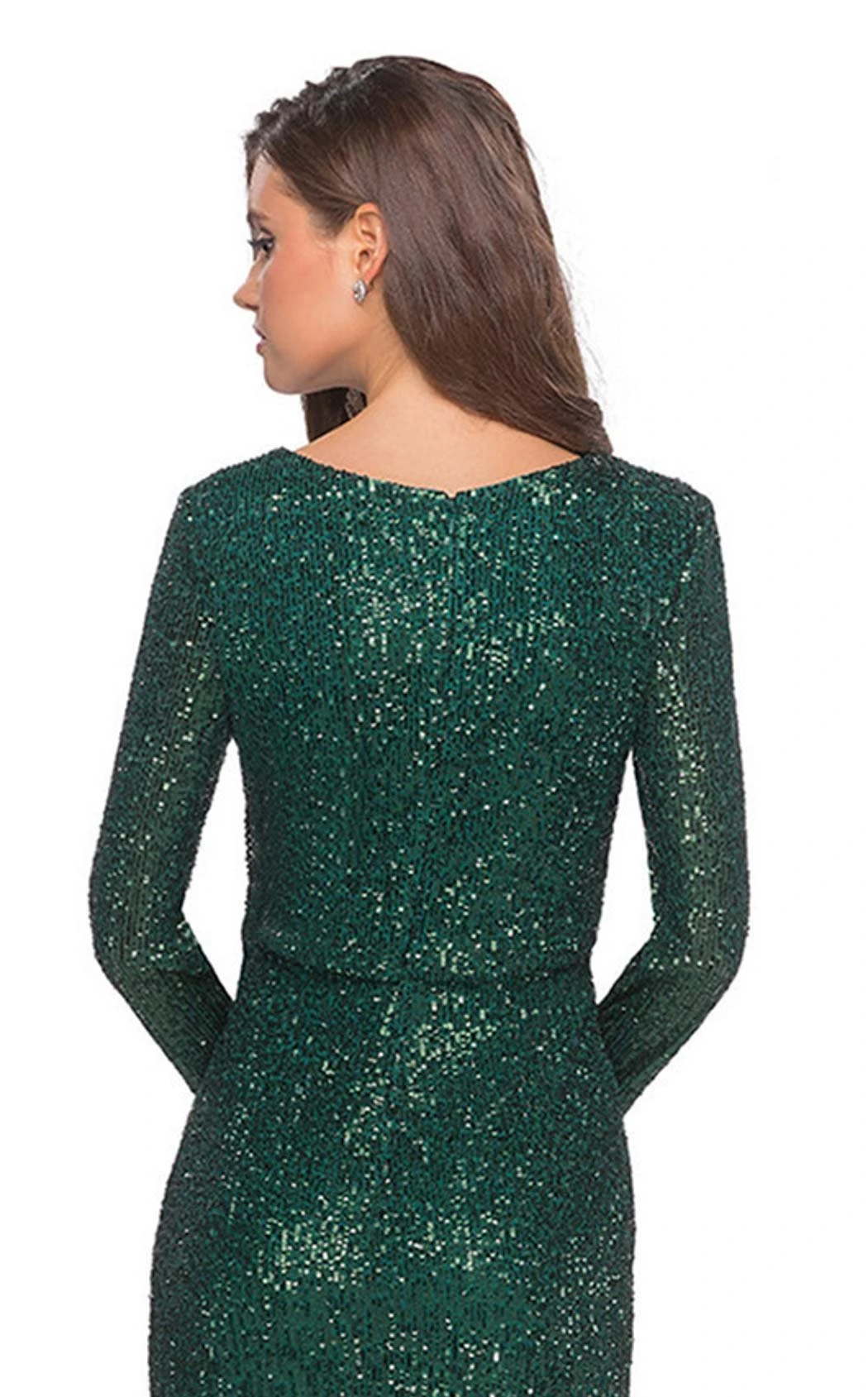 Get creative in this chic coat dress by La Femme. Long, sleek sleeves frame the deep V-neckline while wrapped styling accents a curvy fit. Soft tucks drape the bodice and hips with texture-rich accents. The wrapped skirt flows to a tony tulip hemline at a micro mini length, and an infusion of shimmer halos you in light.