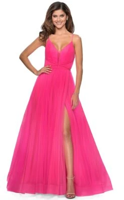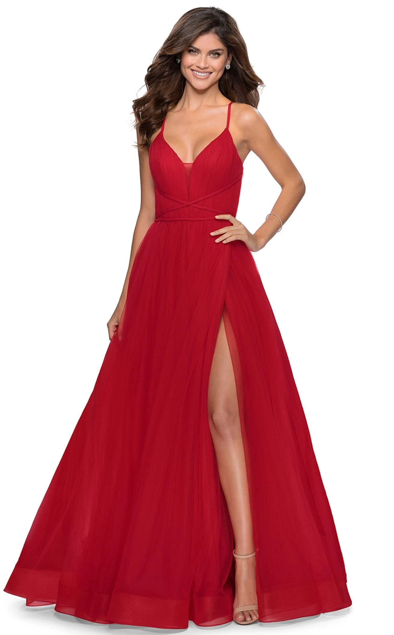 Elegant and alluring, this sophisticated dress from La Femme 28893. The gown is designed with a crisscross bodice that has a V-neckline and straps that lead to a strappy lace-up back. The long, tulle skirt flares down to the floor-length hemline in A-line silhouette that ends with a sweep train.