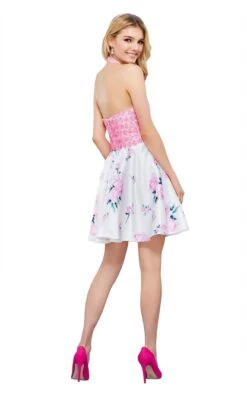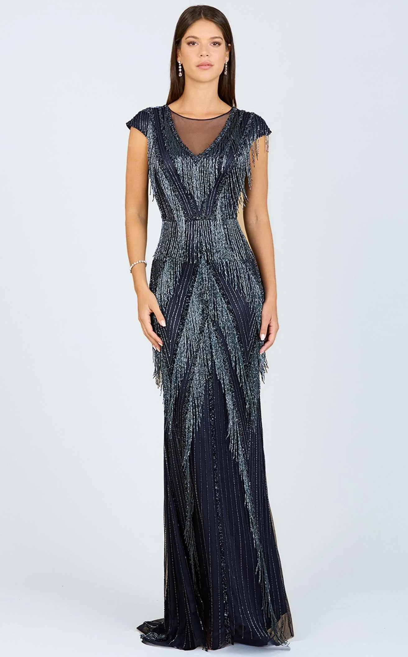 Bring a shift in your fashion with this dress by Lara 29167. The entire dress is covered with fringe lace and offers a V-neckline with the illusion of a boat-neck bodice. It has small sleeves covered with fringe lace and a natural waistline to give a shape to your body. It has a straight-line pattern skirt that dramatically falls straight to the floor and ends with a chapel.