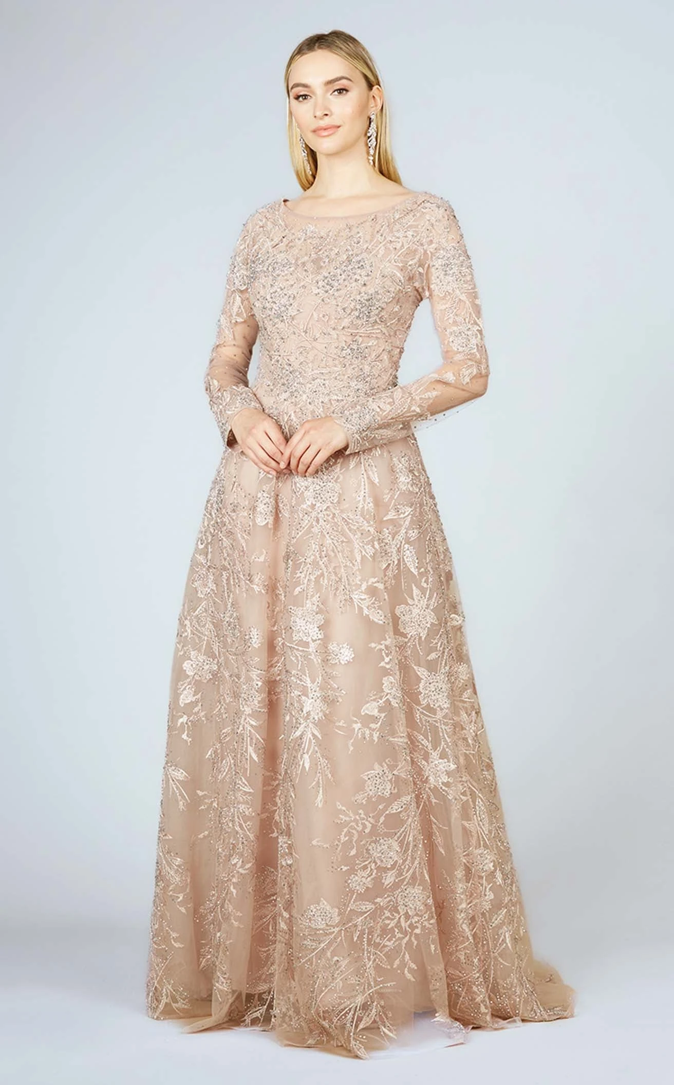 Make an eye-catching entry in this stunning ball gown designed by Lara 29240. It has a round neckline. The full-length sheer sleeves enhance the overall look of the outfit. It has a fitted bodice. The natural waistline follows a full-length A-line flowy silhouette and a swirl sweep. The dress is embellished with crystal beads and lace appliques.