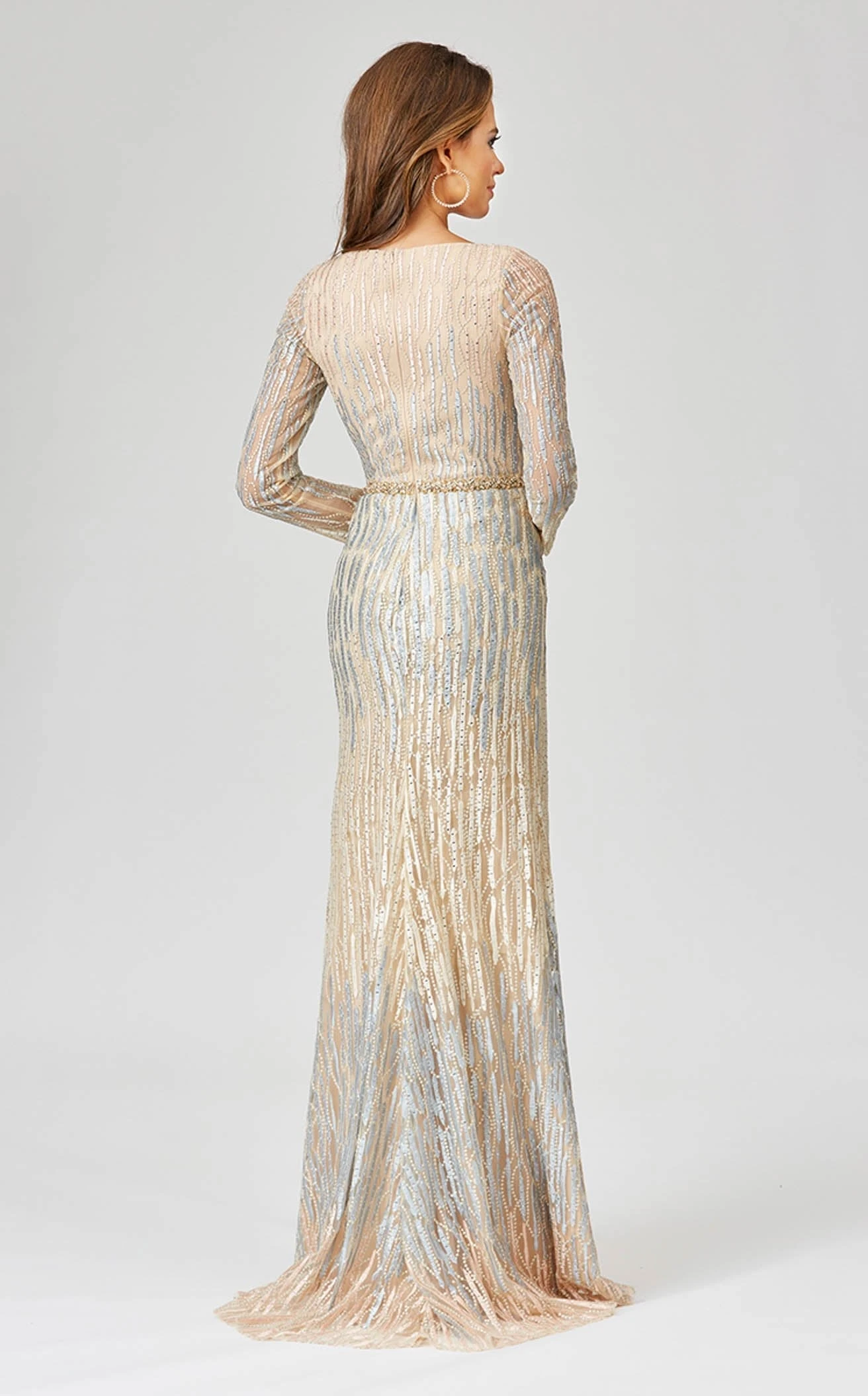 Look absolutely wonderful in Lara 29467 Dress. This lovely piece features a column silhouette and glittering accents. The long sleeve bodice has a v-neck neckline and a natural waist.
