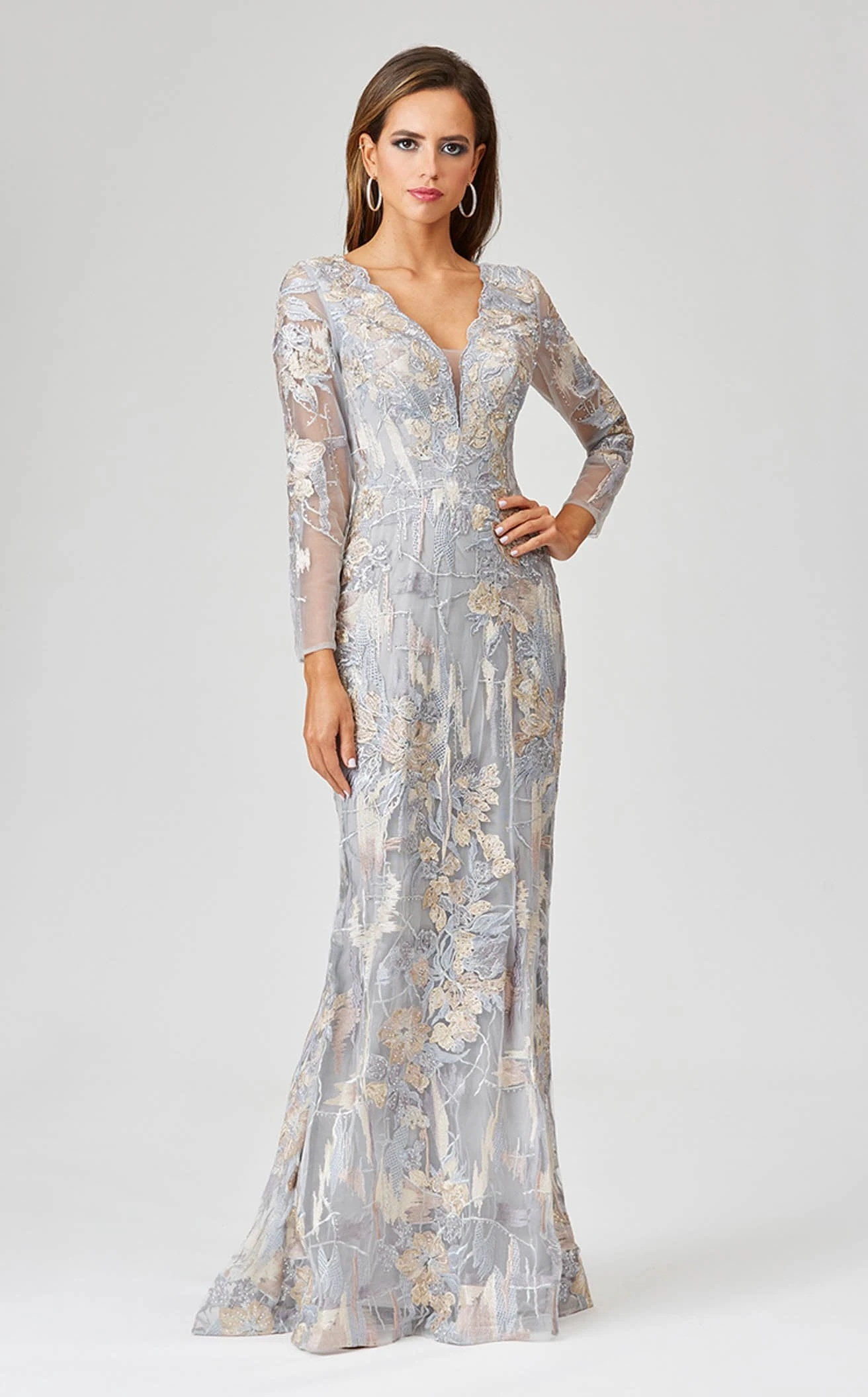 Look absolutely divine in Lara 29468 Dress. This exquisite piece features a column silhouette and glittering accents. The long sleeve bodice has a v-neck neckline and a natural waist.