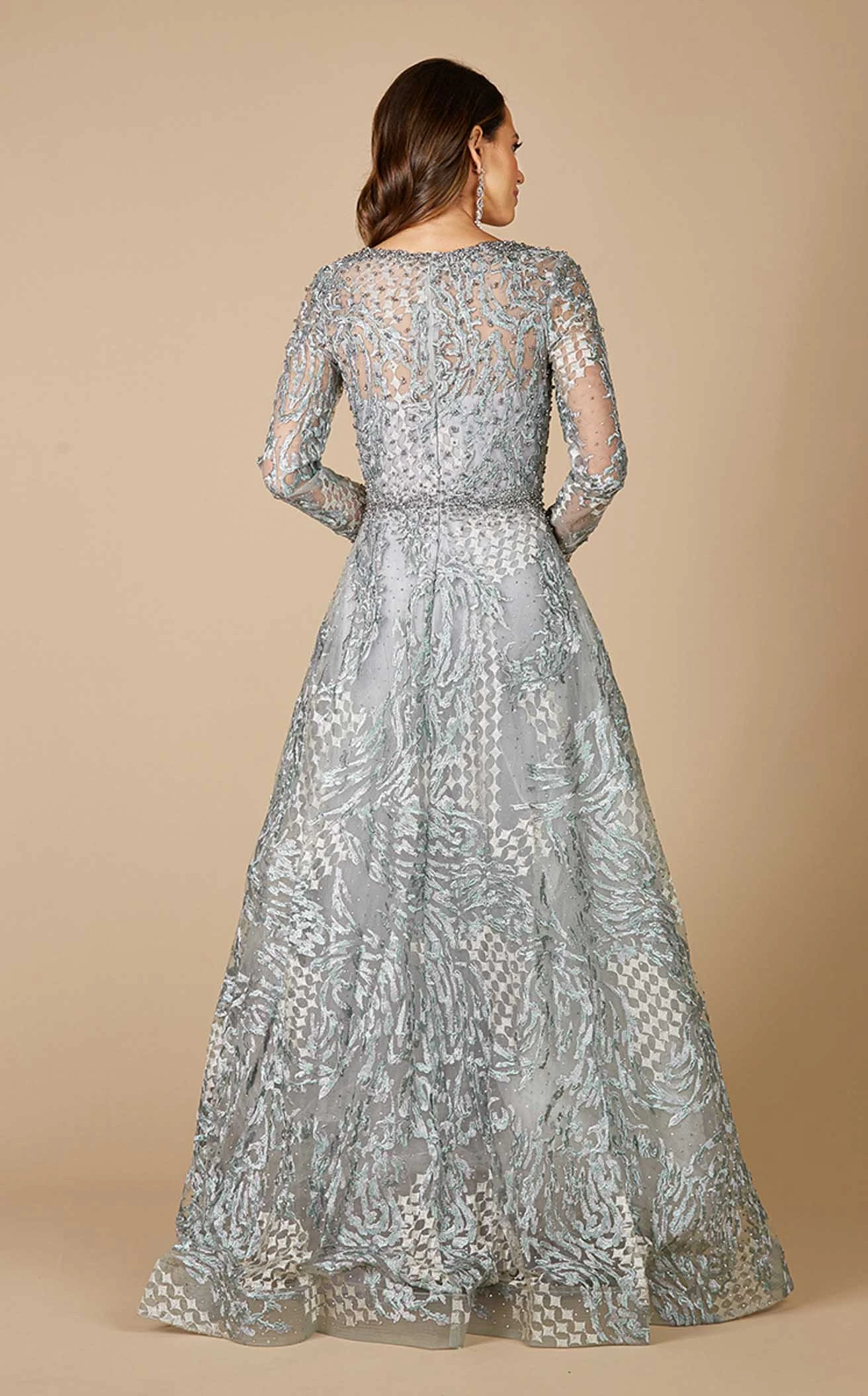 Wear this Lara ballgown to get that glamorous feeling. In a lace appliqued and beaded bodice, this long sleeve, lacy gown features a plunging V-neckline. This dress has an A-Line silhouette and a full back with a back zipper closure. At your next event, this stunning gown would be the center of attention.