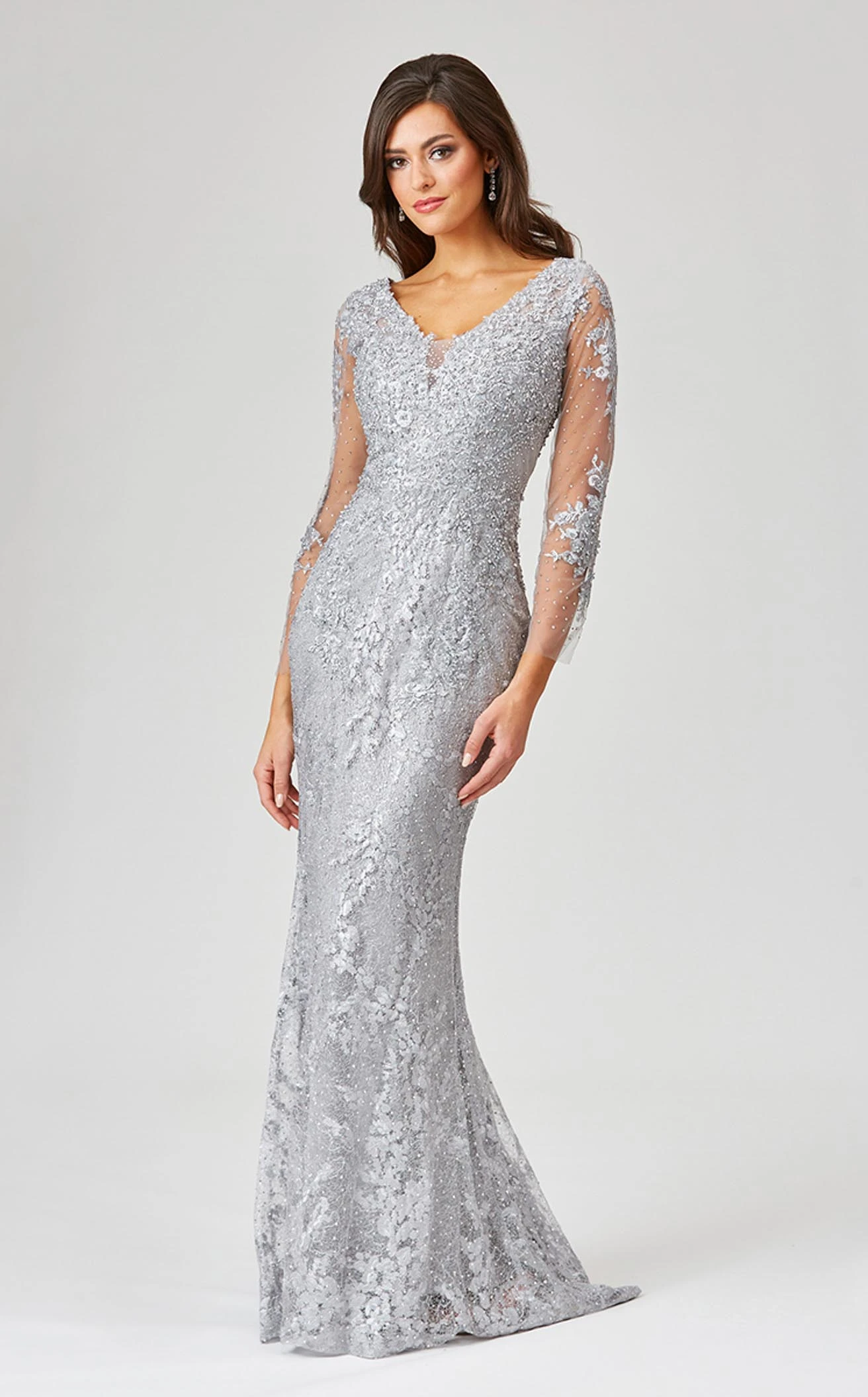 Look absolutely pretty in Lara 29473 Dress. This marvelous piece features a column silhouette and glittering accents. The long sleeve bodice has a v-neck neckline and a natural waist.