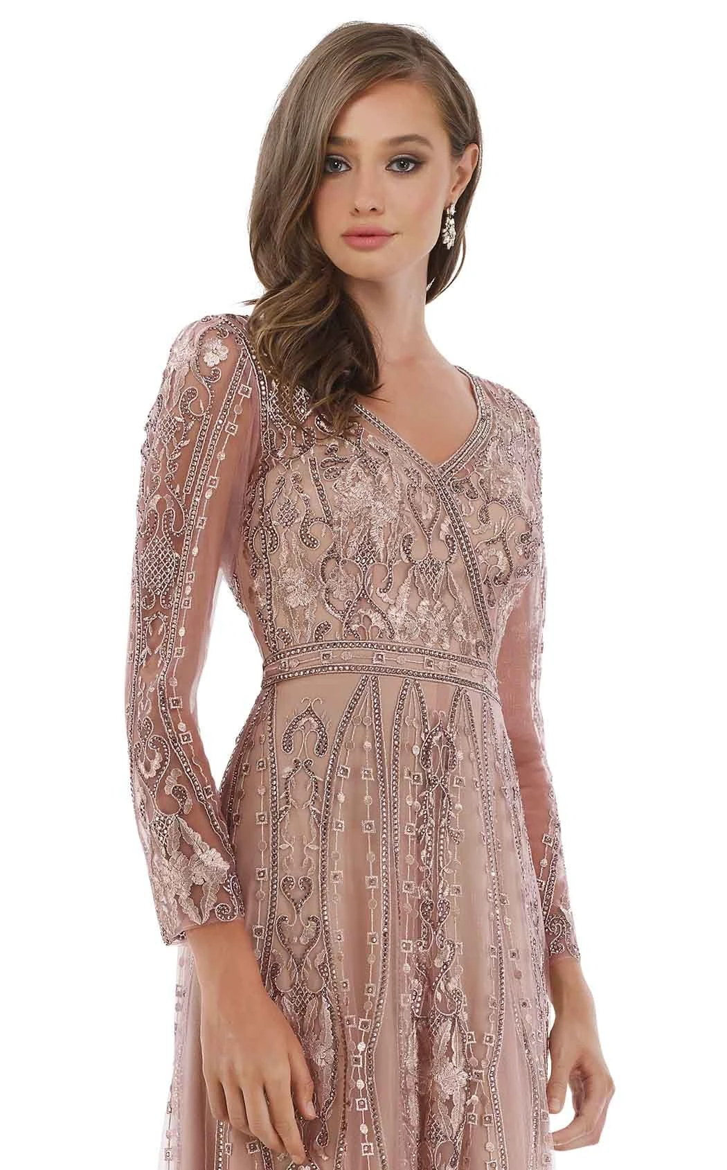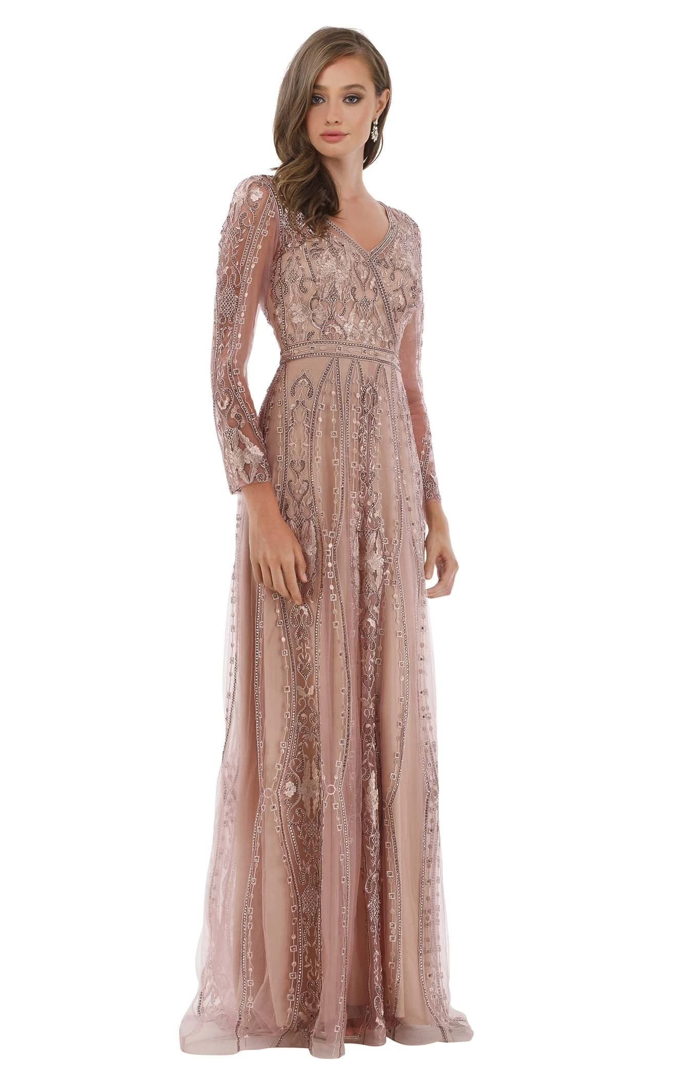 Divine long-sleeved evening gown with crossover bodice by Lara