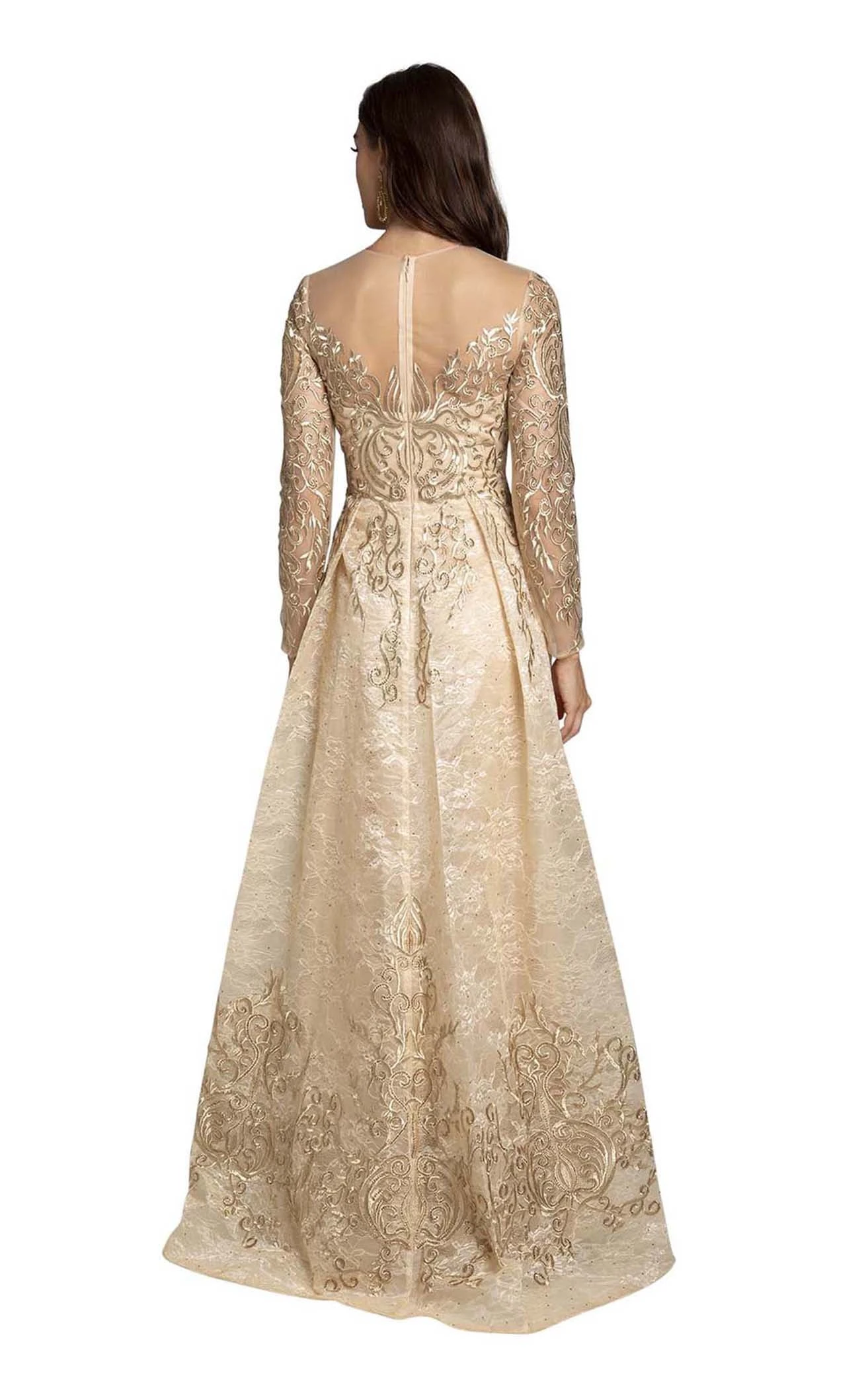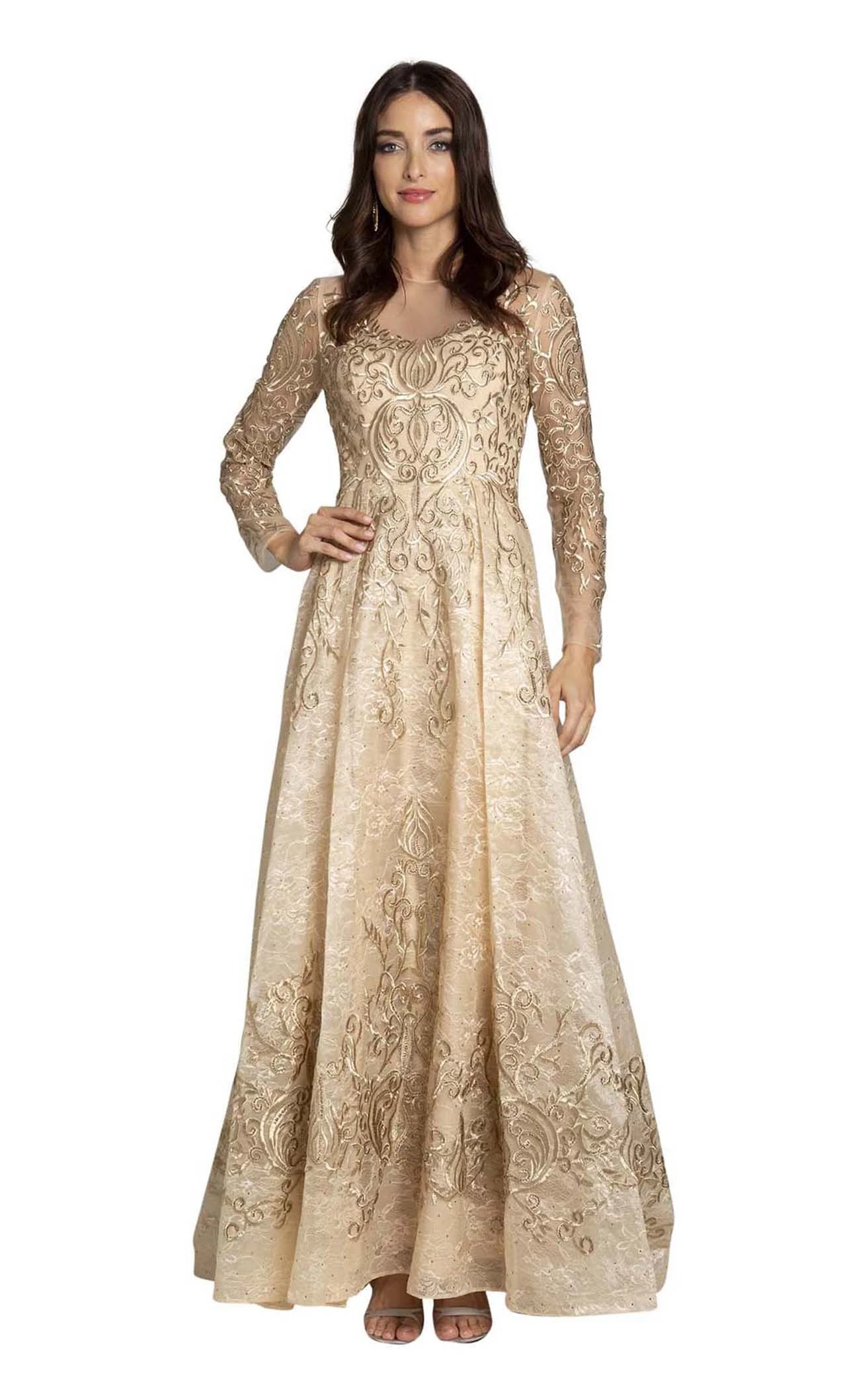 The sophisticated style of this gown from Lara 29856 makes heads turn at the party. The fitted bodice is accented with an illusion high neckline that leads to an illusion zippered back and long sleeves. Embellished with rhinestones and lace appliques, the skirt flows from the waistline in a softly pleated A-line silhouette with a slight sweep train.