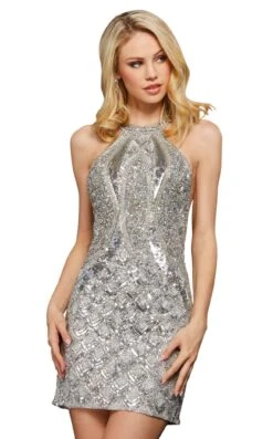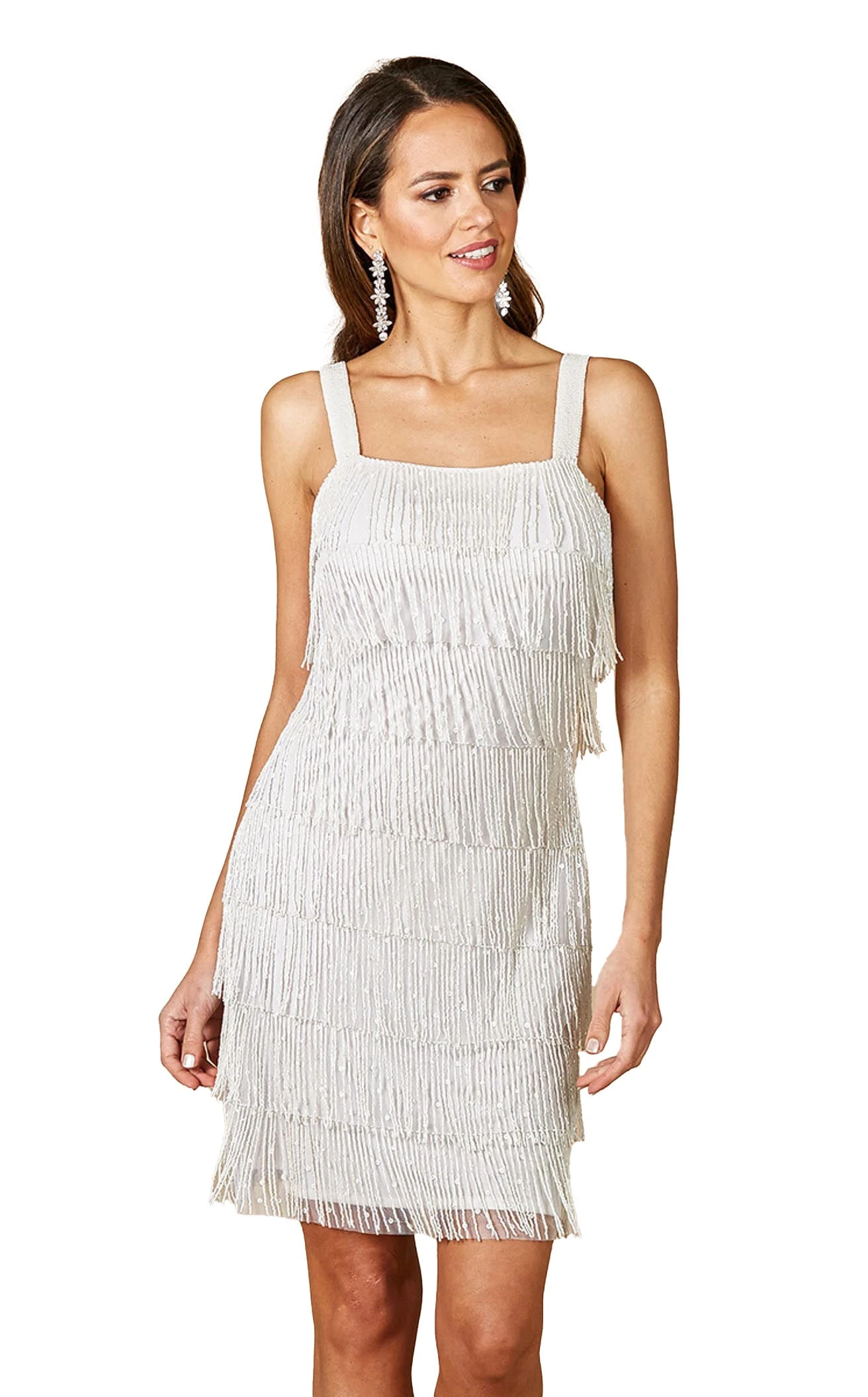 Get a tony take on Roaring 20s style in this flapper-fashioned short formal by Lara. Wide shoulder straps debut the straight neckline while trim lines trace a curve-skimming fit from the bust through the hips. Shimmering beaded fringe tiers along the bodice and skirt, shedding sparks of light with every move you make, and the sheer-edged hemline makes a short finish.